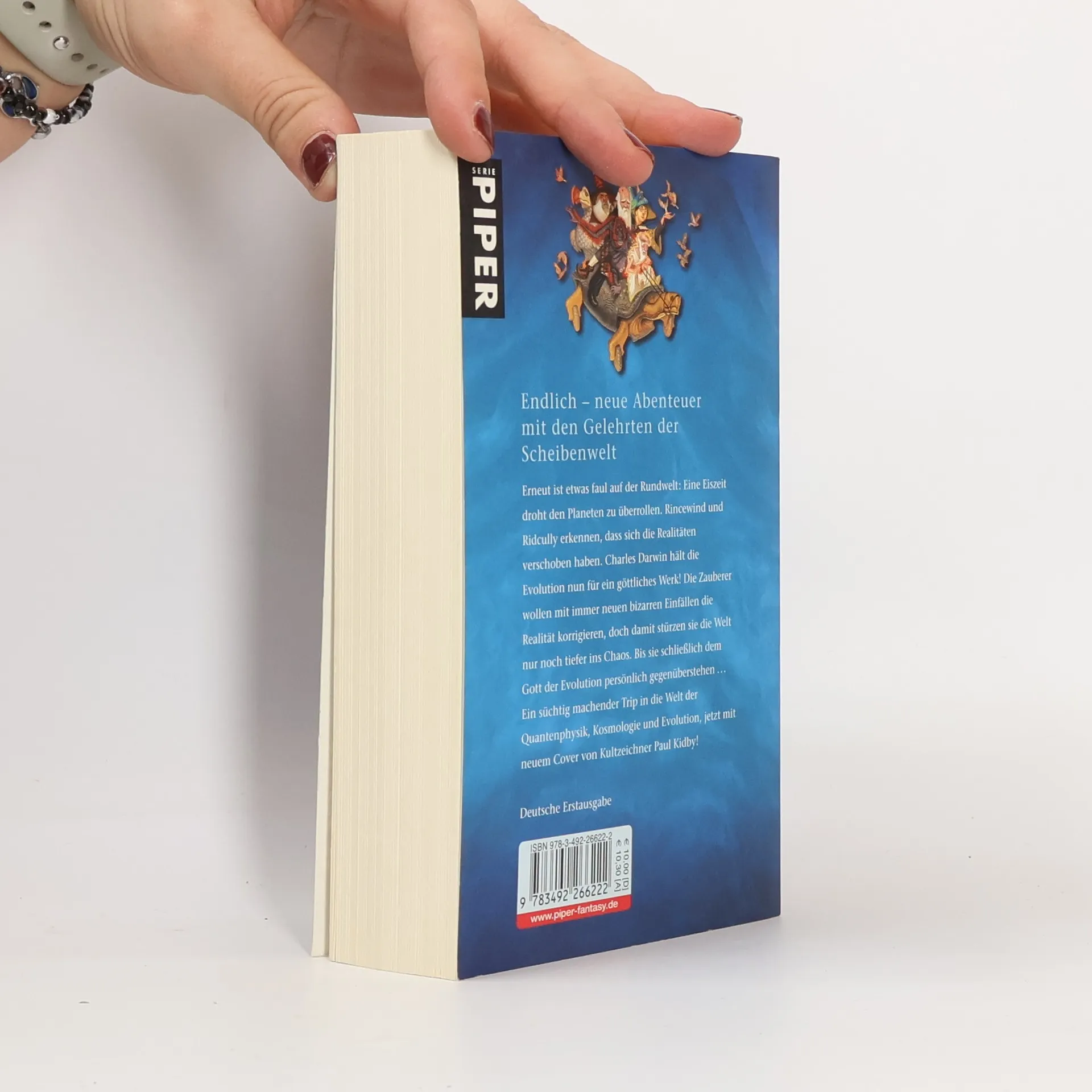Erneut ist etwas faul auf der Rundwelt: Eine Eiszeit droht den Planeten zu überrollen, doch die Menschen machen keine Anstalten, ihre Welt zu verlassen. Rincewind und Ridcully erkennen, dass sich die Realitäten verschoben haben: Charles Darwin hält die Evolution nun für ein göttliches Werk! Die Zauberer versuchen, mit immer neuen bizarren Einfällen die Realität zu korrigieren, doch damit stürzen sie die Welt nur noch tiefer ins Chaos. Bis sie schließlich dem Gott der Evolution persönlich gegenüberstehen … Ein süchtig machender Trip in die Welt der Quantenphysik, Kosmologie und Evolution auf der bizarren Scheibenwelt.