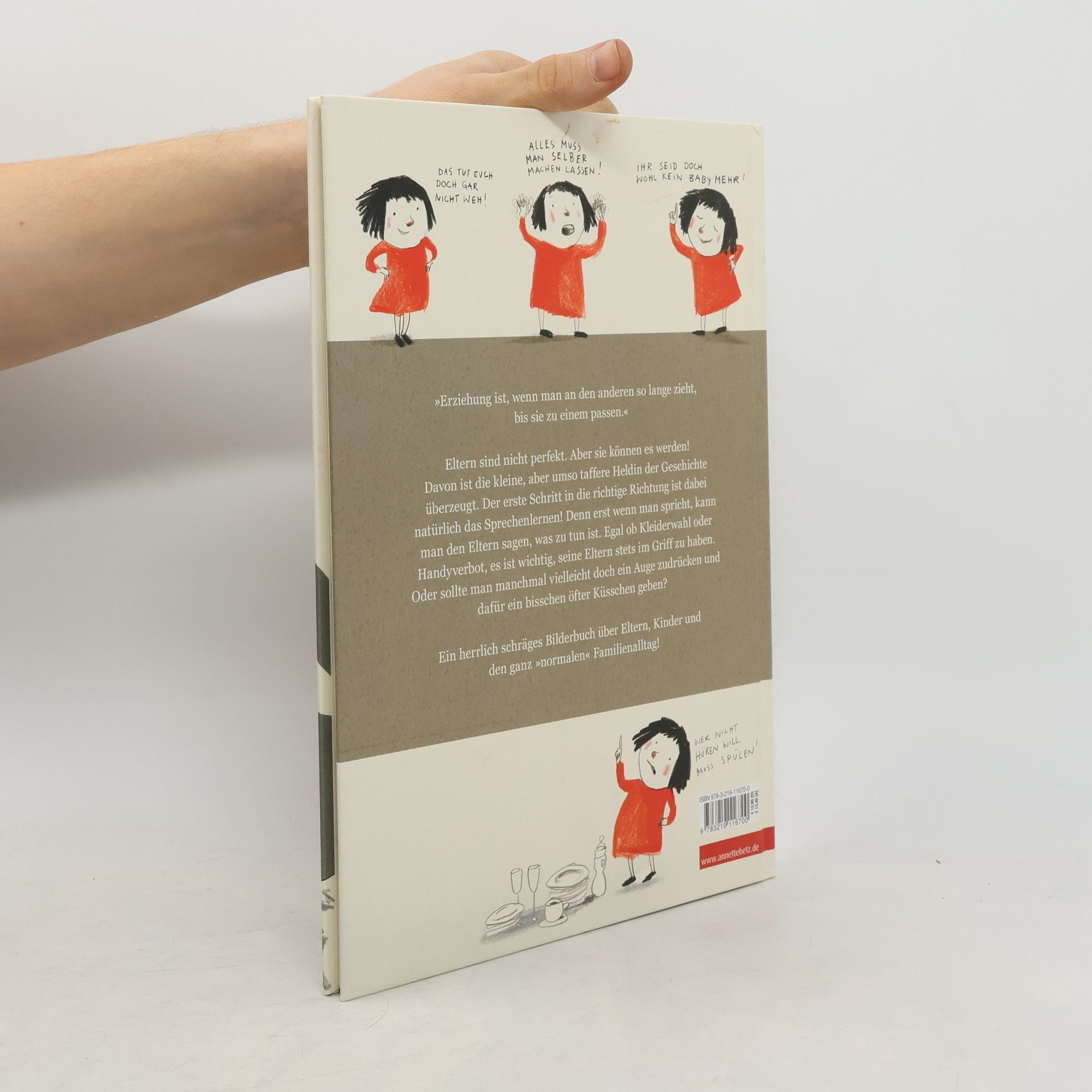 ELTERN MIT GEDULD ERZIEHEN Eltern sind nicht perfekt, das wissen wir alle! Deshalb ist es umso wichtiger, ihnen die Grundregeln des Familienlebens beizubringen. Der erste Schritt in die richtige Richtung ist dabei natürlich das Sprechenlernen! Denn erst wenn man spricht, kann man den Eltern sagen, was zu tun ist! Egal ob Kleiderwahl oder Handyverbot, es ist wichtig, seine Eltern stets im Griff zu haben. Oder sollte man manchmal vielleicht doch ein Auge zudrücken und dafür ein bisschen öfter Küsschen geben. Dies alles zeigt die kleine aber umso taffere Protagonistin mit vielen guten Tipps und Tricks. Ein herrlich schräges Bilderbuch über Kinder, Eltern und den ganz 'normalen' Familienalltag!