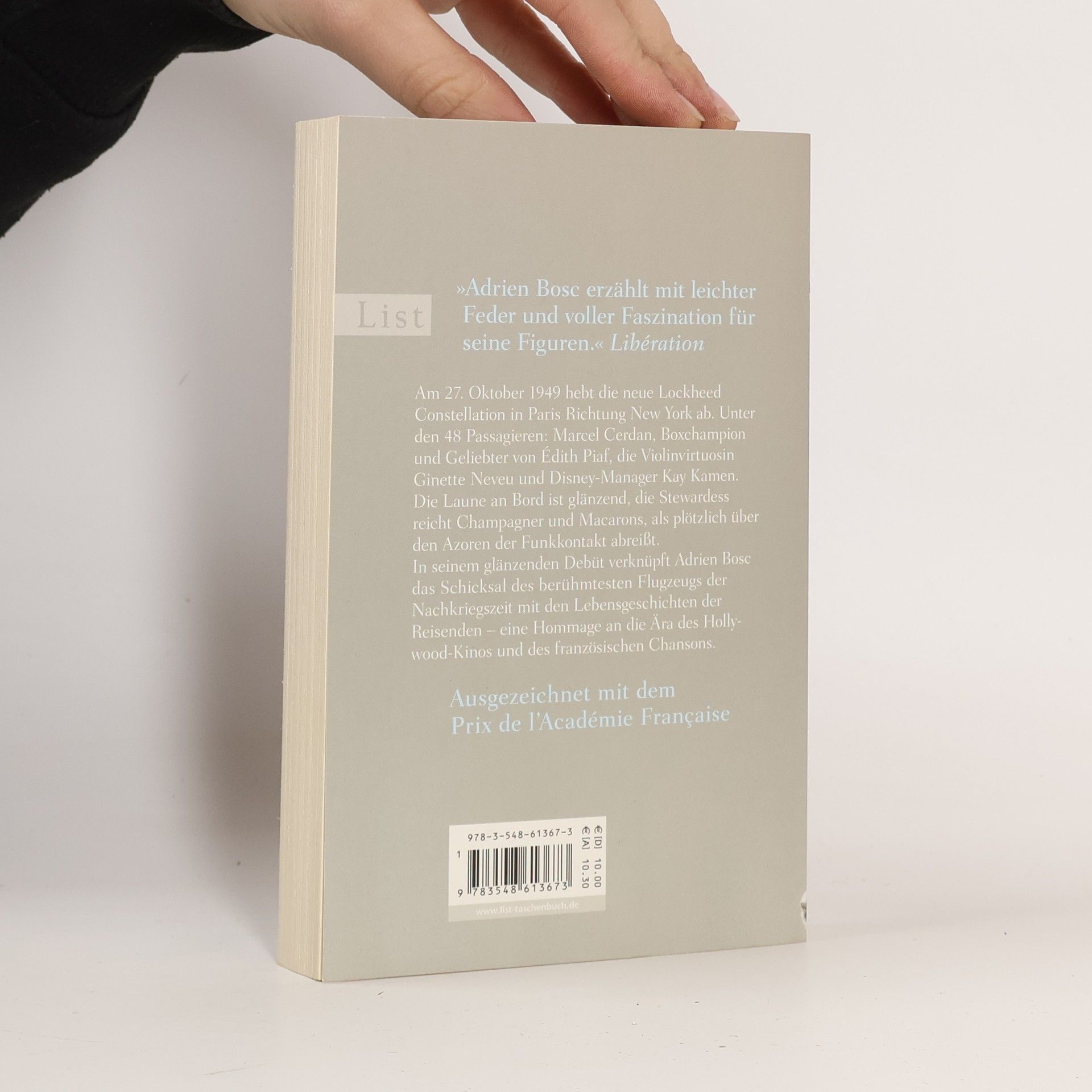 Am 27. Oktober 1949 hebt die neue Lockheed Constellation in Paris Richtung New York ab. Unter den 48 Passagieren: Marcel Cerdan, Boxchampion und Geliebter von Édith Piaf, die Violinvirtuosin Ginette Neveu und Disney-Manager Kay Kamen. Die Laune an Bord ist glänzend, die Stewardess reicht Champagner und Macarons, als plötzlich über den Azoren der Funkkontakt abreißt. In seinem glänzenden Debüt verknüpft Adrien Bosc das Schicksal des berühmtesten Flugzeugs der Nachkriegszeit mit den Lebensgeschichten der Reisenden – eine Hommage an die Ära des Hollywood-Kinos und des französischen Chansons.