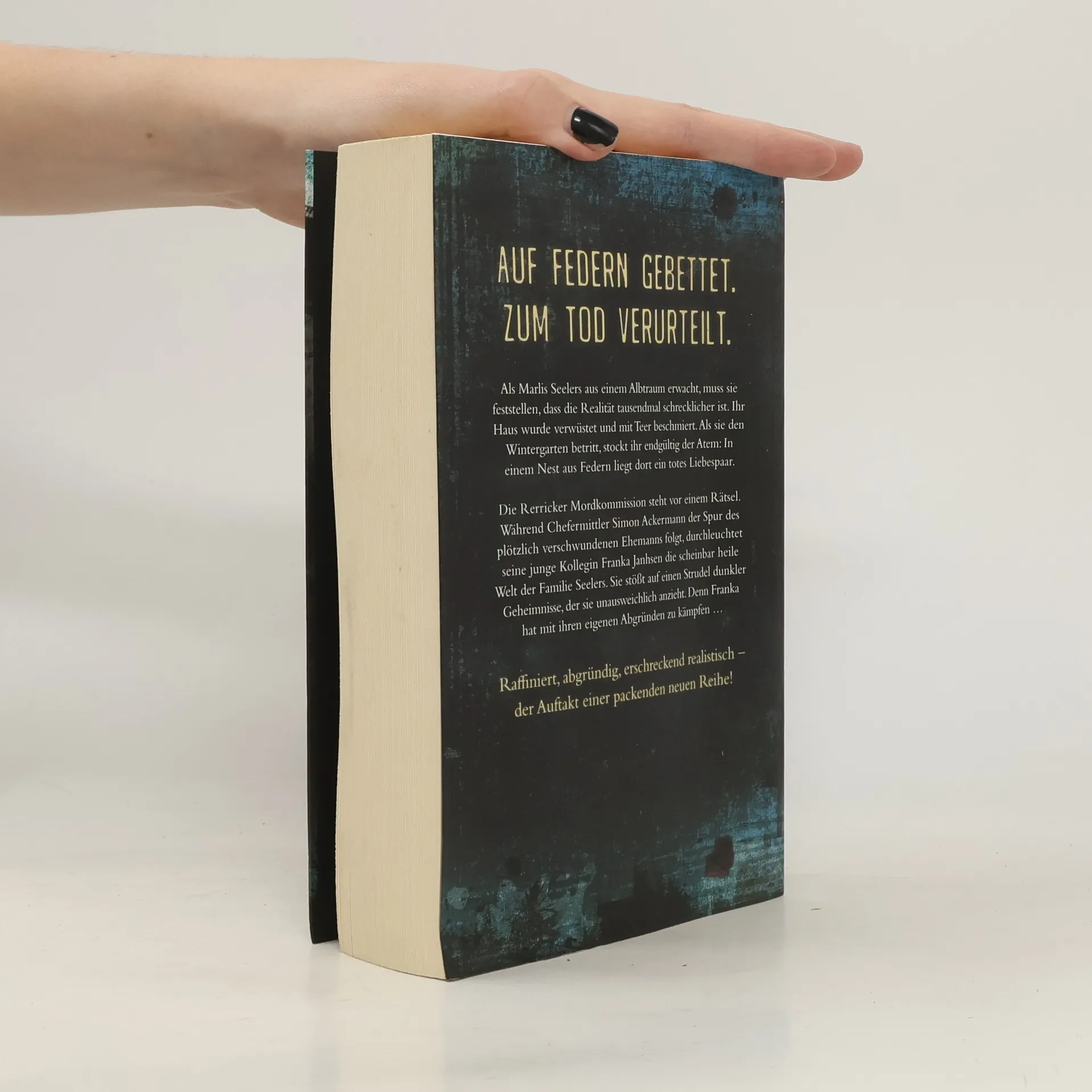 Auf Federn gebettet. Zum Tode verurteilt. Als Marlis Seelers aus einem Albtraum erwacht, muss sie feststellen, dass die Realität tausendmal schrecklicher ist. Ihr Haus wurde verwüstet und mit Teer beschmiert. Als sie den Wintergarten betritt, stockt ihr endgültig der Atem: In einem Nest aus Federn liegt dort ein totes Liebespaar. Während Chefermittler Simon Ackermann der Spur des plötzlich verschwundenen Ehemanns folgt, durchleuchtet seine junge Kollegin Franka Janhsen die scheinbar heile Welt der Familie Seelers. Dort stößt sie auf einen Strudel dunkler Geheimnisse, der sie unausweichlich anzieht. Denn Franka hat mit ihren eigenen Abgründen zu kämpfen …