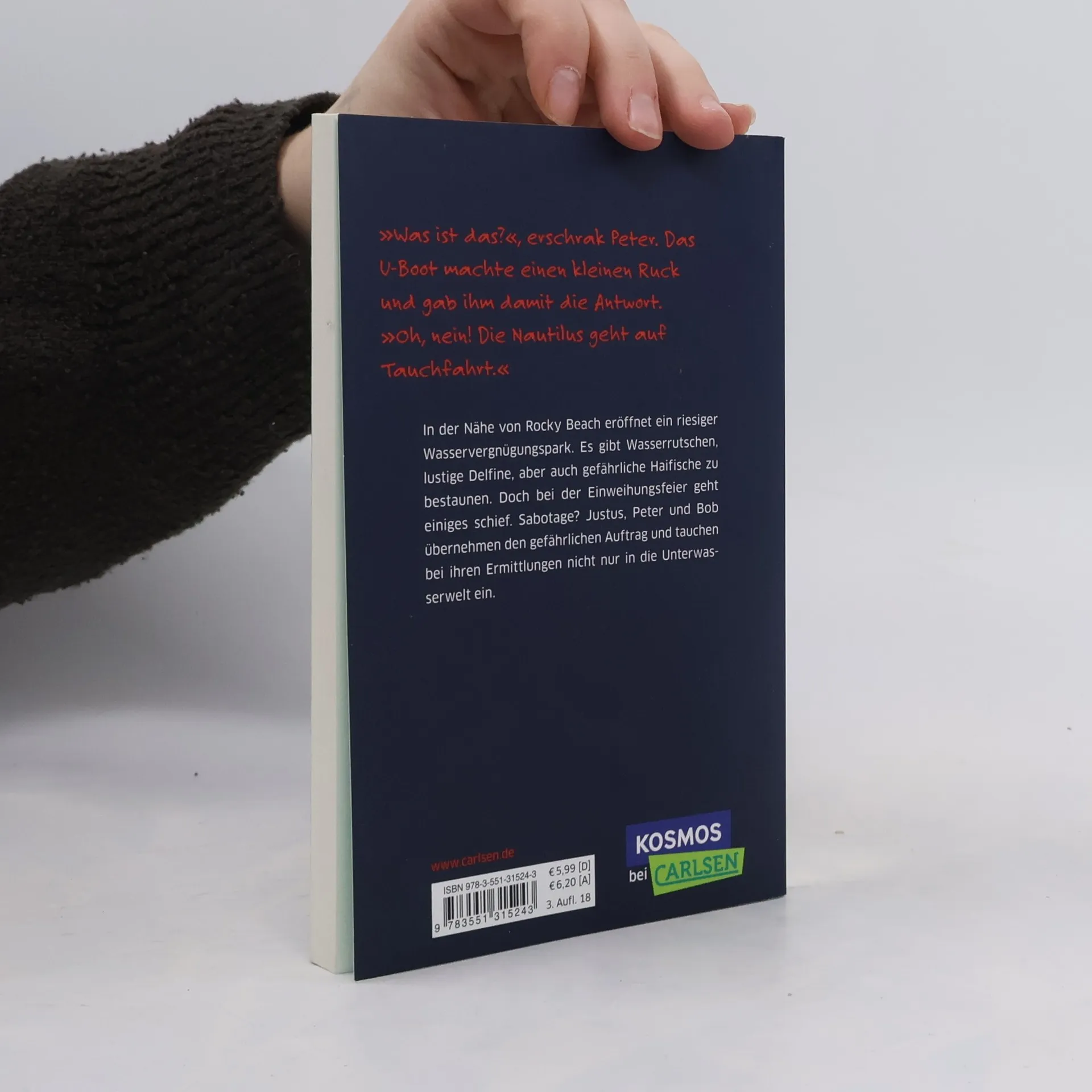 In der Nähe von Rocky Beach eröffnet ein riesiger Wasservergnügungspark. Es gibt Wasserrutschen, lustige Delfine, aber auch gefährliche Haifische zu bestaunen. Doch bei der Einweihungsfeier geht einiges schief. Sabotage? Justus, Peter und Bob übernehmen den gefährlichen Auftrag und tauchen bei ihren Ermittlungen in die Unterwasserwelt ein.