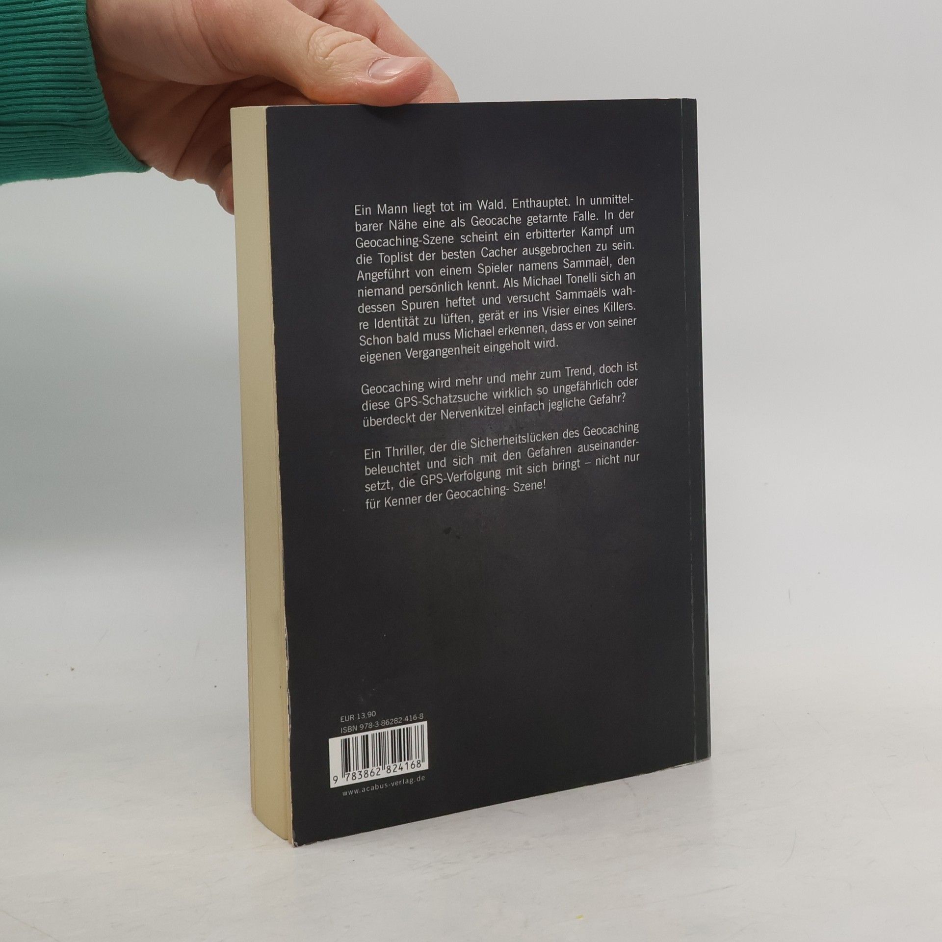 Ein Mann liegt tot im Wald. Enthauptet. In unmittelbarer Nähe eine als Geocache getarnte Falle. In der Geocaching-Szene scheint ein erbitterter Kampf um die Toplist der besten Cacher ausgebrochen zu sein. Angeführt von einem Spieler namens Sammaël, den niemand persönlich kennt. Als Michael Tonelli sich an dessen Spuren heftet und versucht Sammaëls wahre Identität zu lüften, gerät er ins Visier eines Killers. Schon bald muss Michael erkennen, dass er von seiner eigenen Vergangenheit eingeholt wird. Geocaching wird mehr und mehr zum Trend, doch ist diese GPS-Schatzsuche wirklich so ungefährlich oder überdeckt der Nervenkitzel einfach jegliche Gefahr? Ein Thriller, der die Sicherheitslücken des Geocaching beleuchtet und sich mit den Gefahren auseinandersetzt, die GPS-Verfolgung mit sich bringt – nicht nur für Kenner der Geocaching- Szene!
