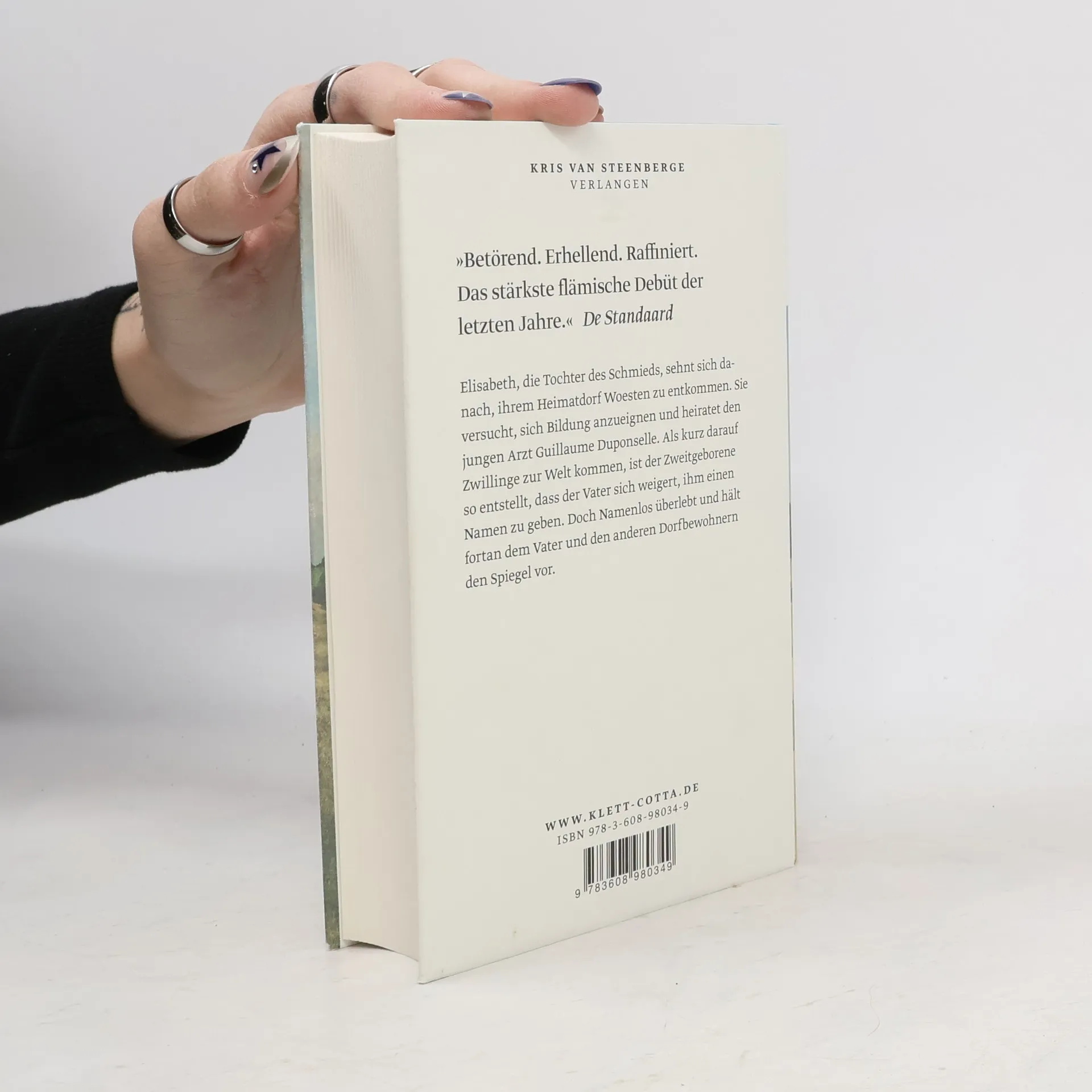 Elisabeth, die Tochter des Schmieds, sehnt sich danach, ihrem Heimatdorf Woesten zu entkommen. Sie versucht, sich Bildung anzueignen und heiratet den jungen Arzt Guillaume Duponselle. Als kurz darauf Zwillinge zur Welt kommen, ist der Zweitgeborene so entstellt, dass der Vater sich weigert, ihm einen Namen zu geben. Doch Namenlos überlebt und hält fortan dem Vater und den anderen Dorfbewohnern den Spiegel vor. Das 19. Jahrhundert neigt sich dem Ende zu. In dem kleinen belgischen Dorf Woesten, unweit von Ypern, erwarten das junge Ehepaar Duponselles Zwillinge. Doch die Ehe steht unter keinem guten Stern. Beim erstgeborenen Valentijn geht alles gut, aber das zweite Kind kommt mit einem deformierten Gesicht zur Welt und geht fortan als Namenlos durchs Leben. Als die Brüder heranwachsen, ist Valentijn bei allen beliebt, während die Dorfbewohner und sogar sein eigener Vater nichts mit Namenlos zu schaffen haben wollen. Dann bricht der Erste Weltkrieg aus, und das kleine Woesten liegt mitten im großen Weltgeschehen. Als auch noch Elisabeth ermordet aufgefunden wird, ist für niemanden mehr die Zukunft wie zuvor. Vor der historischen Kulisse des ländlichen Flanderns entfaltet Kris Van Steenberge mit zeitloser Aktualität das psychologisch eindringliche Porträt einer Familie, eines Ortes und einer vergangenen Epoche.