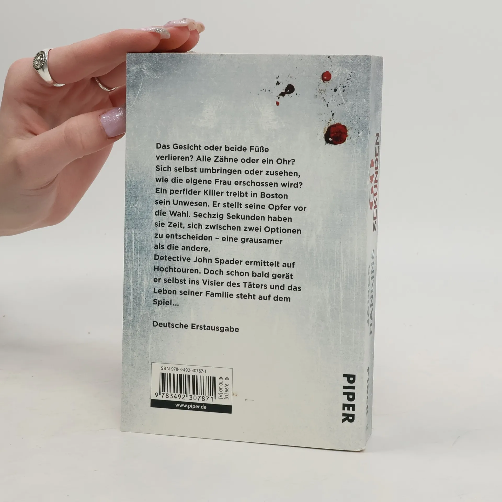 Das Gesicht oder beide Füße verlieren? Alle Zähne oder ein Ohr? Sich selbst umbringen oder zusehen, wie die eigene Frau erschossen wird? Ein perfider Killer treibt in Boston sein Unwesen. Er stellt seine Opfer vor die Wahl. Sechzig Sekunden haben sie Zeit, sich zwischen zwei Optionen zu entscheiden – eine grausamer als die andere. Detective John Spader ermittelt auf Hochtouren. Doch schon bald gerät er selbst ins Visier des Täters – und das Leben seiner Familie steht auf dem Spiel …