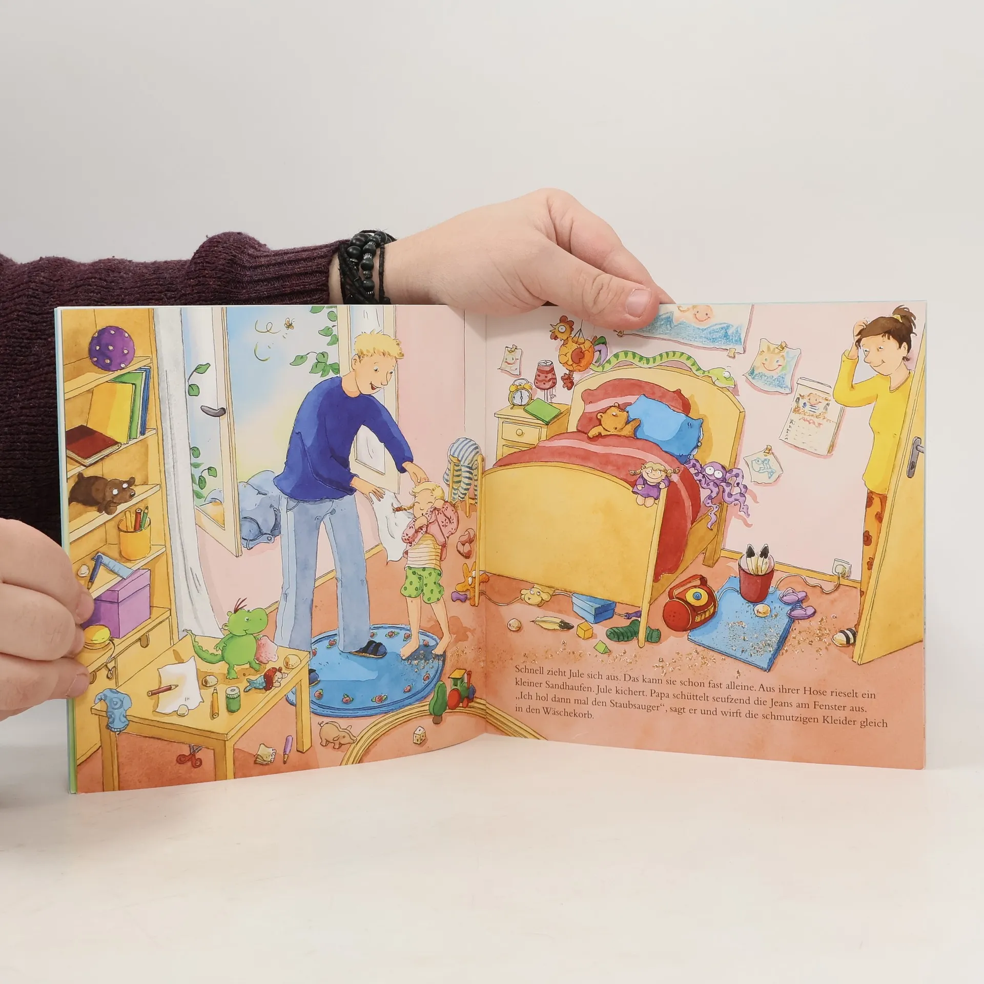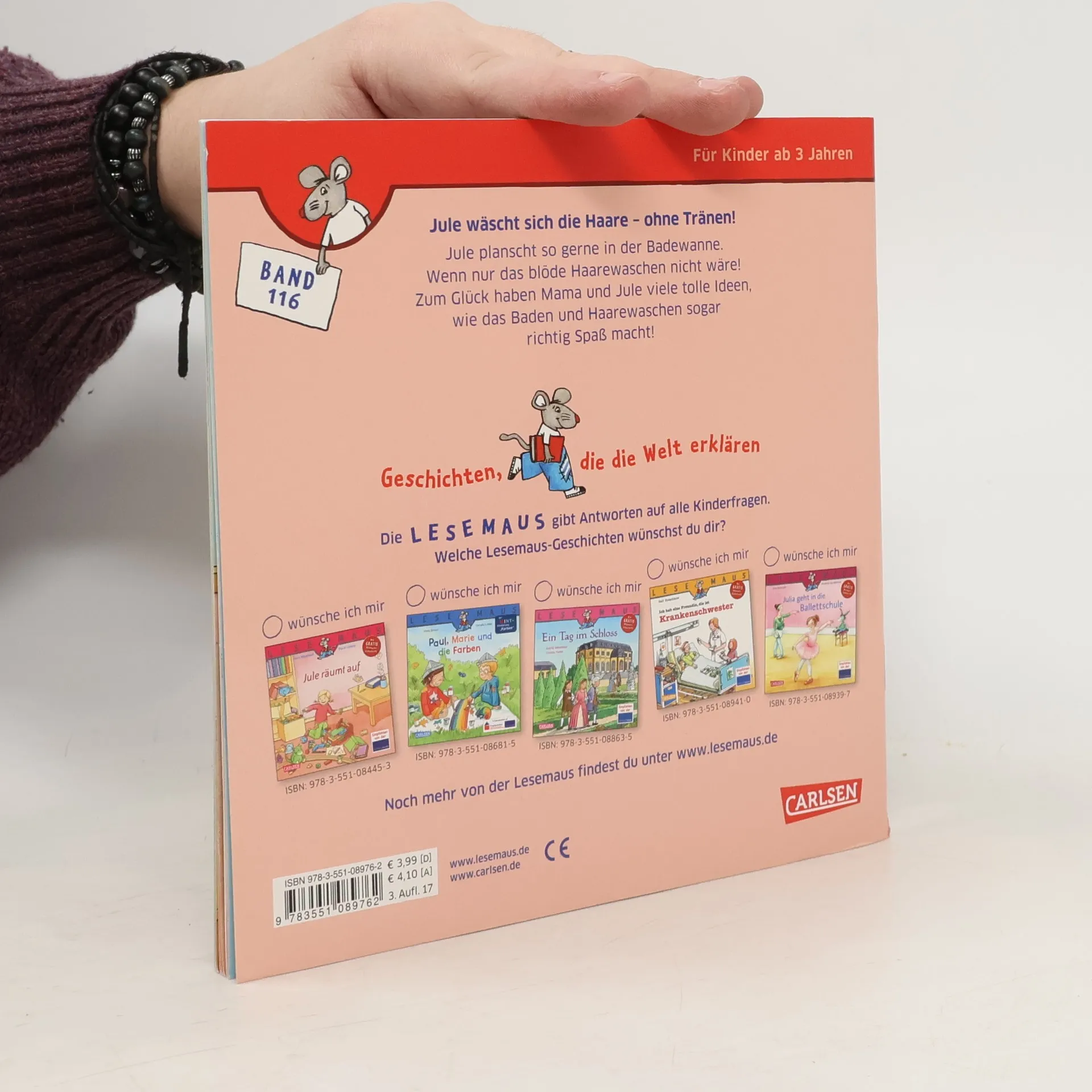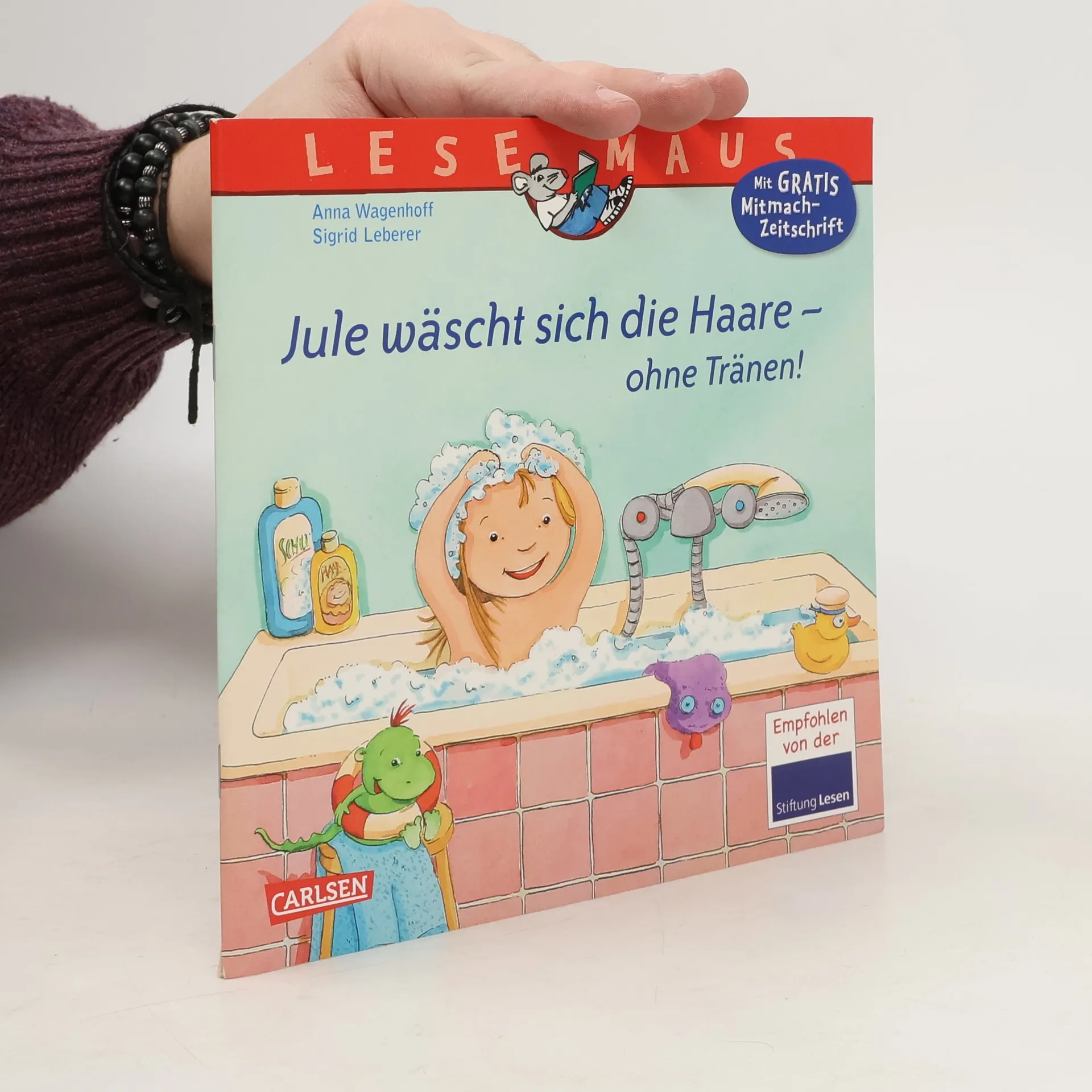 Jule plantscht so gerne in der Badewanne. Wenn nur das blöde Haare waschen nicht wäre! Zum Glück haben Mama und Jule viele tolle Ideen, wie das Baden und Haare waschen sogar richtig Spaß macht! Ein fröhliches Bilderbuch aus dem Kinderalltag, mit dem das Haare waschen klappt – ohne Tränen! Diese Geschichte könnt ihr euch in der kostenlosen App „Der kleine Vorleser“ auch vorlesen lassen! So geht’s: Öffnet den Appstore eures Gerätes und gebt im Suchfeld „Der kleine Vorleser“ ein. Installiert die App und öffnet sie. Tippt auf euer Buch und scannt die Vorderseite des Buches mit der Kamera eures Gerätes ein. Nun startet der Vorlesespaß! Mit dieser App könnt ihr euch auch viele andere eurer Bücher vorlesen lassen. Viel Spaß beim Zuhören!