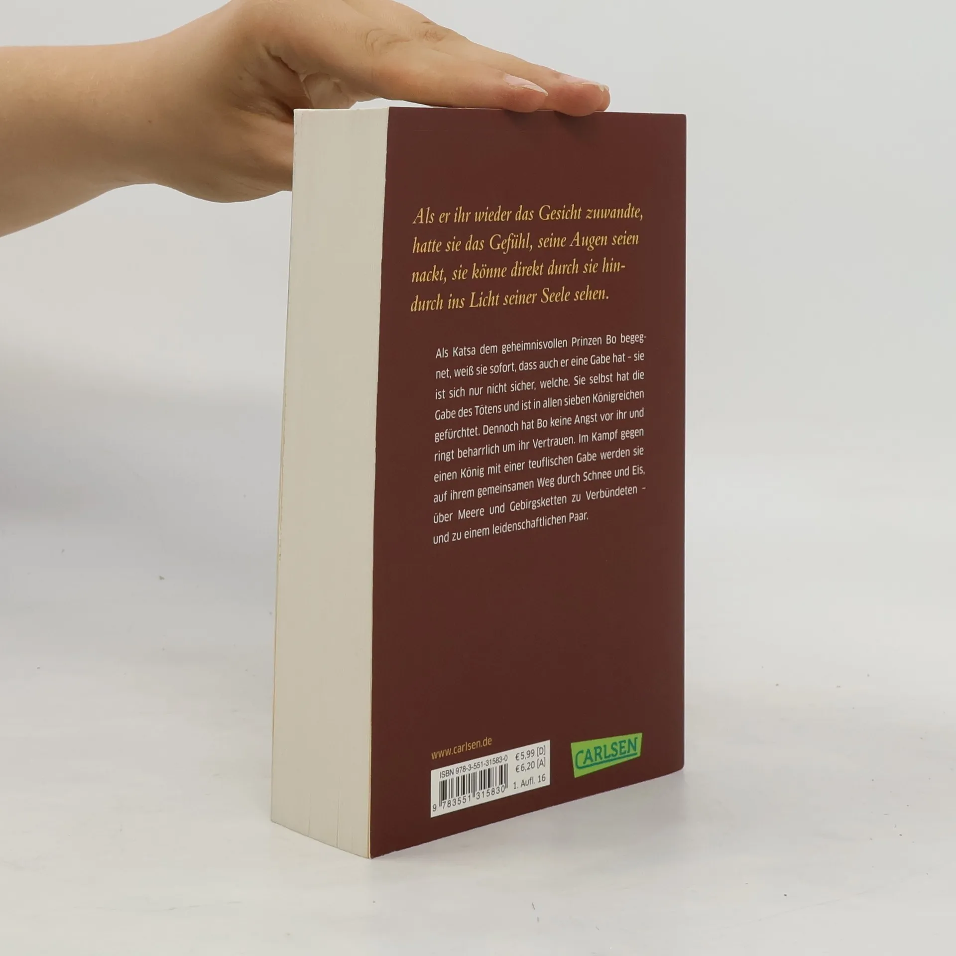 Als Katsa dem geheimnisvollen Prinzen Bo begegnet, weiß sie sofort, dass auch er eine Gabe hat – sie ist sich nur nicht sicher, welche. Sie selbst hat die Gabe des Tötens und ist in allen sieben Königreichen gefürchtet. Dennoch hat Bo keine Angst vor ihr und ringt beharrlich um ihr Vertrauen. Im Kampf gegen einen König mit einer teuflischen Gabe werden sie auf ihrem gemeinsamen Weg durch Schnee und Eis, über Meere und Gebirgsketten zu Verbündeten – und zu einem leidenschaftlichen Paar. Alle Bände der romantischen Serie: Die Beschenkte (Band 1) Die Flammende (Band 2) Die Königliche (Band 3)