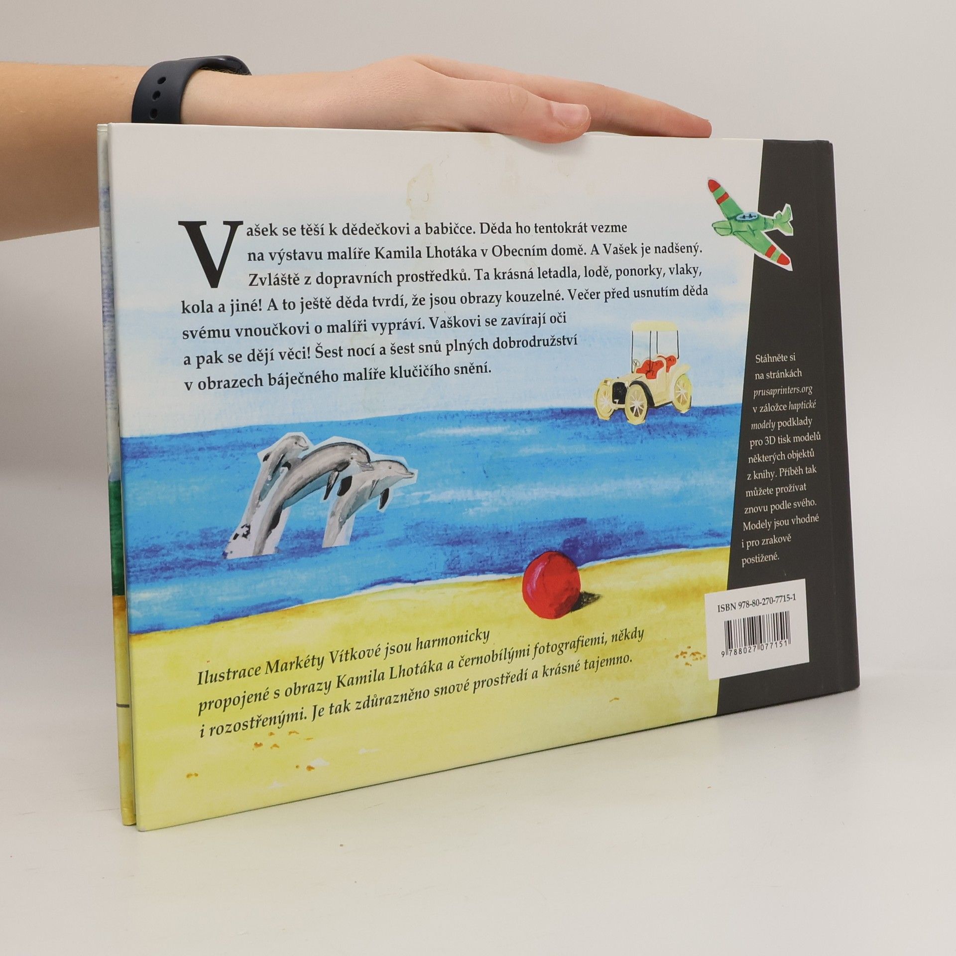 Vašek se těší k dědečkovi a babičce. Děda ho tentokrát vezme na výstavu malíře Kamila Lhotáka v Obecním domě. A Vašek je nadšený. Zvláště z dopravních prostředků. Ta krásná letadla, lodě, ponorky, vlaky, kola a jiné! A to ještě děda tvrdí, že jsou obrazy kouzelné. Večer před usnutím děda svému vnoučkovi o malíři vypráví. Vaškovi se zavírají oči a pak se dějí věci! Šest nocí a šest snů plných dobrodružství v obrazech báječného malíře klučičího snění. Ilustrace Markéty Vítkové jsou harmonicky propojené s obrazy Kamila Lhotáka a černobílými fotografiemi, někdy i rozostřenými. Je tak zdůrazněno snové prostředí a krásné tajemno. Ke knize si můžete na stránkách prusaprinters.org v záložce haptické modely stáhnout podklady pro 3D tisk modelů některých objektů z knihy. Příběh tak můžete prožívat znovu podle svého. Modely jsou vhodné i pro zrakově postižené.