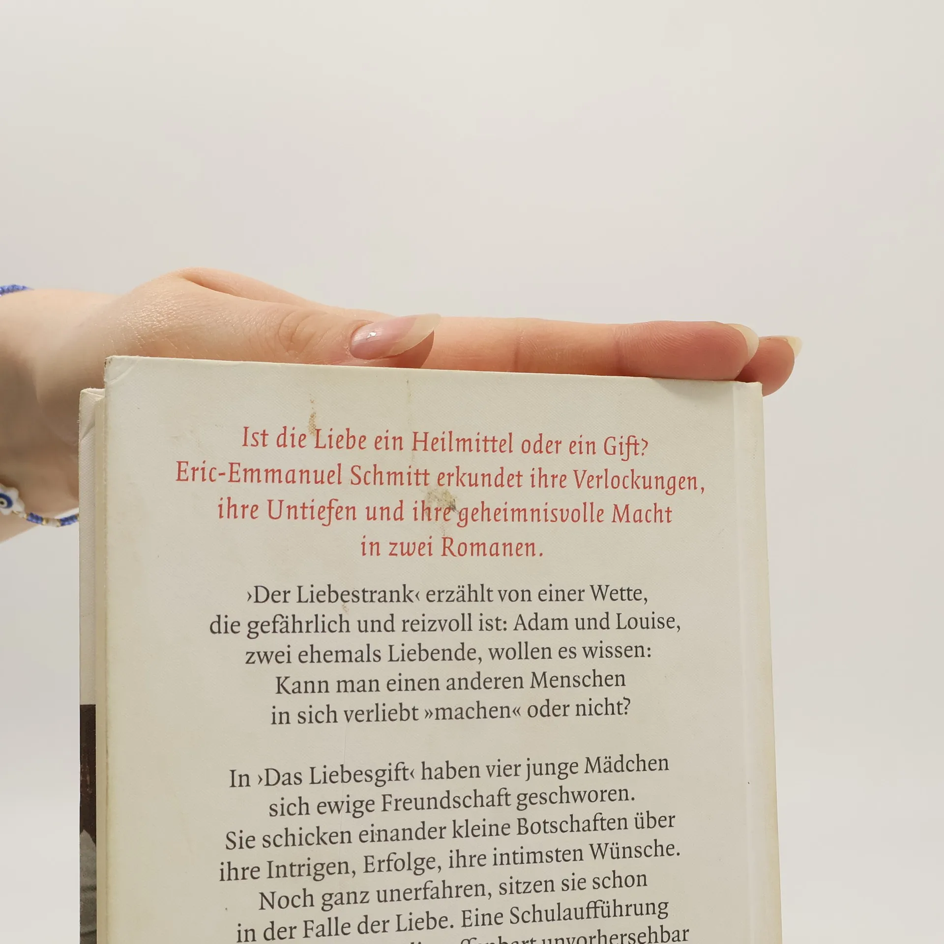 Die Liebe ist kein harmloses Gefühl. Sie kann vereinnahmen, verletzten, eifersüchtig machen, zu Intrigen anstacheln. Eric-Emmanuel Schmitt, französischer Lieblingsautor deutscher Leser seit seinem Bestseller ›Monsieur Ibrahim und die Blumen des Koran‹, geht in ›Was Liebe will‹ dieser Leidenschaft auf den Grund: ihren Verlockungen, ihren Untiefen und ihrer geheimnisvollen Macht. In zwei Romanen. ›Der Liebestrank‹ erzählt von einer Wette, die gefährlich und reizvoll ist: Adam und Louise, zwei ehemals Liebende, wollen es wissen: Kann man einen anderen Menschen in sich verliebt »machen«, oder nicht? Doch während Adam seine erloschene Leidenschaft für Louise in eine wunderbare Freundschaft verwandeln möchte, hat die romantisch Liebende Louise ganz andere Absichten. Sie schickt ihrem alten Liebhaber eine attraktive junge Kollegin ins Haus, die keineswegs zufällig dasselbe Parfüm wie Louise benutzt. Und Adam, der selbstgefällig Liebende, wird ein ahnungsloses Opfer weiblicher Hinterlist. In ›Das Liebesgift‹ dreht sich alles um die ersten großen Gefühle von vier 16-jährigen Mädchen, die einander ewige Freundschaft geschworen haben. Sie schicken einander kleine Botschaften über ihre Intrigen, Erfolge, ihre intimsten Wünsche. Noch ganz unerfahren, sitzen sie schon in der Falle der Liebe. Eine Schulaufführung von ›Romeo und Julia‹ offenbart unvorhersehbar und fatal eine grausame Wahrheit.