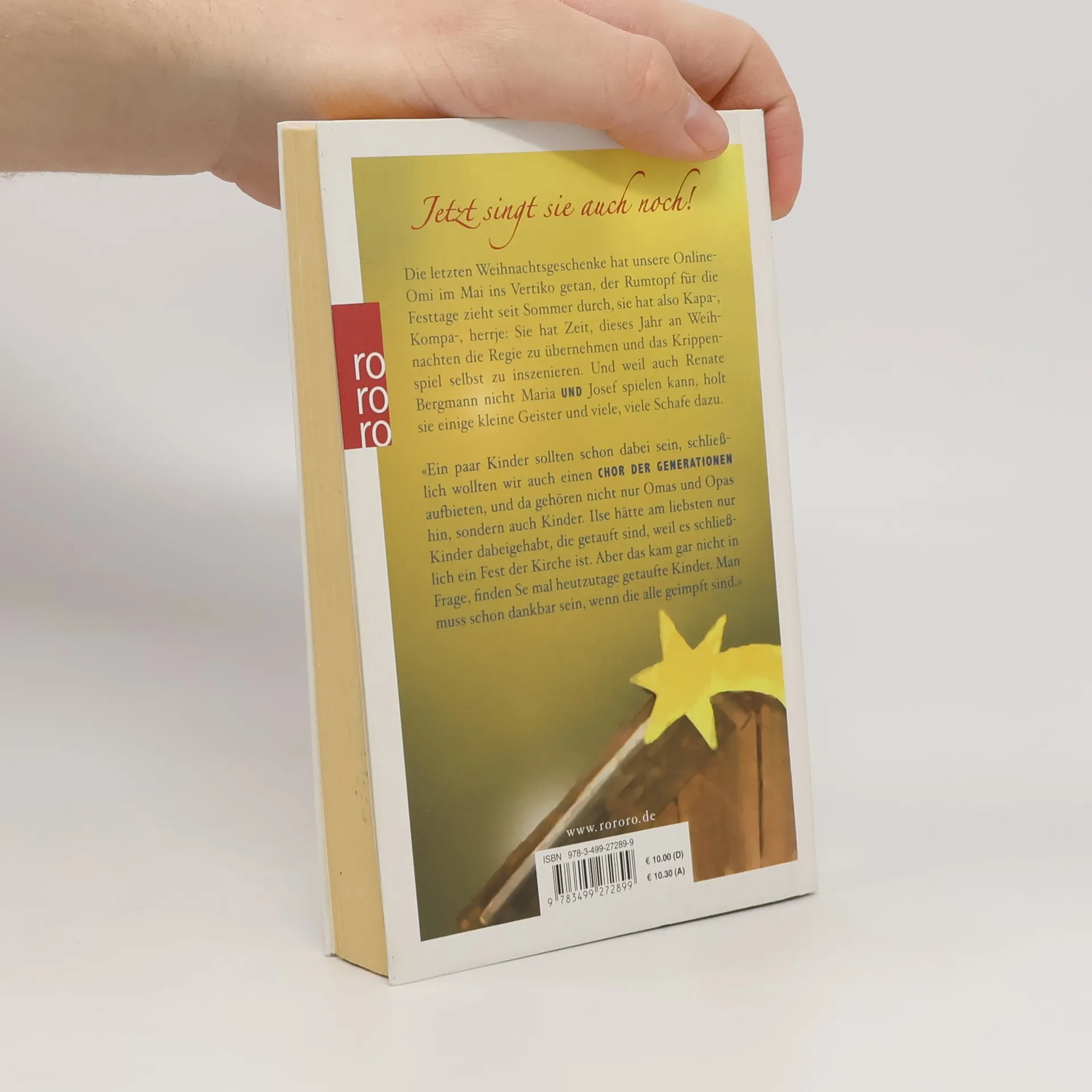 Jetzt singt sie auch noch! Die letzten Weihnachtsgeschenke hat unsere Online-Omi im Mai ins Vertiko getan, der Rumtopf für die Festtage zieht seit Sommer durch, sie hat also Kapa-, Kompa, herrje: Sie hat Zeit, dieses Jahr an Weihnachten die Regie zu übernehmen und das Krippenspiel selbst zu inszenieren. Und weil auch Renate Bergmann nicht Maria UND Josef spielen kann, holt sie ein paar kleine Geister und viele, viele Schafe dazu. «Ein paar Kinder sollten schon dabei sein, schließlich wollten wir auch einen Chor der Generationen aufbieten, und da gehören nicht nur Omas und Opas hin, sondern auch Kinder. Ilse hätte am liebsten nur Kinder dabei gehabt, die getauft sind, weil es schließlich ein Fest der Kirche ist. Aber das kam gar nicht in Frage, finden Se mal heutzutage getaufte Kinder. Man muss schon dankbar sein, wenn die alle geimpft sind.»