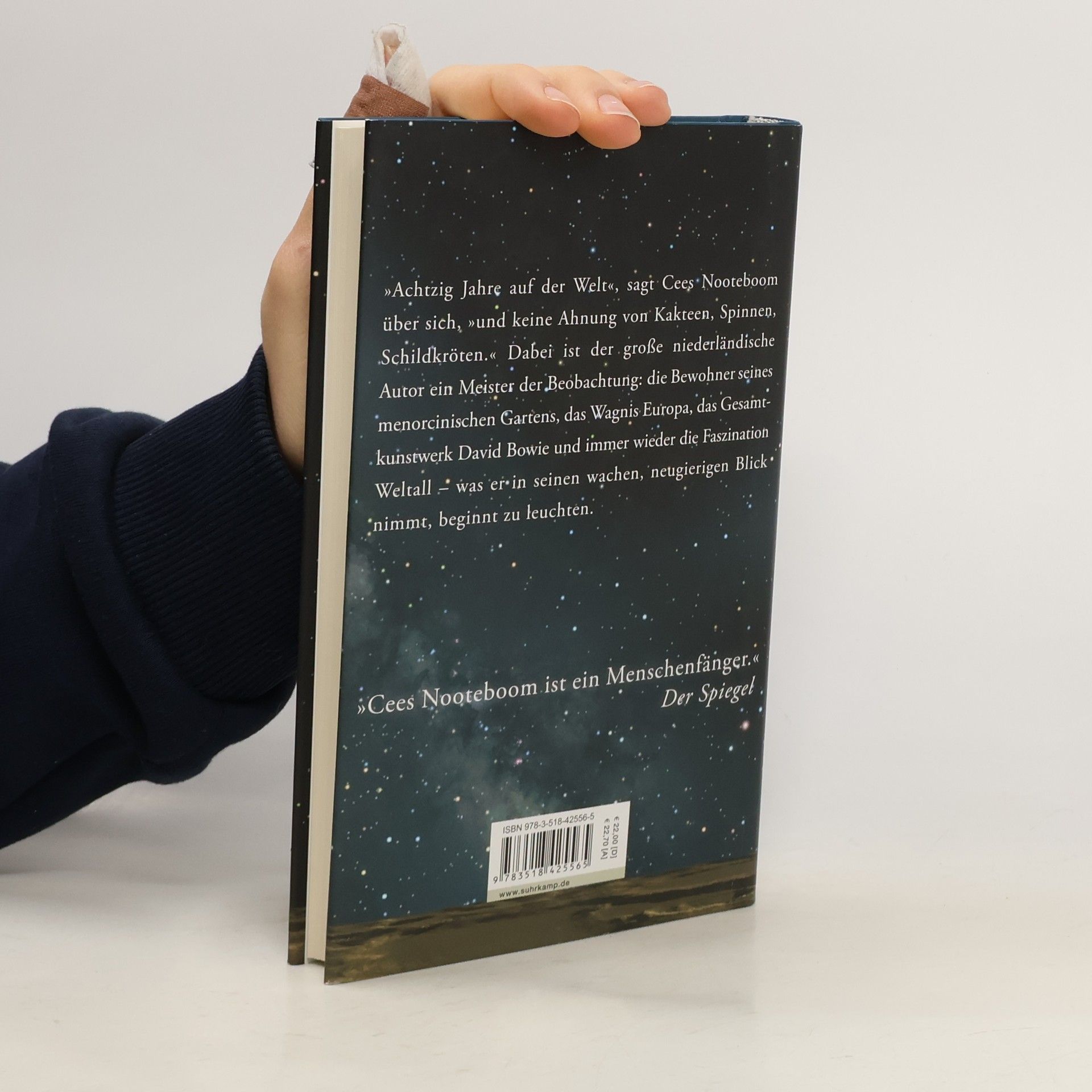 Ein Mann, eine Insel, das All: Wenn der Kosmopolit Cees Nooteboom auf Menorca ist – längst nicht mehr nur seine »Sommerinsel« –, dann steht er mit beiden Beinen fest auf dem fruchtbaren Boden, umgeben von Palmen, störrischen Schildkröten und den geliebten Büchern im Gartenstudio. Sein Blick reicht jedoch weit über die Horizontlinie hinaus, wach und neugierig. Mit Skepsis blickt Nooteboom auf ein Europa, das auseinanderzubrechen droht; mit Staunen betrachtet er das Gesamtkunstwerk David Bowie. Seine Begeisterung aber gilt dem Weltall, von seinem Schutzheiligen, dem Sternbild Orion, bis zu den beiden Voyager-Raumsonden mit ihren Grußbotschaften an fremde Zivilisationen im Gepäck, seit fast 40 Jahren im All unterwegs und von allen vergessen (»außer von der NASA und mir«). Nur eine Handvoll betagter Techniker weiß die veraltete Software noch zu bedienen – die Rentner der Raumfahrt.