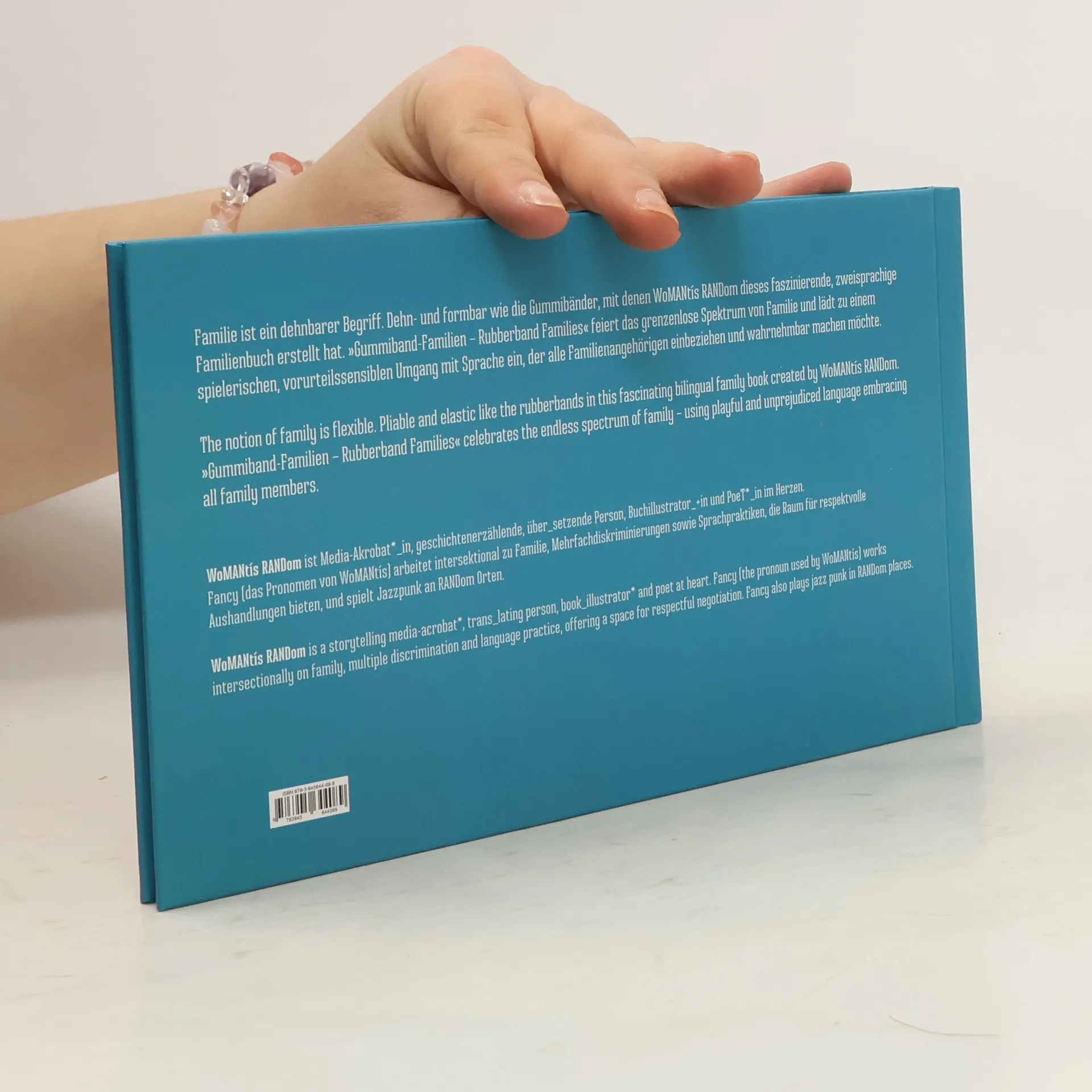 Familie ist ein dehnbarer Begriff. Dehn- und formbar wie die Gummibänder, mit denen WoMANtís RANDom dieses faszinierende, zweisprachige Familienbuch erstellt hat. Gummibänder gibt es einzeln oder gemeinsam, in unterschiedlichen Größen. Sie begleiten unseren Alltag. Manchmal rücken sie in den Vordergrund, sie halten viel aus und gehen auch mal kaputt. Sie sind dynamisch, ‑ flexibel, wieder benutzbar wie bindend – und damit wunderbar geeignet, ganz eigene Familienbilder zu gestalten. „Gummiband-Familien – Rubberband Families“ feiert das grenzenlose Spektrum von Familie und lädt zu einem spielerischen, vorurteilssensiblen Umgang mit Sprache ein, der alle Familienangehörigen einbeziehen und wahrnehmbar machen möchte. Über die Zweisprachigkeit hinaus bietet der Band zahlreiche Angebote für alle Teile der Familie, Begriffe und Vorstellungen selbst mit Stift, Wort und Gummiband zu verändern, zu dehnen und für sich passend zu formen.