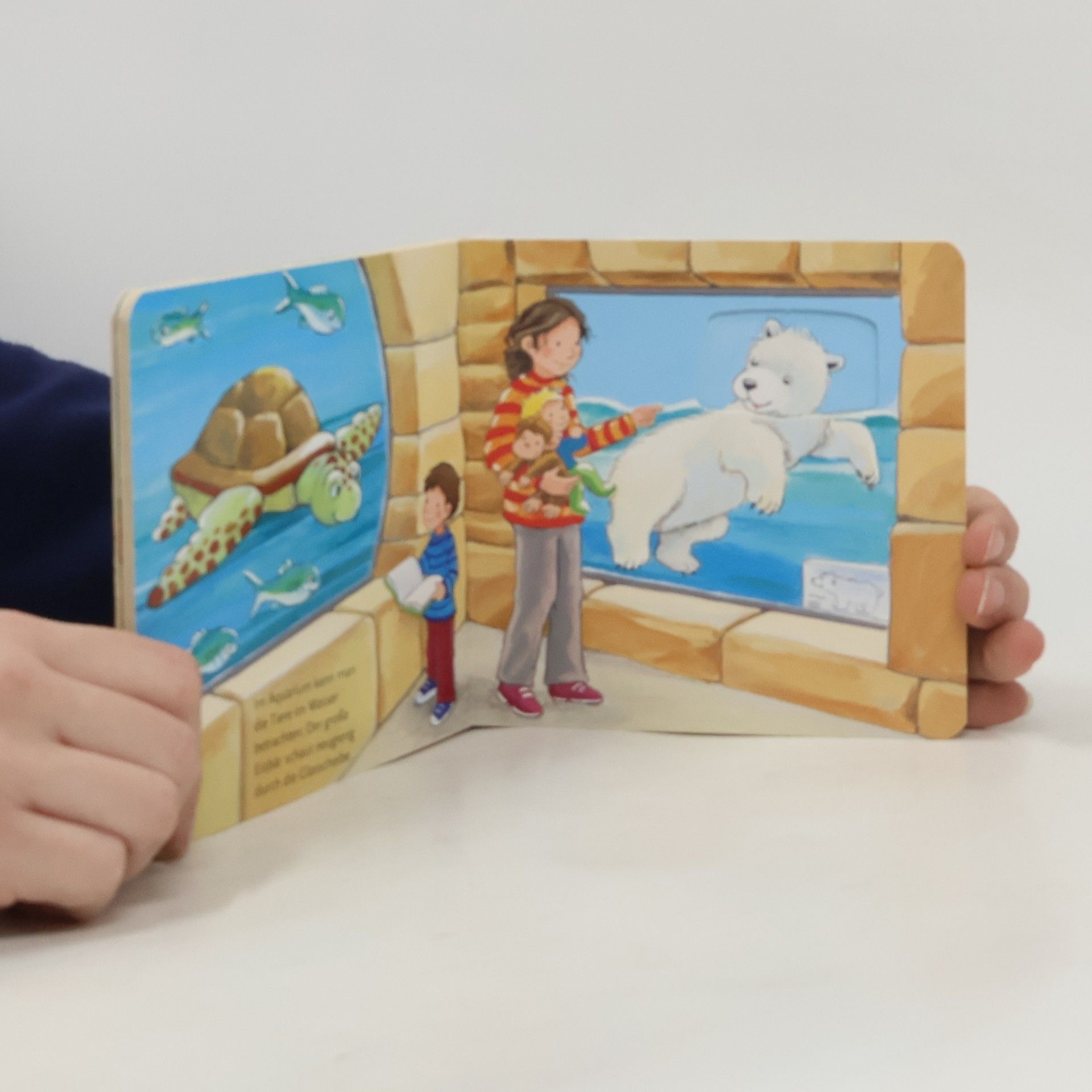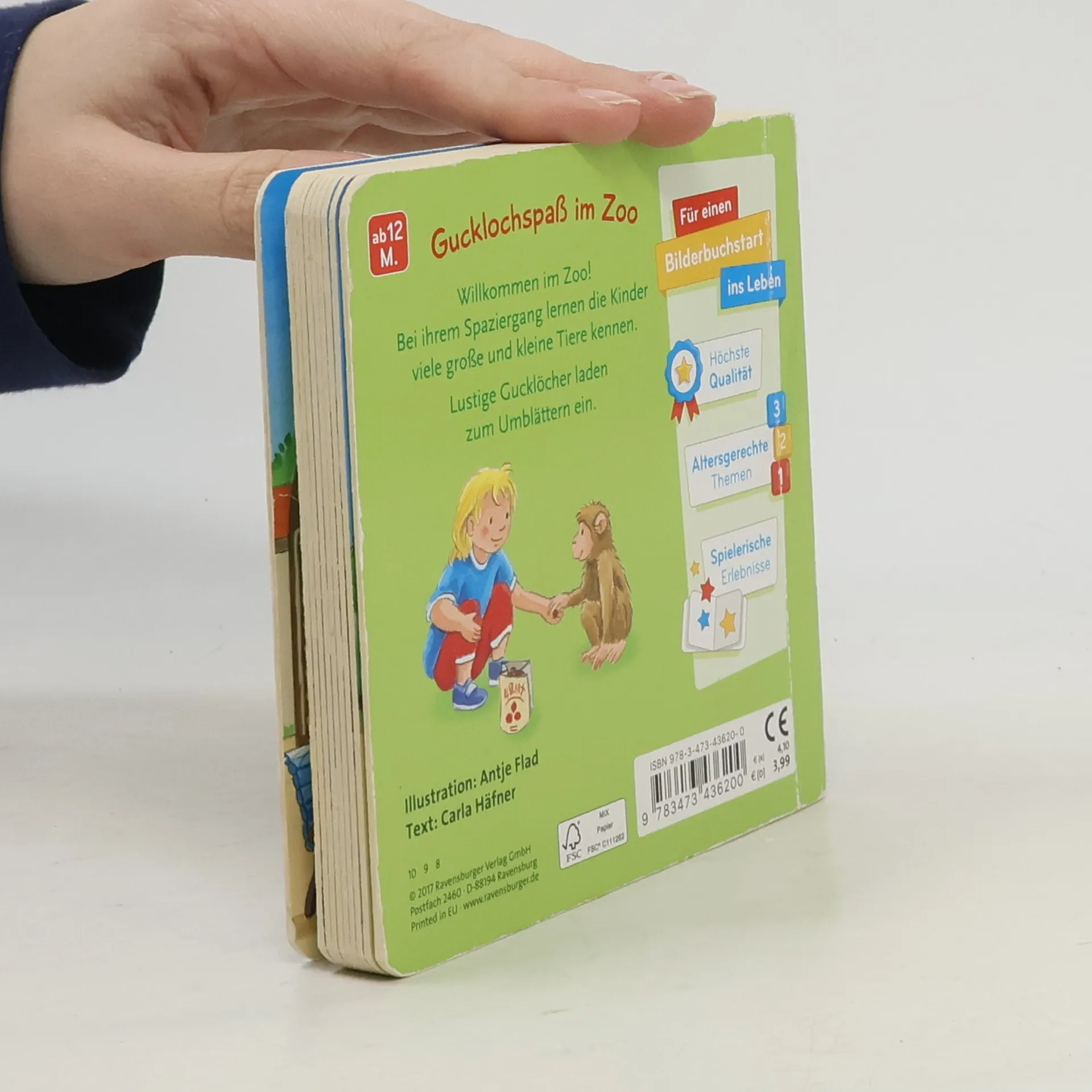 Im Zoo ist richtig was los. Der kleine Elefant spritzt die Besucher mit Wasser nass, die Affen toben und klettern und der kleine Pinguin muss verarztet werden. Ein lustiges Gucklochbuch, in dem es viel zu entdecken gibt. In diesem Gucklochbuch erfahren Kinder ab 12 Monaten jede Menge über die bunte Welt des Zoos. Die Gucklöcher machen neugierig und laden die Kleinsten zum Vor- und Zurückblättern ein. Was wohl auf der nächsten Seite passiert?