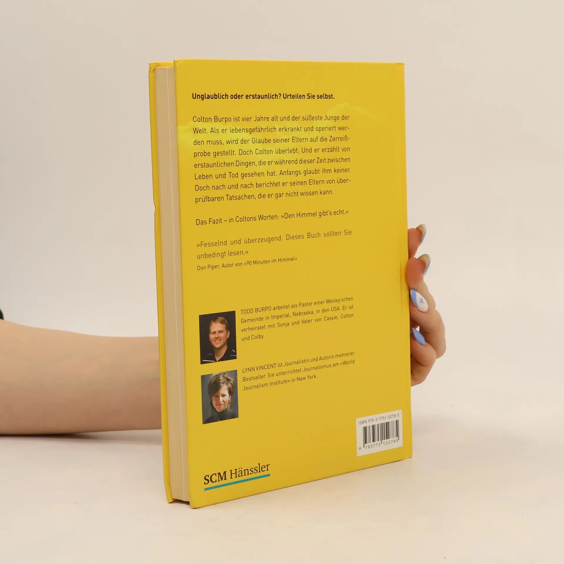 Unglaublich oder erstaunlich? Urteilen Sie selbst: Colton ist vier Jahre alt, als er lebensgefährlich erkrankt und operiert werden muss. Er überlebt um Haaresbreite. Später erzählt er seinen Eltern, dem Pastorenehepaar Todd und Sonja Burpo, von erstaunlichen Dingen, die er während dieser Zeit zwischen Leben und Tod gesehen hat. Er berichtet von Tatsachen, die er gar nicht wissen konnte. Coltons Fazit: "Den Himmel gibt's echt!"