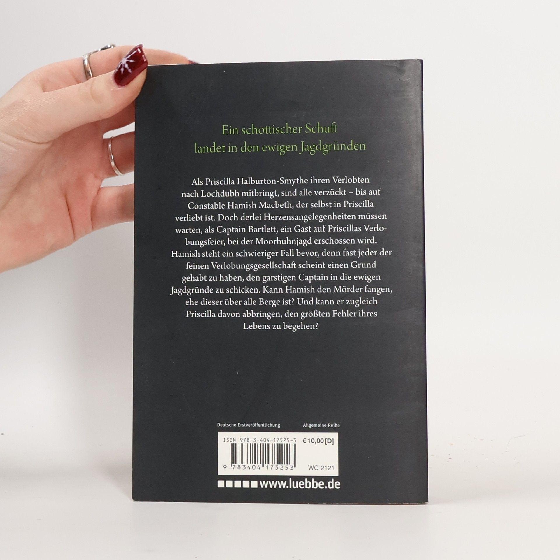 Ein schottischer Schuft landet in den ewigen Jagdgründen Als Priscilla Halburton-Smythe ihren Verlobten nach Lochdubh mitbringt, sind alle verzückt - bis auf Constable Hamish Macbeth, der selbst in Priscilla verliebt ist. Doch derlei Herzensangelegenheiten müssen warten, als Captain Bartlett, ein Gast auf Priscillas Verlobungsfeier, bei der Moorhuhnjagd erschossen wird. Hamish steht ein schwieriger Fall bevor, denn fast jeder der feinen Verlobungsgesellschaft scheint einen Grund gehabt zu haben, den garstigen Captain in die ewigen Jagdgründe zu schicken. Kann Hamish den Mörder fangen, ehe dieser über alle Berge ist? Und kann er zugleich Priscilla davon abbringen, den größten Fehler ihres Lebens zu begehen? Der zweite Band der kultigen Hamish Macbeth-Krimireihe von Bestsellerautorin M. C. Beaton.