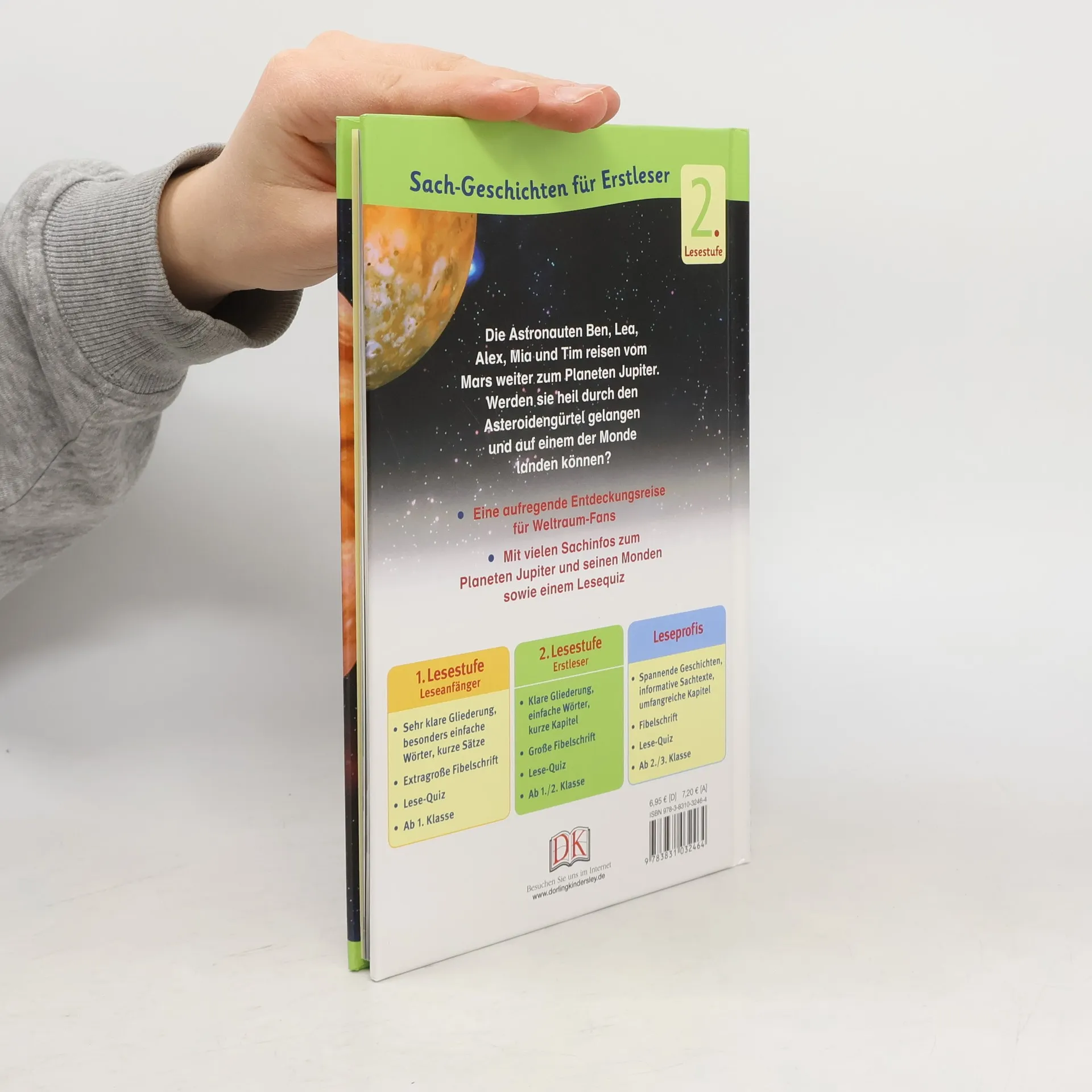 Eine Reise vom Mars zum Planeten Jupiter, durch den Asteroidengürtel und danach mit der Landesfähre die Jupiter Monde erkunden – begleitet die Astronauten Ben, Lea, Alex, Mia und Tim auf ihrer aufregenden Weltraummission. Dabei erfahrt ihr spannende Infos über die Galaxis – wusstet ihr zum Beispiel, dass es im Asteroidengürtel etwa 1,4 Millionen Gesteinsbrocken gibt? Eine aufregende Entdeckungsexpedition für alle Weltraum-Fans! Die Superleser!-Bücher kombinieren das Beste aus Sach- und erzählendem Buch: Aufregende Geschichten werden durch interessante Hintergrundinformationen ergänzt - so kommt der Spaß, aber auch der Lerneffekt nicht zu kurz! Die Bücher gibt es in drei Lesestufen: für Leseanfänger in gelb, für Erstleser in grün und für Leseprofis in blau. Am Ende jedes Bandes gibt es ein Quiz mit Fragen zum Text sowie Hinweise und Tipps für Eltern, wie sie ihr Kind beim Lesen lernen bestmöglich unterstützen können. Die Sach-Geschichten der zweiten Lesestufe sind für Kids ab Ende der ersten bis zur zweiten Schulklasse perfekt geeignet. Auf jeweils 64 Seiten fesseln abwechslungsreiche Geschichten in großer Fibelschrift und mit vielen Bildern. Dazu gibt es ein tolles Lesebändchen zum schnellen Wiederfinden - so macht Lesen üben Spaß! Dieses Buch ist bei Antolin.de verfügbar.