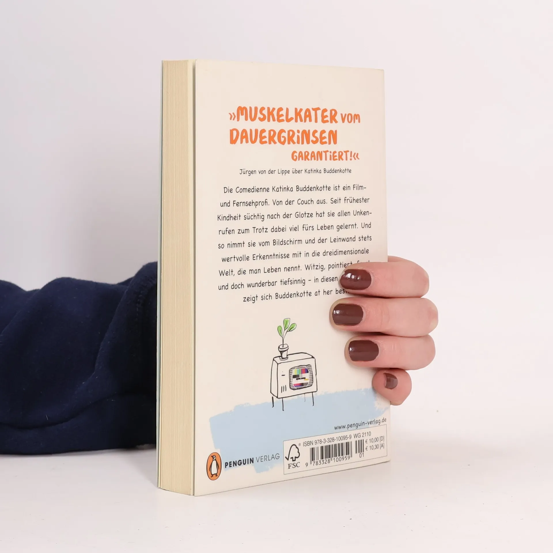 „Muskelkater vom Dauergrinsen garantiert!“ Jürgen von der Lippe über Katinka Buddenkotte Die Comedienne Katinka Buddenkotte ist ein Film- und Fernsehprofi. Von der Couch aus. Seit frühester Kindheit fernsehbegeistert hat sie allen Unkenrufen zum Trotz dabei viel fürs Leben gelernt. Zum Beispiel, dass Schauspieler mit Ketchup gefüllt sind und man Erwachsenen eher die peinliche Knutscherei verzeiht, wenn dabei gute Hintergrundmusik läuft. Vom Bildschirm und der Leinwand nimmt sie stets wertvolle Erkenntnisse mit in die dreidimensionale Welt, die man Leben nennt. Witzig, pointiert, frech und doch wunderbar tiefsinnig – in diesen Geschichten zeigt sich Buddenkotte at her best!