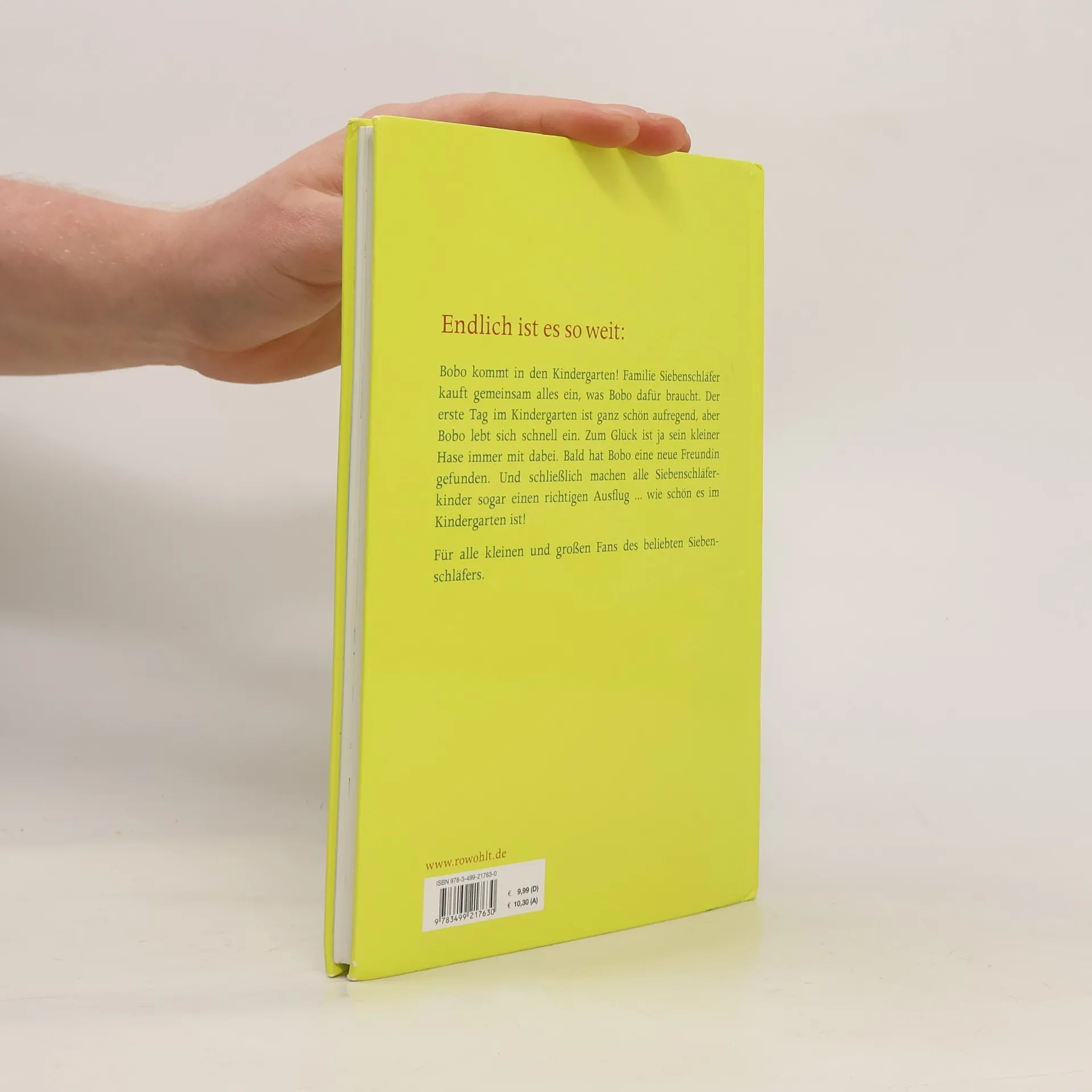 Endlich ist es so weit: Bobo kommt in den Kindergarten! Familie Siebenschläfer kauft gemeinsam alles ein, was Bobo dafür braucht. Der erste Tag im Kindergarten ist ganz schön aufregend, aber Bobo lebt sich schnell ein. Zum Glück ist ja sein kleiner Hase immer mit dabei. Bald hat Bobo eine neue Freundin gefunden. Und schließlich machen alle Siebenschläferkinder sogar einen richtigen Ausflug ... wie schön es im Kindergarten ist! Für alle kleinen und großen Fans des beliebten Siebenschläfers.