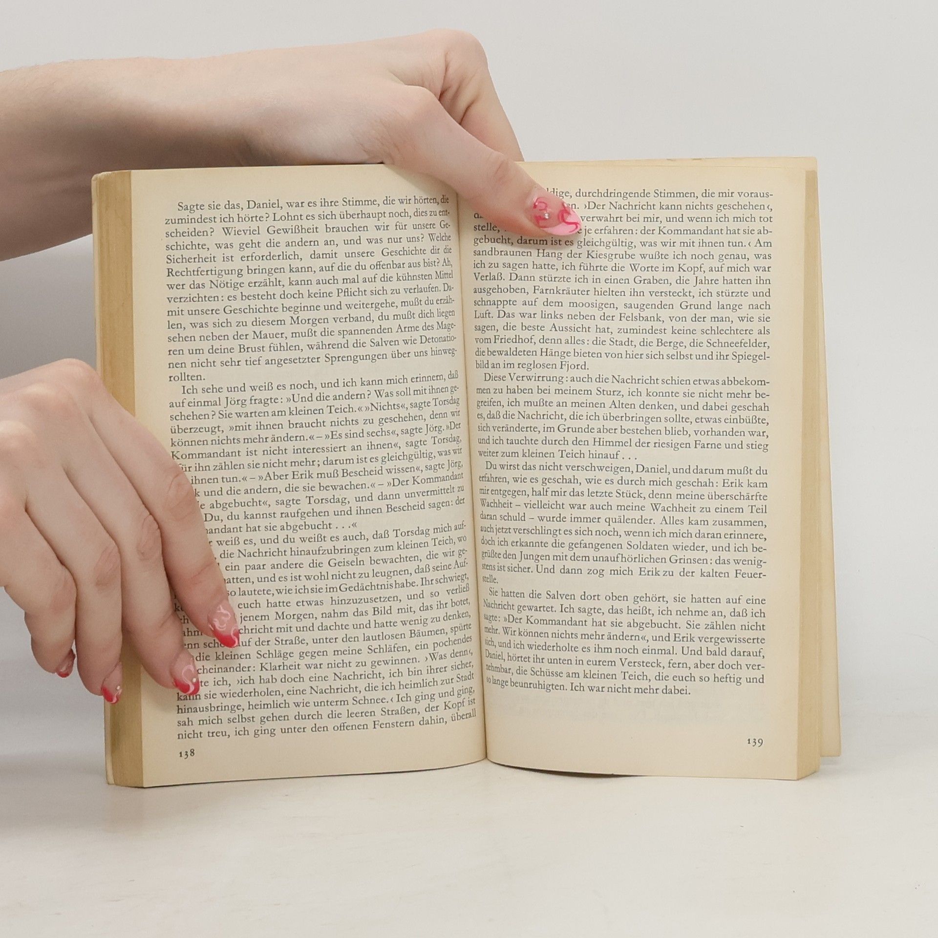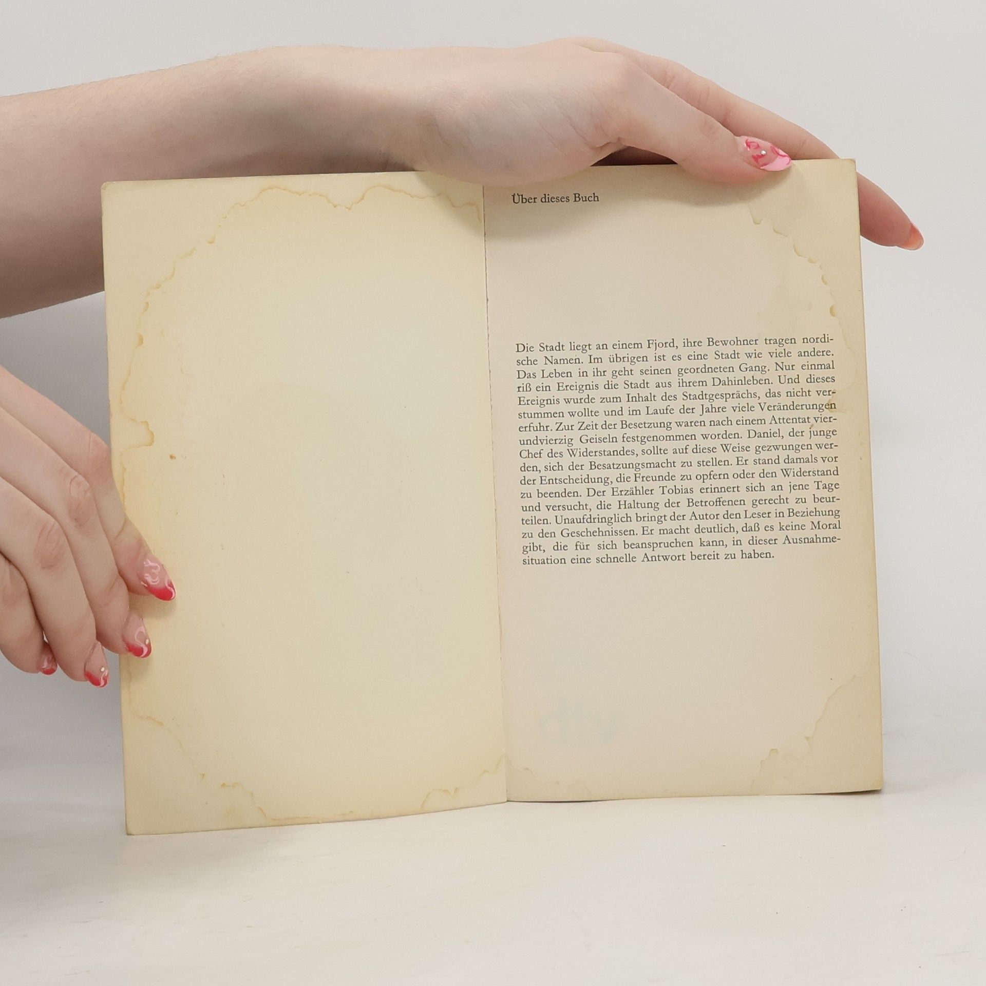 Ein Mann steht vor einer schwerwiegenden Entscheidung. Die Stadt liegt an einem Fjord, ihre Bewohner tragen nordische Namen. Im übrigen ist es eine Stadt wie viele andere. Das Leben in ihr geht seinen geordneten Gang. Nur einmal riß ein Ereignis die Stadt aus ihrem Dahinleben. Und dieses Ereignis wurde zum Inhalt des Stadtgesprächs, das nicht verstummen wollte und im Laufe der Jahre viele Veränderungen erfuhr. Zur Zeit der Besetzung waren nach einem Attentat vierundvierzig Geiseln festgenommen worden. Daniel, der junge Chef des Widerstandes, sollte auf diese Weise gezwungen werden, sich der Besatzungsmacht zu stellen. Er stand damals vor der Entscheidung, die Freunde zu opfern oder den Widerstand zu beenden. Der Erzähler Tobias erinnert sich an jene Tage und versucht, die Haltung der Betroffenen gerecht zu beurteilen. Unaufdringlich bringt der Autor den Leser in Beziehung zu den Geschehnissen. Er macht deutlich, daß es keine Moral gibt, die für sich beanspruchen kann, in dieser Ausnahmesituation eine schnelle Antwort bereit zu haben.