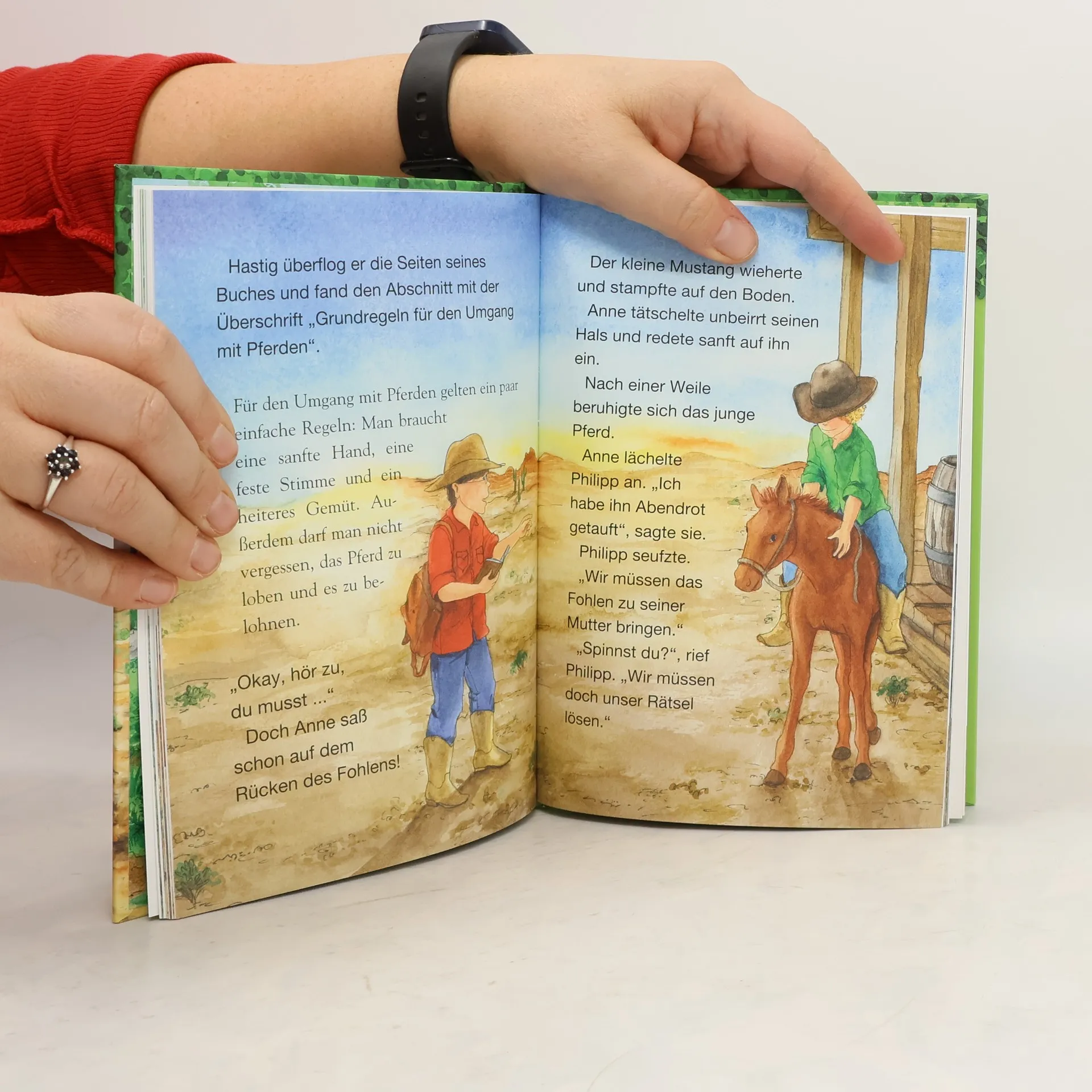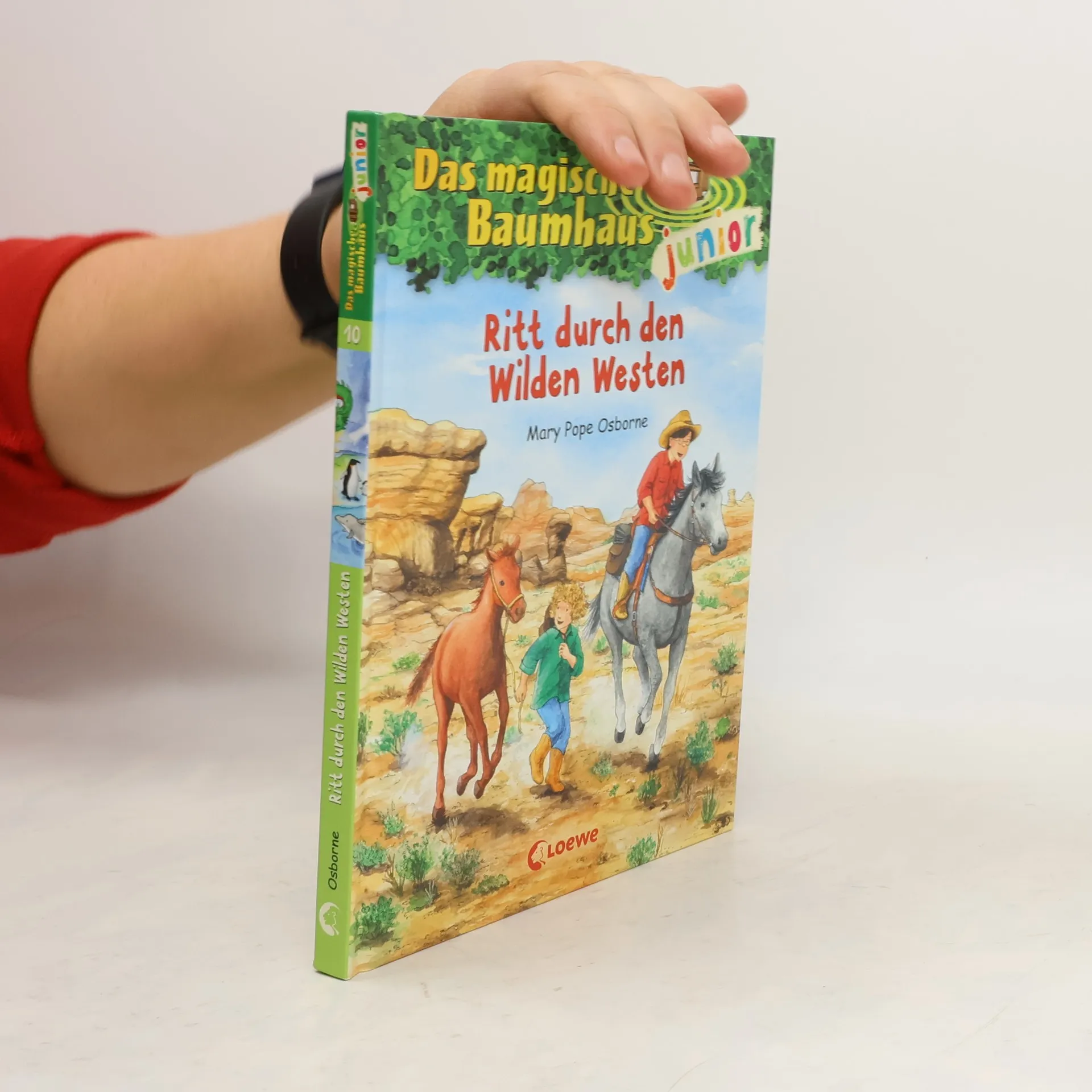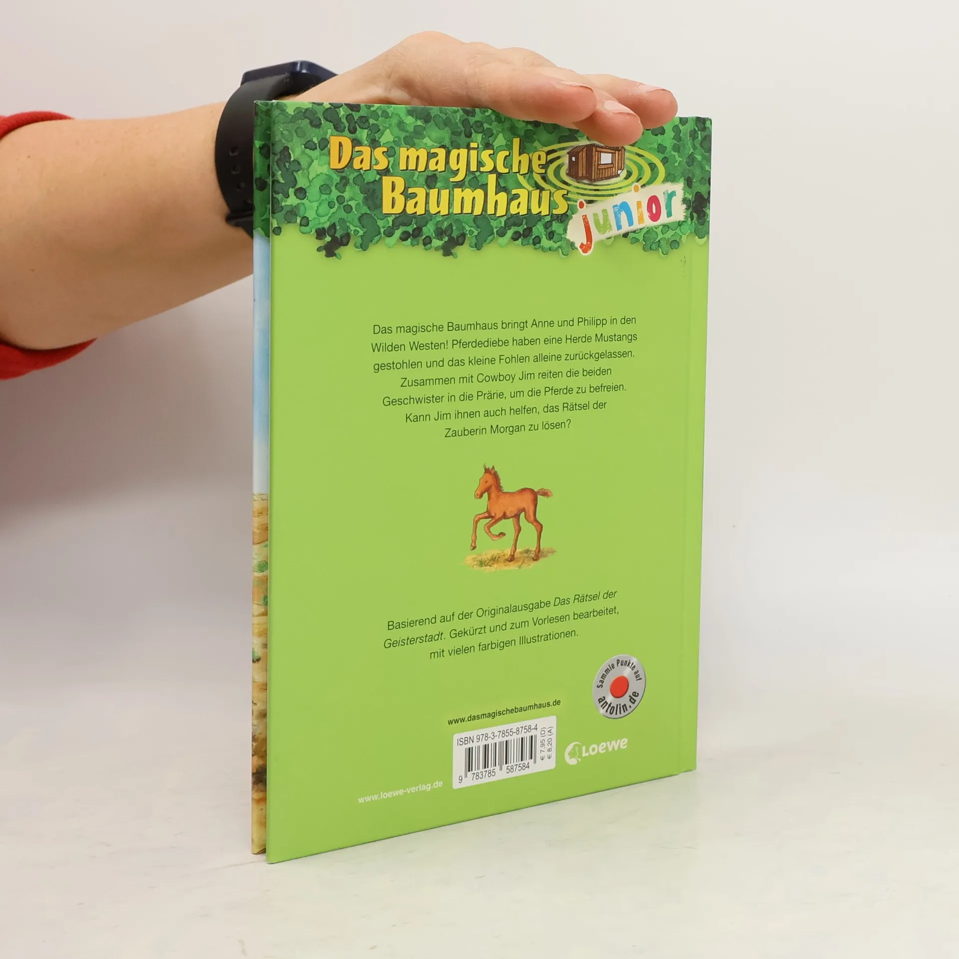 Das Buch ist bei deiner Buchhandlung vor Ort und bei vielen Online-Buchshops erhältlich! + Bücher, die Kinder gerne lesen wollen + Beliebte Themen: Abenteuer, Tiere, fremde Länder und der Wilde Westen + Hochwertiges Hardcover + Mit vielen Illustrationen + Bereits über 10 Millionen verkaufte Bücher der Baumhaus-Reihe + Ausgewogenes Text-Bild-Verhältnis + Große Schrift + Kurze Kapitel + Das magische Baumhaus bringt Anne und Philipp in den Wilden Westen! Pferdediebe haben eine Herde Mustangs gestohlen und das kleine Fohlen alleine zurückgelassen. Zusammen mit Cowboy Jim reiten die beiden Geschwister in die Prärie, um die Pferde zu befreien. Kann Jim ihnen auch helfen, Morgans Rätsel zu lösen? Basierend auf der Originalausgabe Das magische Baumhaus – „Das Rätsel der Geisterstadt“. Gekürzt und zum Vorlesen bearbeitet, mit vielen farbigen Illustrationen. Die beliebte Kinderbuch-Reihe von Bestsellerautorin Mary Pope Osborne zum Vorlesen und ersten Selberlesen. Die Geschwister Anne und Philipp reisen mit dem magischen Baumhaus durch die Zeit, entdecken ferne Länder und erleben spannende Abenteuer. Mit vielen bunten Bildern, besonders für Kinder ab 6 Jahren geeignet. Mehr Infos zur Reihe und tolle Extras unter: www. MagischesBaumhaus. de