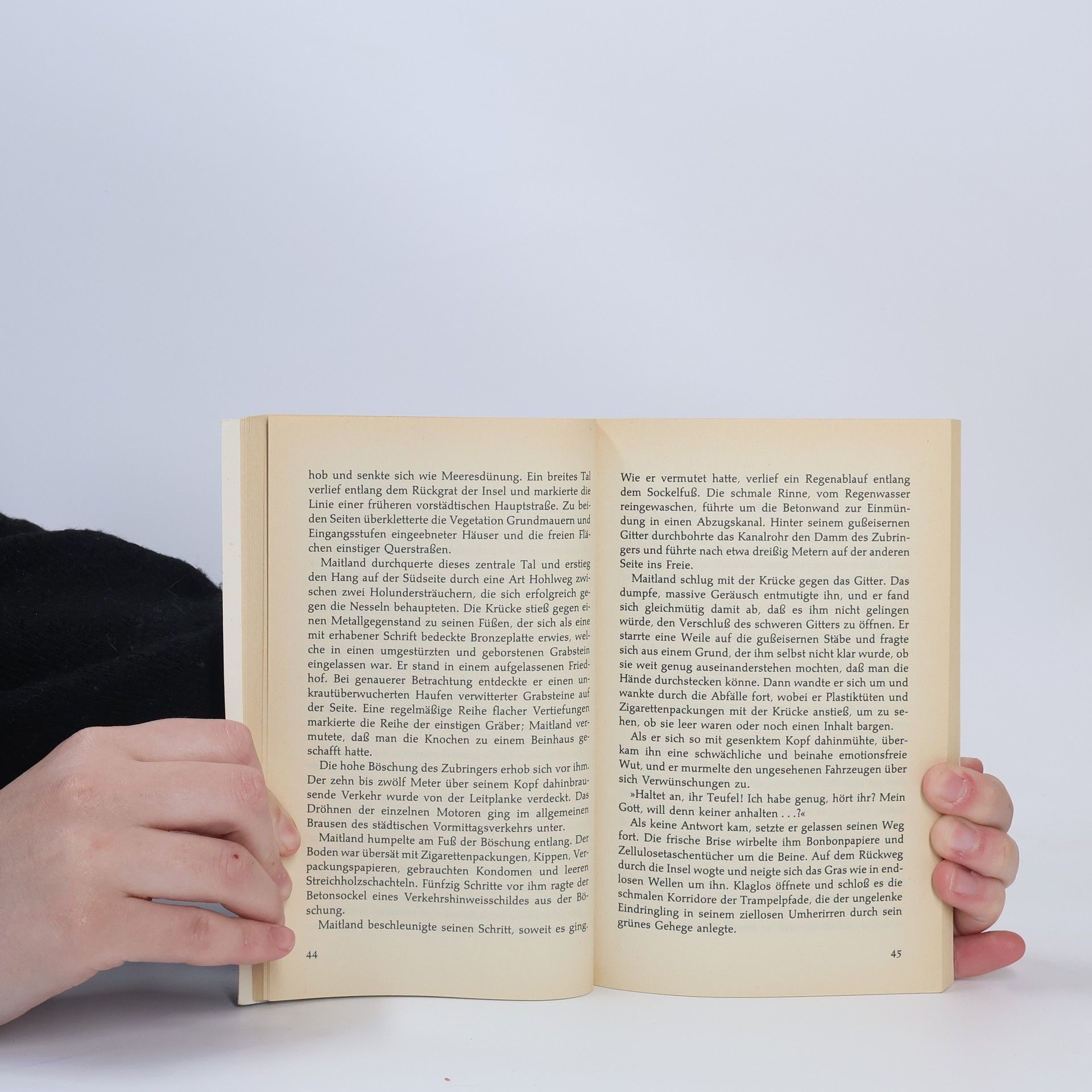 Auf dem Heimweg von seinem Büro in der Innenstadt hat der Architekt Robert Maitland, 35 Jahre alt, einen Verkehrsunfall. Sein Wagen durchbricht wegen überhöhter Geschwindigkeit die Leitplanke, rast eine zehn Meter hohe Böschung hinab und kommt auf einer von Autowracks und Abfällen übersäten Verkehrsinsel zum Stehen. Der Wagen ist schrottreif; er selbst spürt nur die leichte Benommenheit einer Gehirnerschütterung. Als er die Böschung ersteigt, um auf sich aufmerksam zu machen, wird er angefahren und verletzt. Er stürzt die Böschung hinunter und bleibt hilflos liegen. Seine Lage wird allmählich verzweifelt. Er ist auf einer Insel inmitten des dichtbefahrenen Autobahndreiecks gestrandet wie ein moderner Robinson Crusoe. Seine Hilferufe bleiben unbeachtet; man hält ihn für einen Penner, der in den Autowracks lebt, für einen Spaßvogel. Und eines Tages entdeckt er, daß er die Insel gar nicht allein bewohnt...