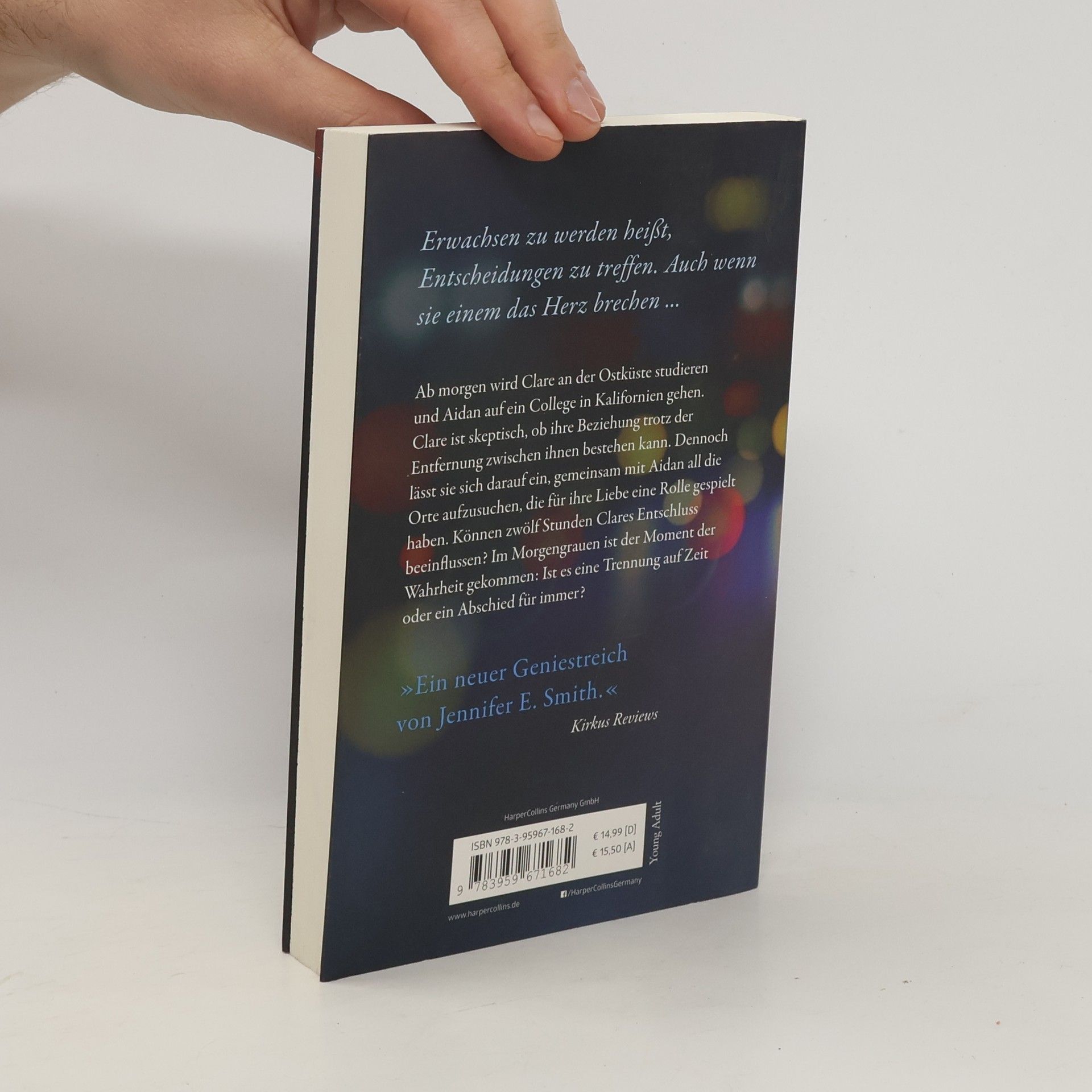 Ab morgen wird Clare an der Ostküste studieren und Aidan auf ein College in Kalifornien gehen. Clare ist skeptisch, ob ihre Beziehung trotz der Entfernung zwischen ihnen bestehen kann. Dennoch lässt sie sich darauf ein, gemeinsam mit Aidan all die Orte aufzusuchen, die für ihre Liebe eine Rolle gespielt haben. Können zwölf Stunden Clares Entschluss beeinflussen? Im Morgengrauen ist der Moment der Wahrheit gekommen: Ist es eine Trennung auf Zeit oder ein Abschied für immer? Smith ist ein echter Gewinn! VOYA Ein neuer cleverer Geniestreich von Jennifer E. Smith Kirkus Reviews