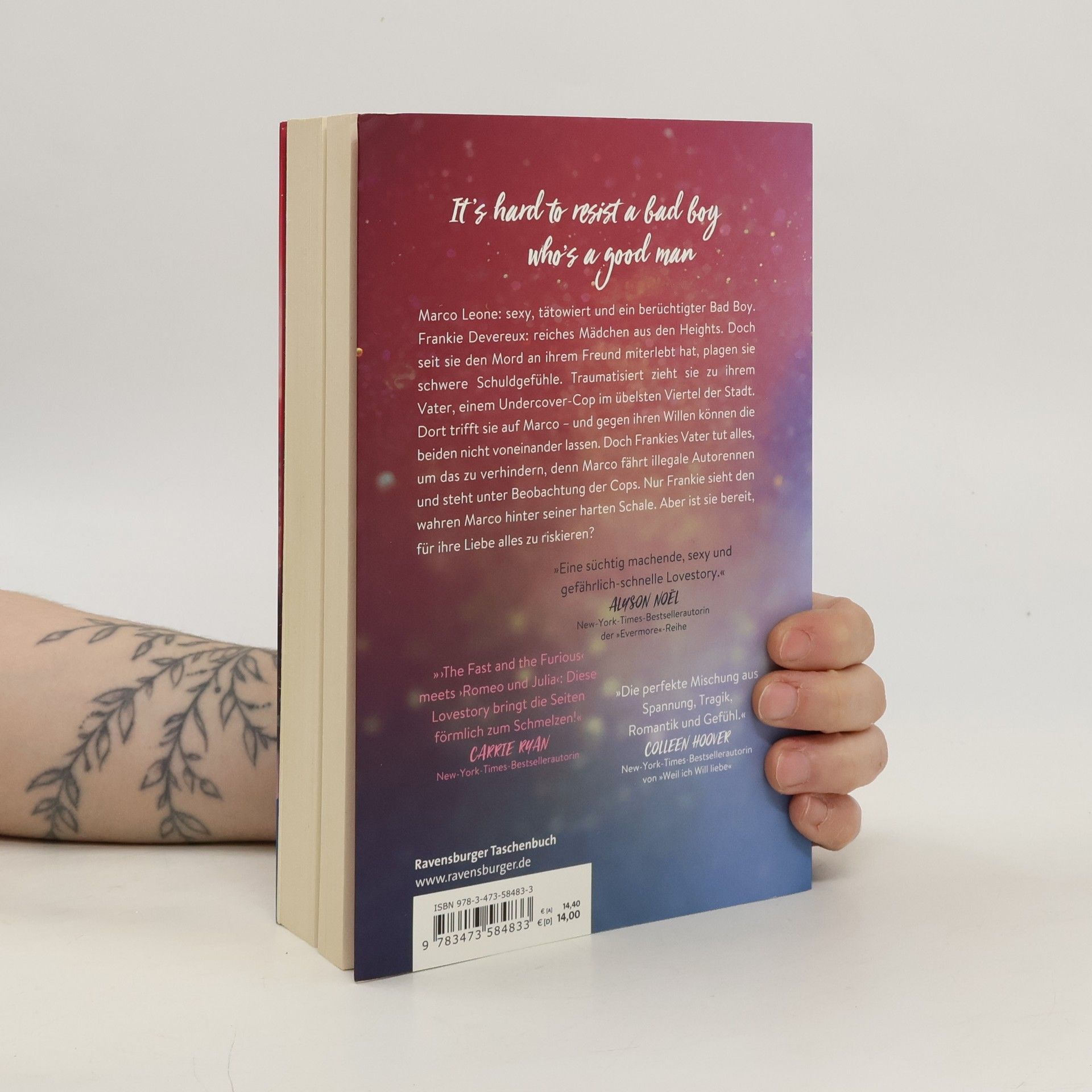 It's hard to resist a bad boy, who's a good man. Marco Leone: sexy, tätowiert und ein berüchtigter Bad Boy. Frankie Devereux: reiches Mädchen aus den Heights. Doch seit sie den Mord an ihrem Freund miterlebt hat, plagen sie schwere Schuldgefühle. Traumatisiert zieht sie zu ihrem Vater, einem Undercover-Cop im übelsten Viertel der Stadt. Dort trifft sie auf Marco – und gegen ihren Willen können die beiden nicht voneinander lassen. Doch Frankies Vater tut alles, um das zu verhindern, denn Marco fährt illegale Autorennen. Nur Frankie sieht hinter Marcos harte Schale. Aber ist sie bereit, für ihre Liebe alles zu riskieren? Lebe schnell, liebe gefährlich … »Ich mache dich nervös. Ist es das? Für dich bin ich Abschaum aus den Downs. Wir sind allein und es ist dunkel. Ich verstehe schon.« Er klingt verletzt.»Ich habe keine Angst vor dir.« Ich will von der Motorhaube rutschen, aber Marco beugt sich vor und legt seine Hände rechts und links von mir aufs Auto. Sein Blick wandert zu meinen Lippen. »Das hier macht dir also nichts aus?«Ich zwinge mich, in seine dunklen Augen zu schauen, und lasse es darauf ankommen. »Kein bisschen.«»Dann beweis es.« Ein Lächeln umspielt seine Mundwinkel. »Küss mich.«