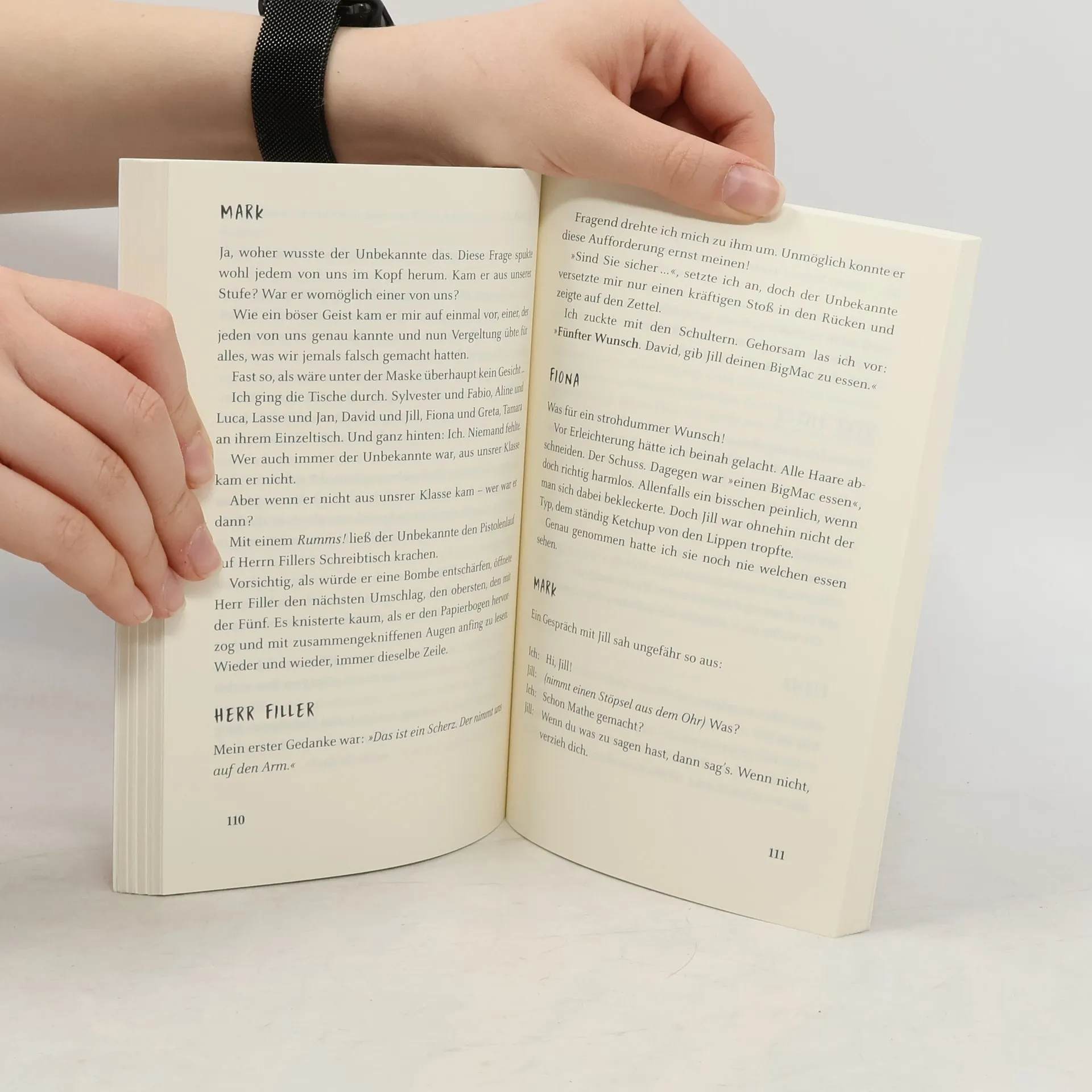 Amokalarm. Eine maskierte Person dringt ins Klassenzimmer ein und diktiert mit geladener Pistole Aufgaben, die erbarmungslos die Geheimnisse aller an die Oberfläche zerren. Arroganz, Diebstähle, Mitläufertum, Lügen – hinter sorgsam gepflegten Fassaden tun sich Abgründe auf. Fiona ist fassungslos, unfähig zu handeln, Mark verspürt Genugtuung und Herr Filler schwankt zwischen Wut und Passivität. Bald sind die Grenzen so weit überschritten, dass es für niemanden mehr ein Zurück gibt. Ein messerscharf komponiertes psychologisches Kammerspiel mit Thrillerfaktor!