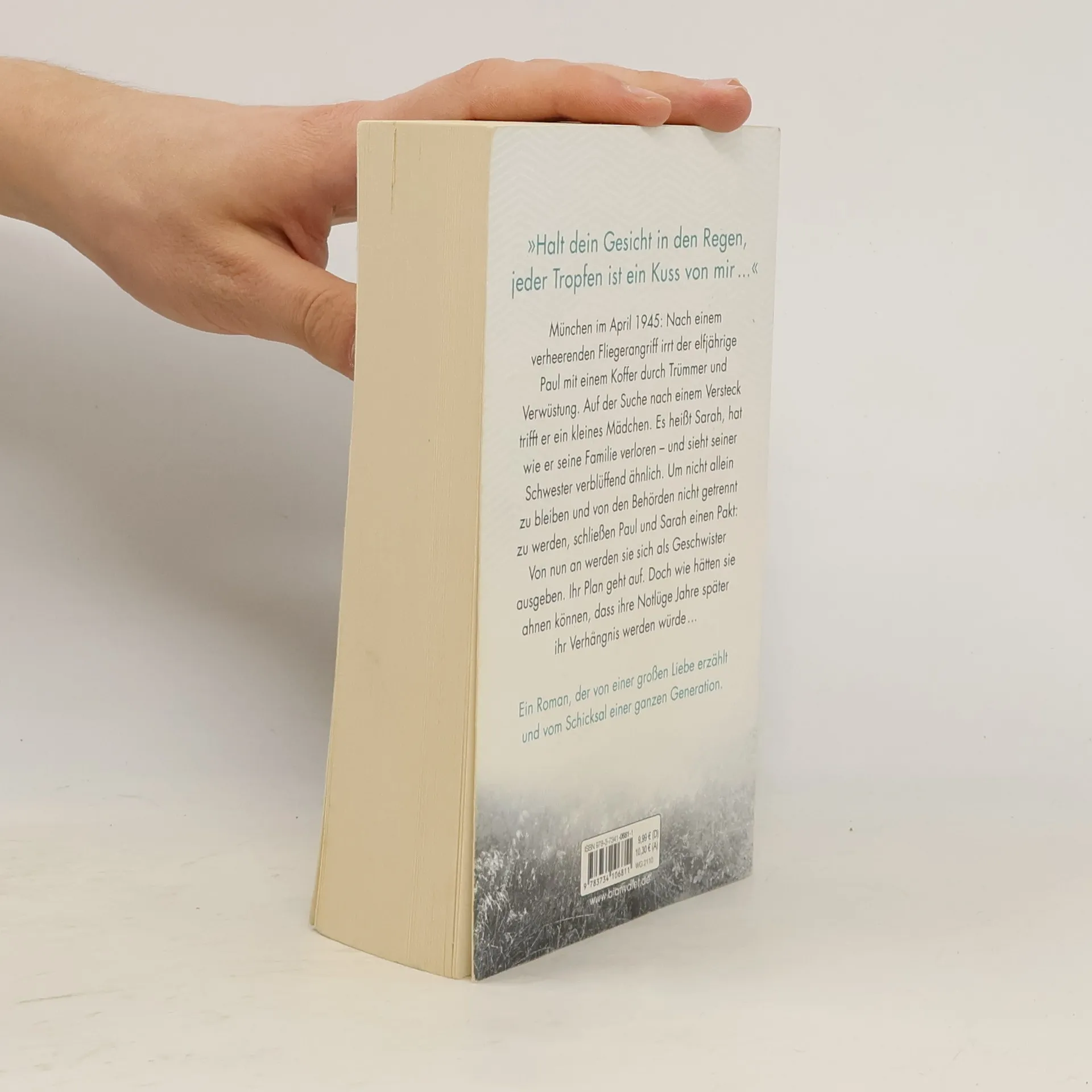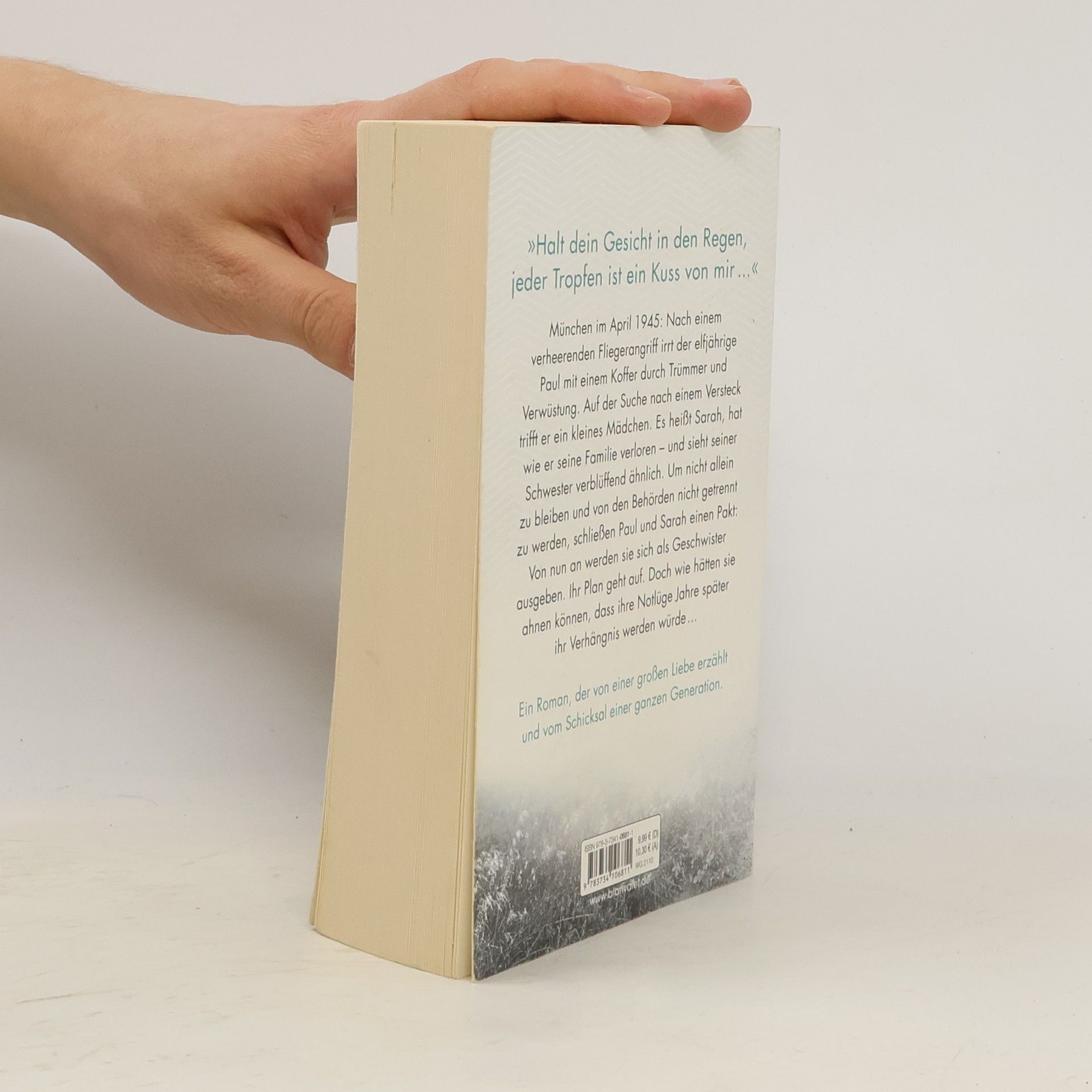 »Halt dein Gesicht in den Regen, jeder Tropfen ist ein Kuss von mir ...« München, April 1945. Nach einem verheerenden Fliegerangriff irrt der elfjährige Paul mit einem Koffer durch Trümmer und Verwüstung. Auf der Suche nach einem Versteck trifft er ein kleines Mädchen. Sie heißt Sarah, hat wie er ihre Familie verloren – und sieht seiner Schwester verblüffend ähnlich. Um nicht allein zu bleiben und von den Behörden nicht getrennt zu werden, schließen Paul und Sarah einen Pakt: Von nun an werden sie sich als Geschwister ausgeben. Ihr Plan geht auf. Doch wie hätten sie ahnen können, dass ihre Notlüge Jahre später ihr Verhängnis werden würde …
