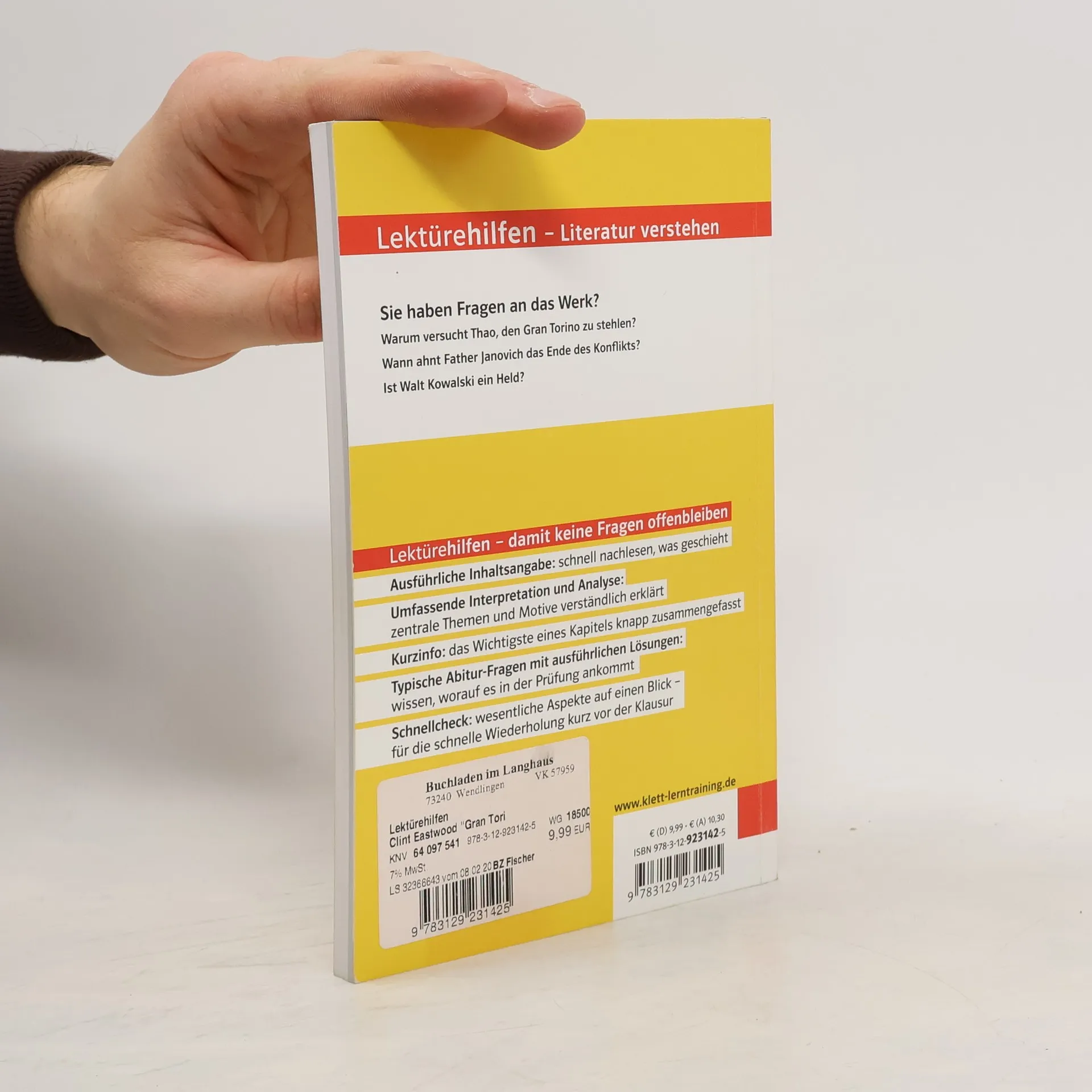 Do you have questions about the film? Why does Thao try to steal the Gran Torino? When does Father Janovich predict the end of the conflict? Is Walt Kowalski a hero? Lektürehilfen - damit keine Fragen offen bleiben! Ausführliche Inhaltsangabe : schnell nachlesen, was geschieht Umfassende Interpretation und Analyse : zentrale Themen und Motive verständlich erklärt Typische Abitur-Fragen mit ausführlichen Lösungen : wissen, worauf es in der Prüfung ankommt Schnellcheck : wesentliche Aspekte auf einen Blick – für die schnelle Wiederholung kurz vor der Klausur