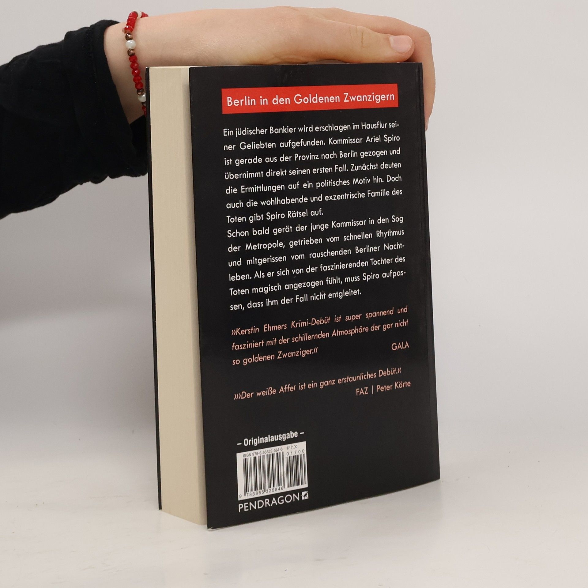 Ein jüdischer Bankier wird erschlagen im Hausflur seiner Geliebten aufgefunden. Kommissar Ariel Spiro ist gerade aus der Provinz nach Berlin gezogen und übernimmt direkt seinen ersten Fall. Zunächst deuten die Ermittlungen auf ein politisches Motiv hin. Doch auch die wohlhabende und exzentrische Familie des Toten gibt Spiro Rätsel auf. Schon bald gerät der junge Kommissar in den Sog der Metropole, getrieben vom schnellen Rhythmus und mitgerissen vom rauschenden Berliner Nachtleben. Als er sich von der faszinierenden Tochter des Toten magisch angezogen fühlt, muss Spiro aufpassen, dass ihm der Fall nicht entgleitet. "Die Fotografin Kerstin Ehmer, Betreiberin der Berliner Victoria Bar, erweist sich in ihrem Krimidebüt "Der weiße Affe" als gewiefte Erzählerin. In einer expressiven Sprache, fast an der Grenze zur Selbstparodie, entwirft sie ein grelles Bild der einzigen deutschen Metropole während ihrer wilden Jahre" (culturmag.de)