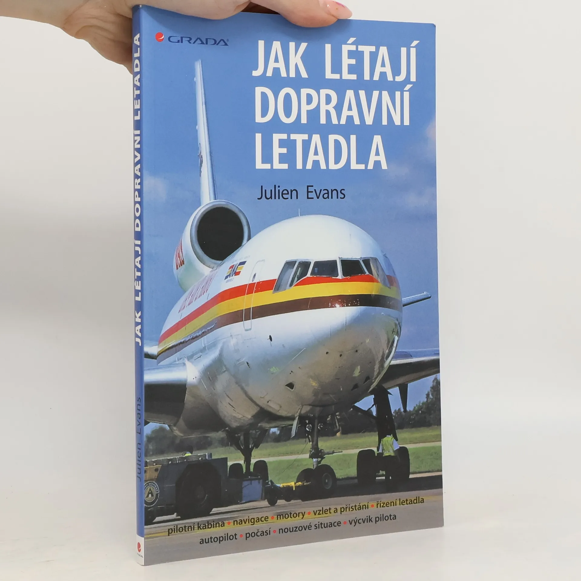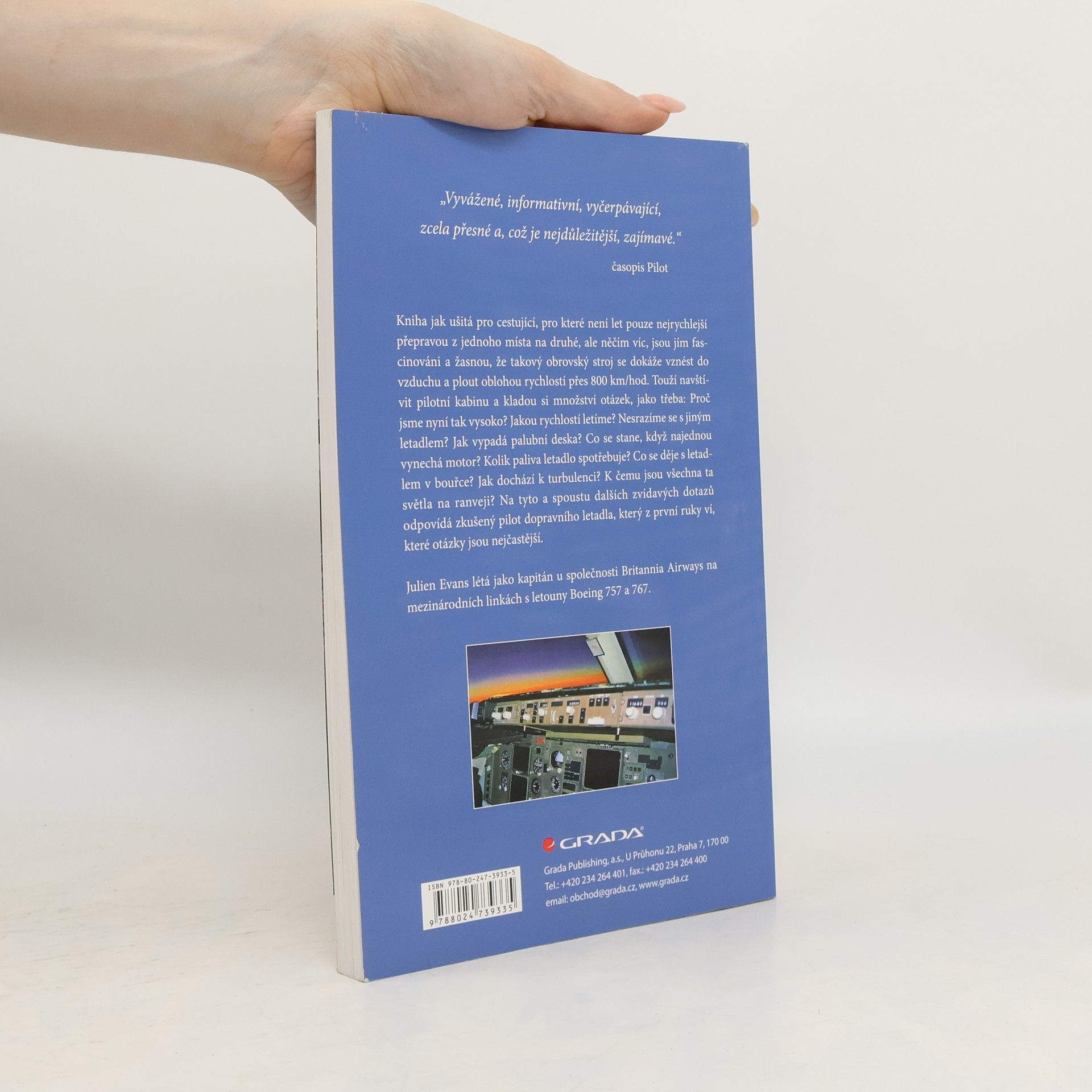 Kniha určená pro všechny, kdo se zajímají o letadla a chtějí se dozvědět vše podstatné o jejich provozu. Pro všechny ty, kdo jsou jimi fascinováni a žasnou, že stroj vážící kolem 400 tun se dokáže vznést do vzduchu a plout nebem rychlostí přes 800 km/hod. A jak ušitá pro cestující, pro které není let jen nejrychlejší přepravou z jednoho místa na druhé, ale chtějí znát o letadlu víc, touží nahlédnout do pilotovy kabiny a kladou si množství otázek, jako třeba: Proč jsme teď tak vysoko? Nesrazíme se s jiným letadlem? Jak vypadá palubní deska? Co se stane, když najednou vysadí motor? Kolik paliva letadlo spotřebuje? Co když vletíme do bouřky? Co je to autopilot? K čemu jsou ta světla na ranveji? atd. Odpovídá zkušený pilot dopravního letadla, text doprovází četné barevné fotografie a schémata.