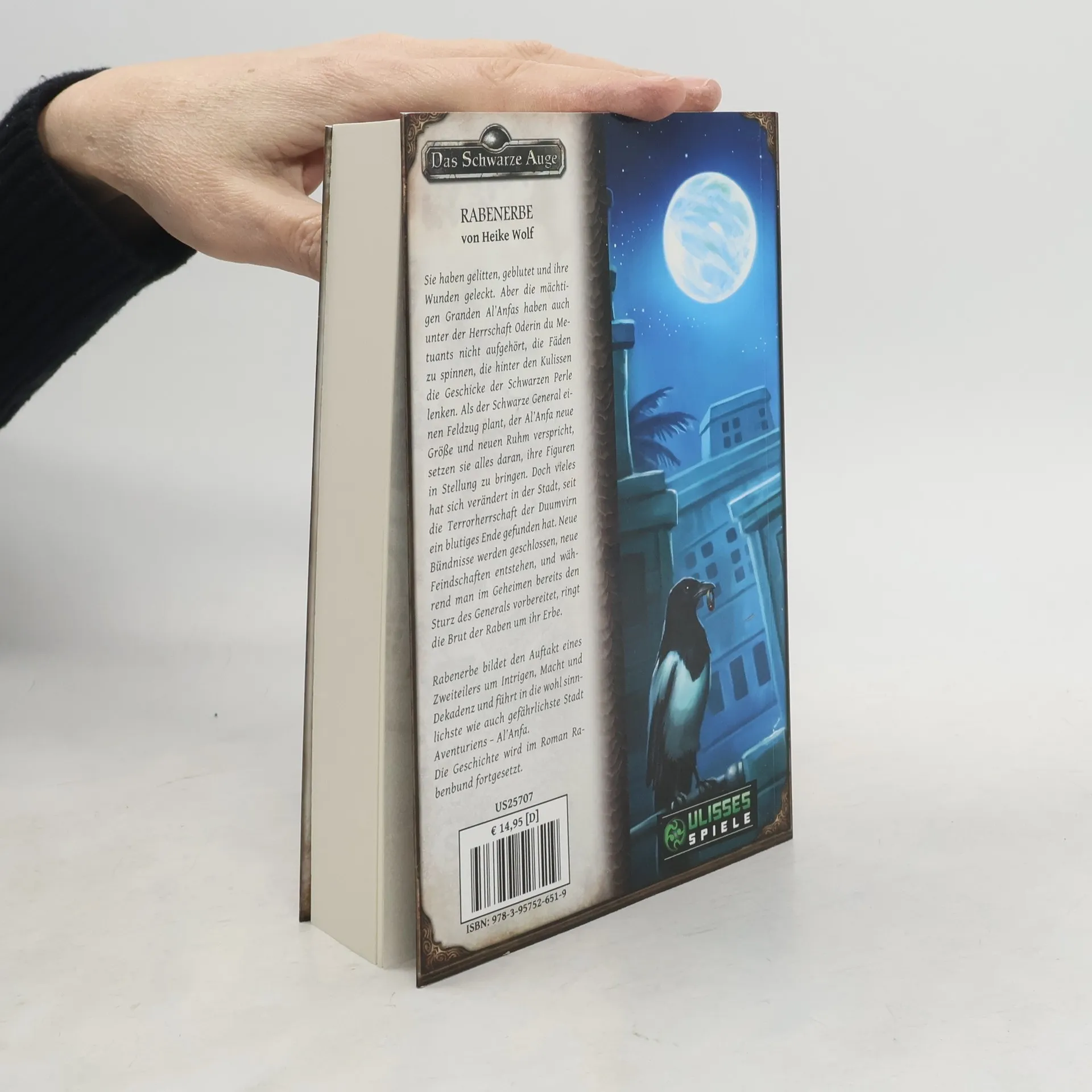 Sie haben gelitten, geblutet und ihre Wunden geleckt. Aber die mächtigen Granden AlAnfas haben auch unter der Herrschaft Oderin du Metuants nicht aufgehört, die Fäden zu spinnen, die hinter den Kulissen die Geschicke der Schwarzen Perle lenken. Als der Schwarze General einen Feldzug plant, der AlAnfa neue Größe und neuen Ruhm verspricht, setzen sie alles daran, ihre Figuren in Stellung zu bringen. Doch vieles hat sich verändert in der Stadt, seit die Terrorherrschaft der Duumvirn ein blutiges Ende gefunden hat. Neue Bündnisse werden geschlossen, neue Feindschaften entstehen, und während man im Geheimen bereits den Sturz des Generals vorbereitet, ringt die Brut der Raben um ihr Erbe. Rabenerbe bildet den Auftakt eines Zweiteilers um Intrigen, Macht und Dekadenz und führt in die wohl sinnlichste wie auch gefährlichste Stadt Aventuriens - AlAnfa. Die Geschichte wird im Roman Rabenbund fortgesetzt.