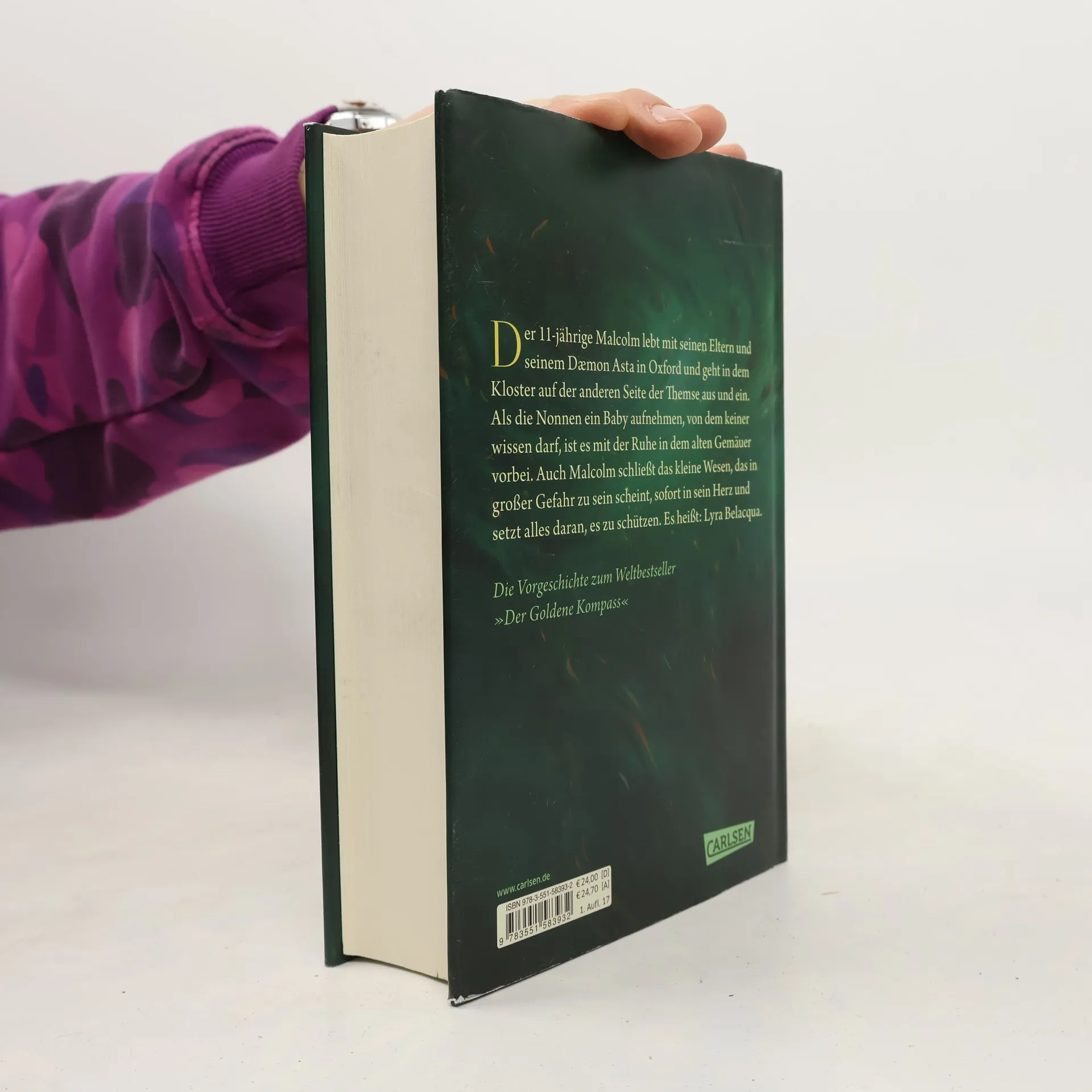 Der 11-jährige Malcolm lebt mit seinen Eltern und seinem Dæmon Asta in Oxford und geht in dem Kloster auf der anderen Seite der Themse aus und ein. Als die Nonnen ein Baby aufnehmen, von dem keiner wissen darf, ist es mit der Ruhe in dem alten Gemäuer vorbei. Auch Malcolm schließt das kleine Wesen, das in großer Gefahr zu sein scheint, sofort in sein Herz und setzt alles daran, es zu schützen. Es heißt: Lyra Belacqua. Die Vorgeschichte des Weltbestsellers »Der Goldene Kompass«. Alle Bände der unvergleichlichen Fantasy-Serie »His Dark Materials«: Über den wilden Fluss (Band 0) Der Goldene Kompass (Band 1) Das Magische Messer (Band 2) Das Bernstein-Teleskop (Band 3) Ans andere Ende der Welt (Band 4)