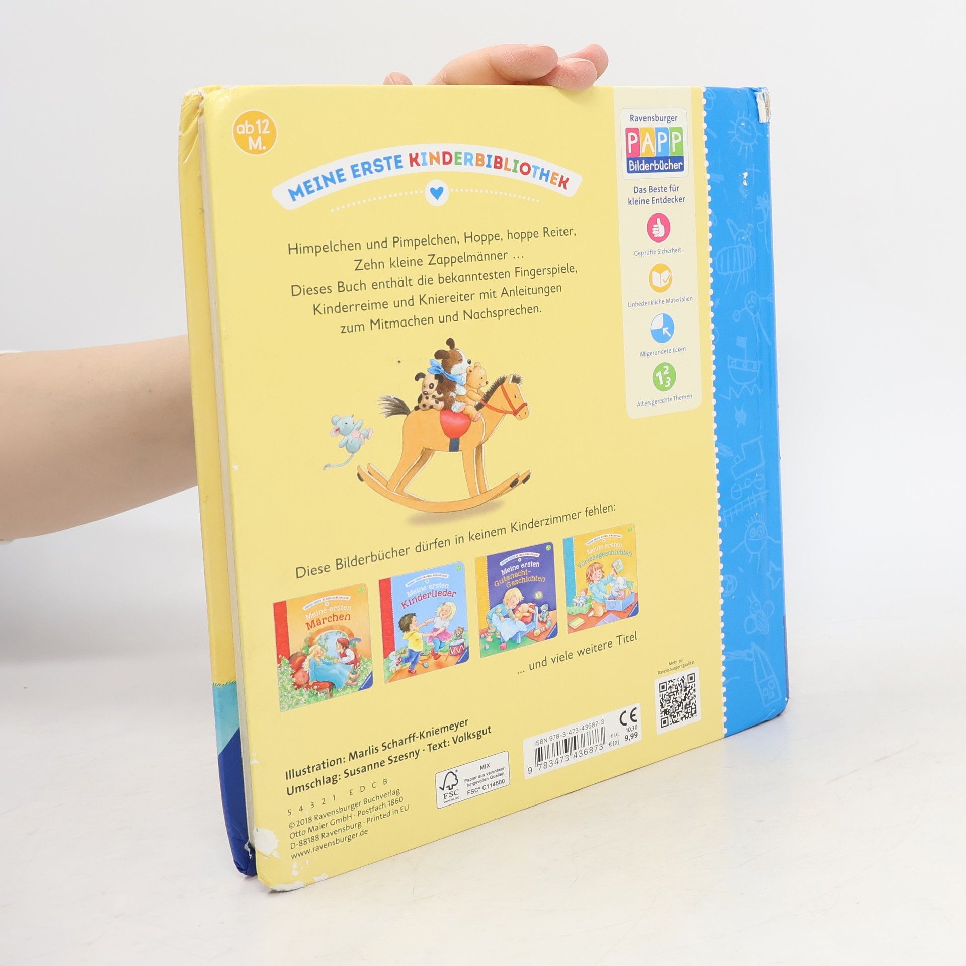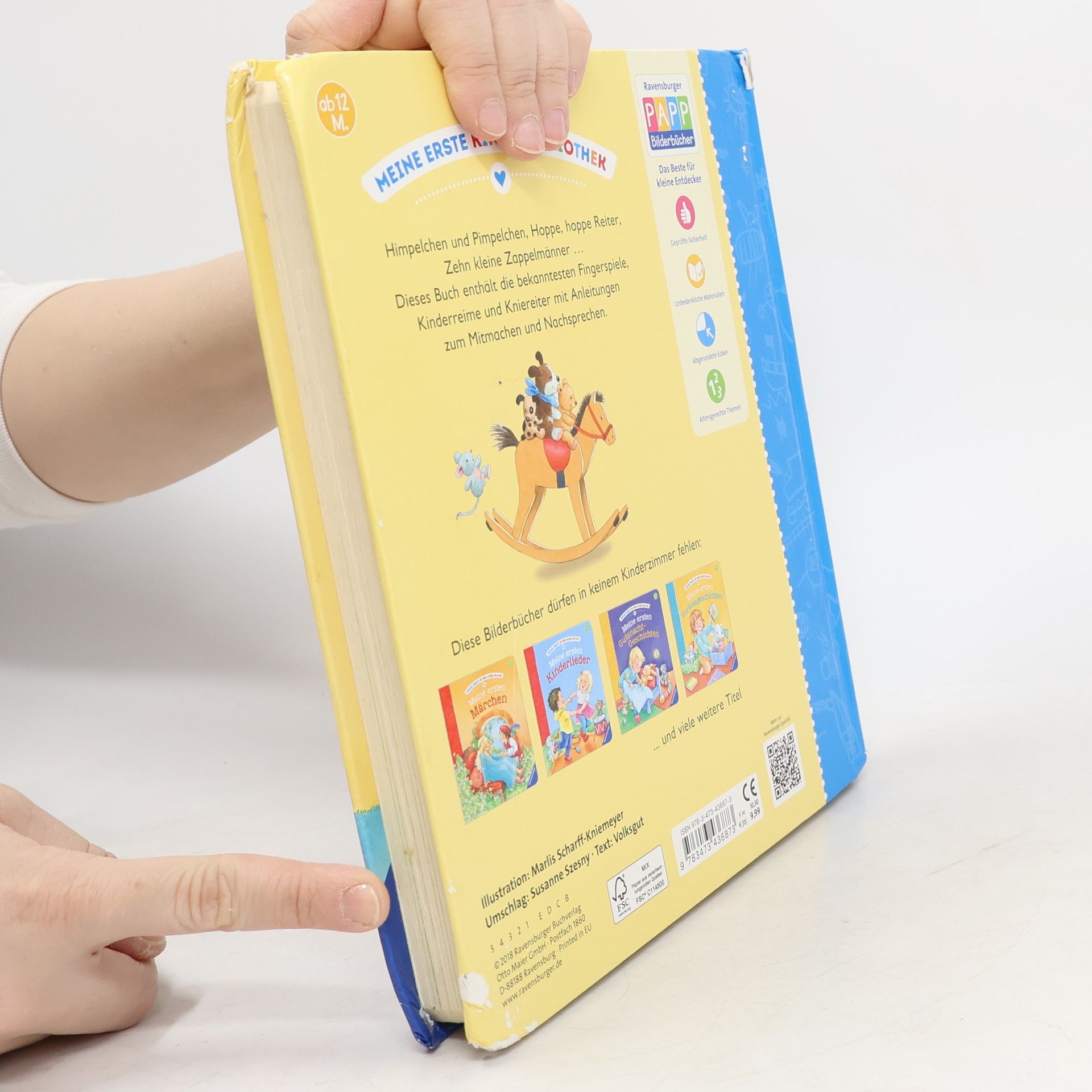 Diese 20 beliebten Fingerspiele, Kniereiterverse und Kinderreimen machen den Kleinsten Spaß und regen ihre Entwicklung an. Reime und Fingerspiele sind beliebte Rituale beim Wickeln und Schmusen und sie eignen sich zur Beschäftigung immer und überall. „Himpelchen und Pimpelchen“, „Das ist der Daumen“, „Hoppe, hoppe, Reiter“, „Heile, heile, Segen“, „Zehn kleine Zappelmänner“ und viele mehr Hier laden über 20 Fingerspiele, Kinderreime und Kniereiter zum Mitmachen und Nachsprechen ein. Kinder ab 12 Monaten finden hier die bekanntesten und beliebtesten Reime zum Trösten, Kuscheln, Lachen und Einschlafen. Dank der einfachen Anleitungen sind die Spiele für jeden verständlich. Ob bei der Babymassage, beim Wickeln oder einfach zwischendurch: Die Bücher der Ravensburger Kinderzimmerbibliothek dürfen in keinem Kinderzimmer fehlen.
