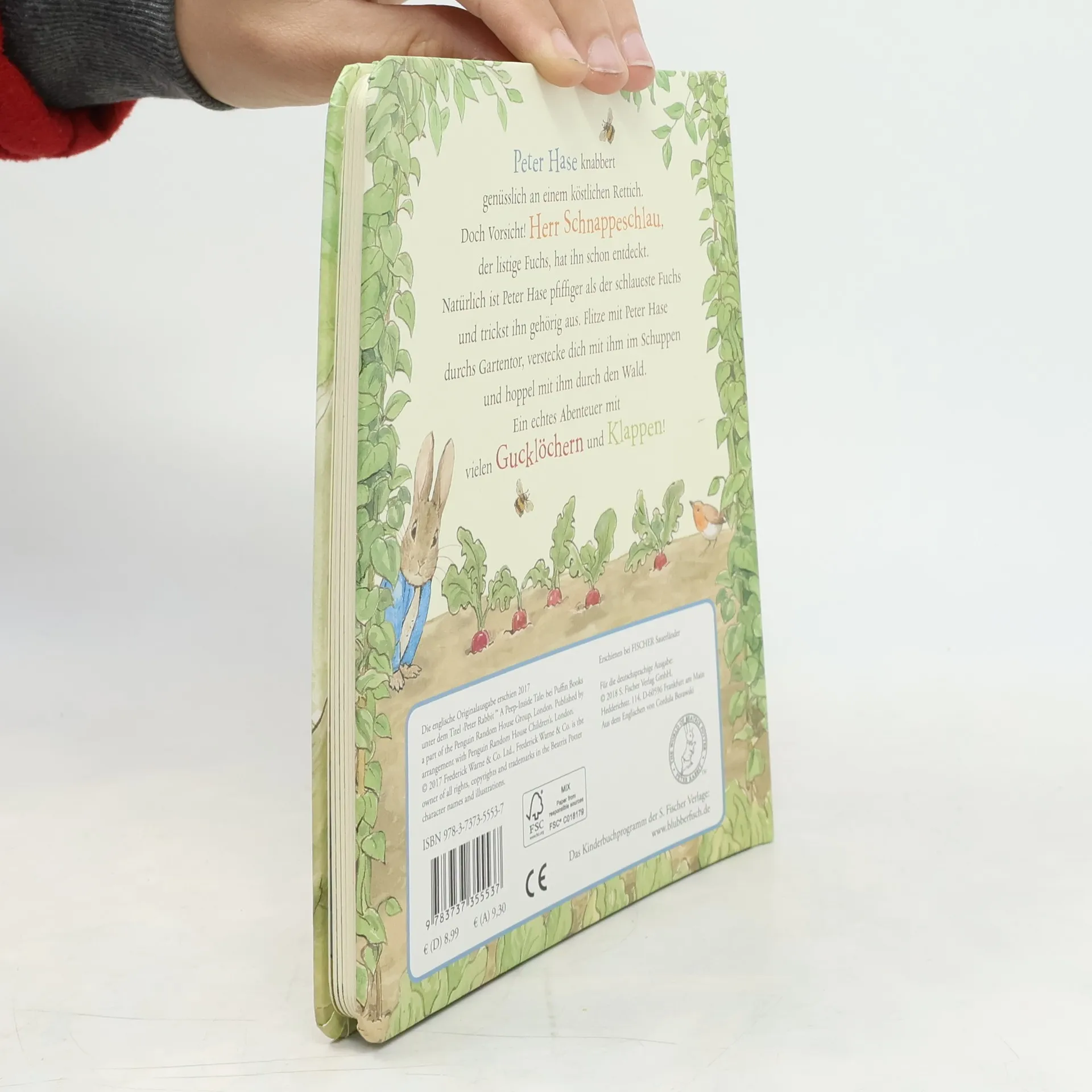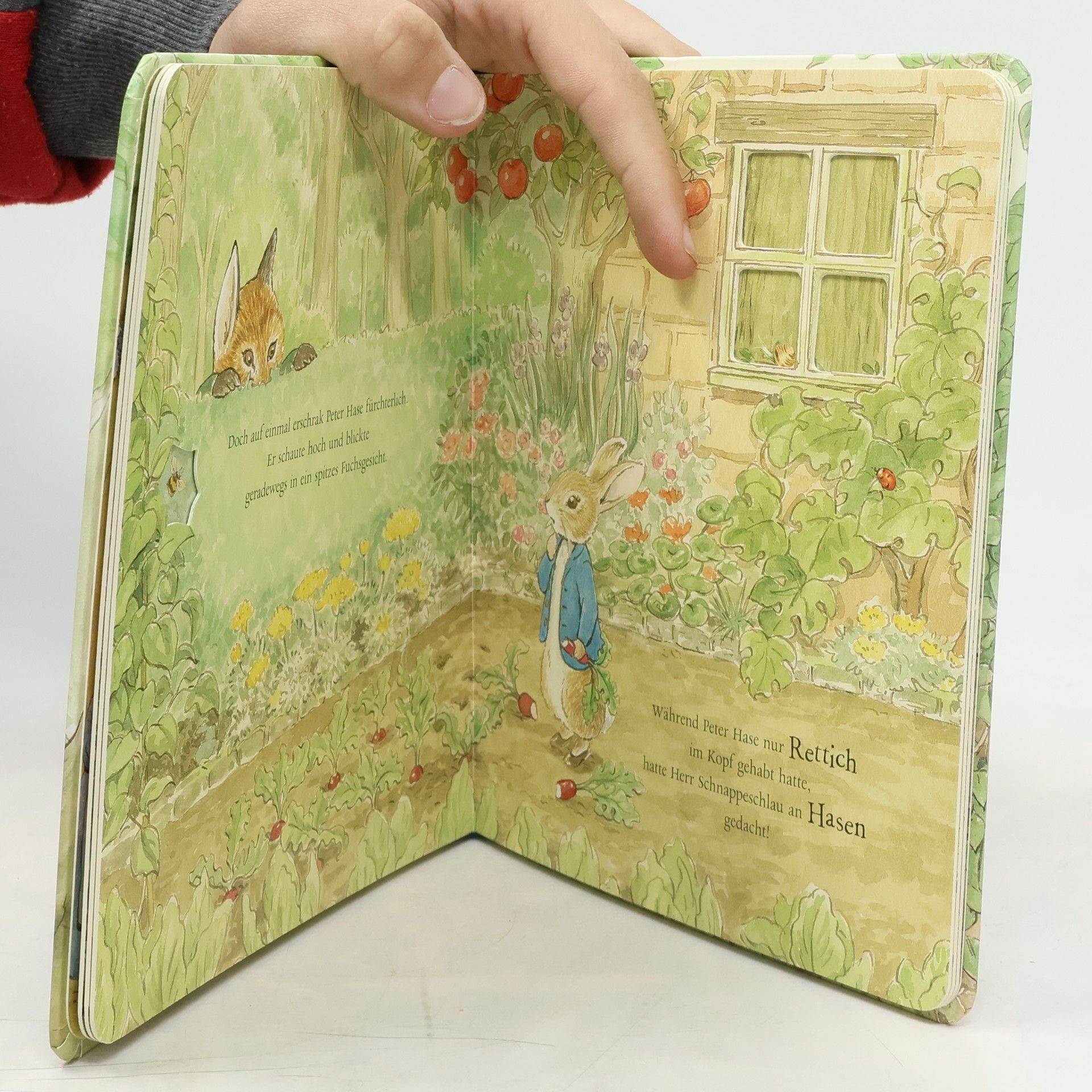 Der Klassiker. Ein Abenteuer mit Peter Hase Für alle Beatrix Potter Fans gibt es ein besonderes Peter Hase Abenteuer. Peter Hase soll Rettich aus dem Gemüsegarten holen. »Aber nimm dich in Acht vor dem Fuchs«, mahnt seine Mutter. Mutig schlüpft Peter Hase durch das Gartentor und findet lauter köstliche Dinge. Kohl, Bohnen und sooo viel Rettich. Genüsslich nascht er schon mal ein bisschen und merkt dabei nicht, wie der Fuchs ihm auflauert. Aber auch Peter Hase ist schlau und kann den Fuchs überlisten. Ein Pappbilderbuch mit vielen Gucklöchern , durch die man hindurch schauen und das Abenteuer von Peter Hase verfolgen kann. Durch sie kann man hinter Büsche schauen und durch das Schuppenfenster sehen. Ideal für das Osternest.