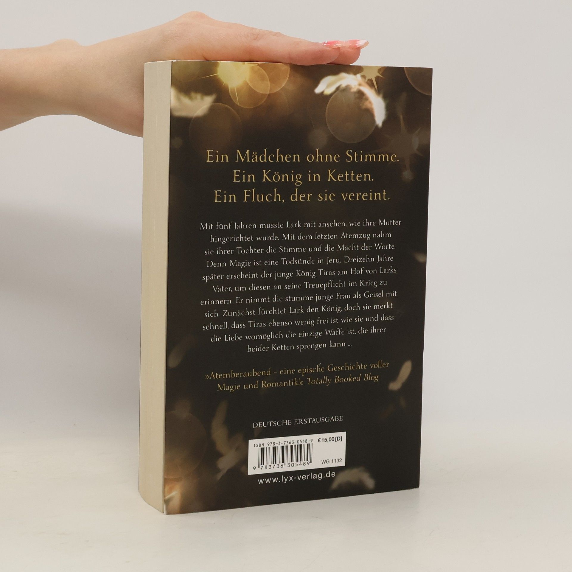 Ein Mädchen ohne Stimme. Ein König in Ketten. Ein Fluch, der sie vereint. Mit fünf Jahren musste Lark mit ansehen, wie ihre Mutter vor ihren Augen hingerichtet wurde. Mit dem letzten Atemzug nahm sie ihrer Tochter die Stimme und die Macht der Worte. Denn Magie ist eine Todsünde in Jeru. Dreizehn Jahre später erscheint der junge König Tiras am Hof von Larks Vater, um diesen an seine Treuepflicht im Krieg zu erinnern. Er nimmt die stumme junge Frau als Geisel mit sich. Zunächst fürchtet Lark den König, doch sie merkt schnell, dass Tiras ebenso wenig frei ist wie sie und dass die Liebe womöglich die einzige Waffe ist, die ihrer beider Ketten sprengen kann. "Atemberaubend - eine epische Geschichte voller Magie und Romantik!" Totally Booked Blog