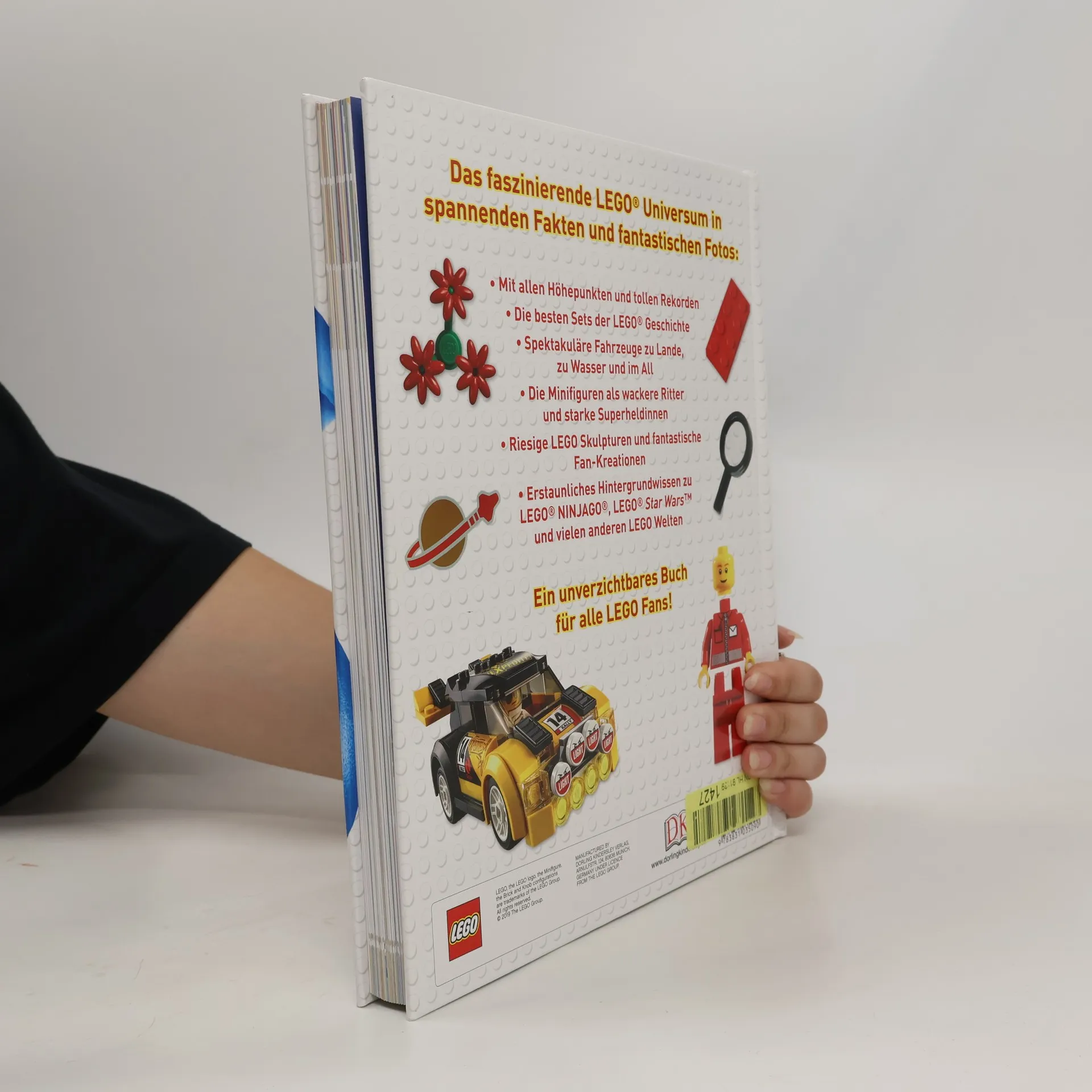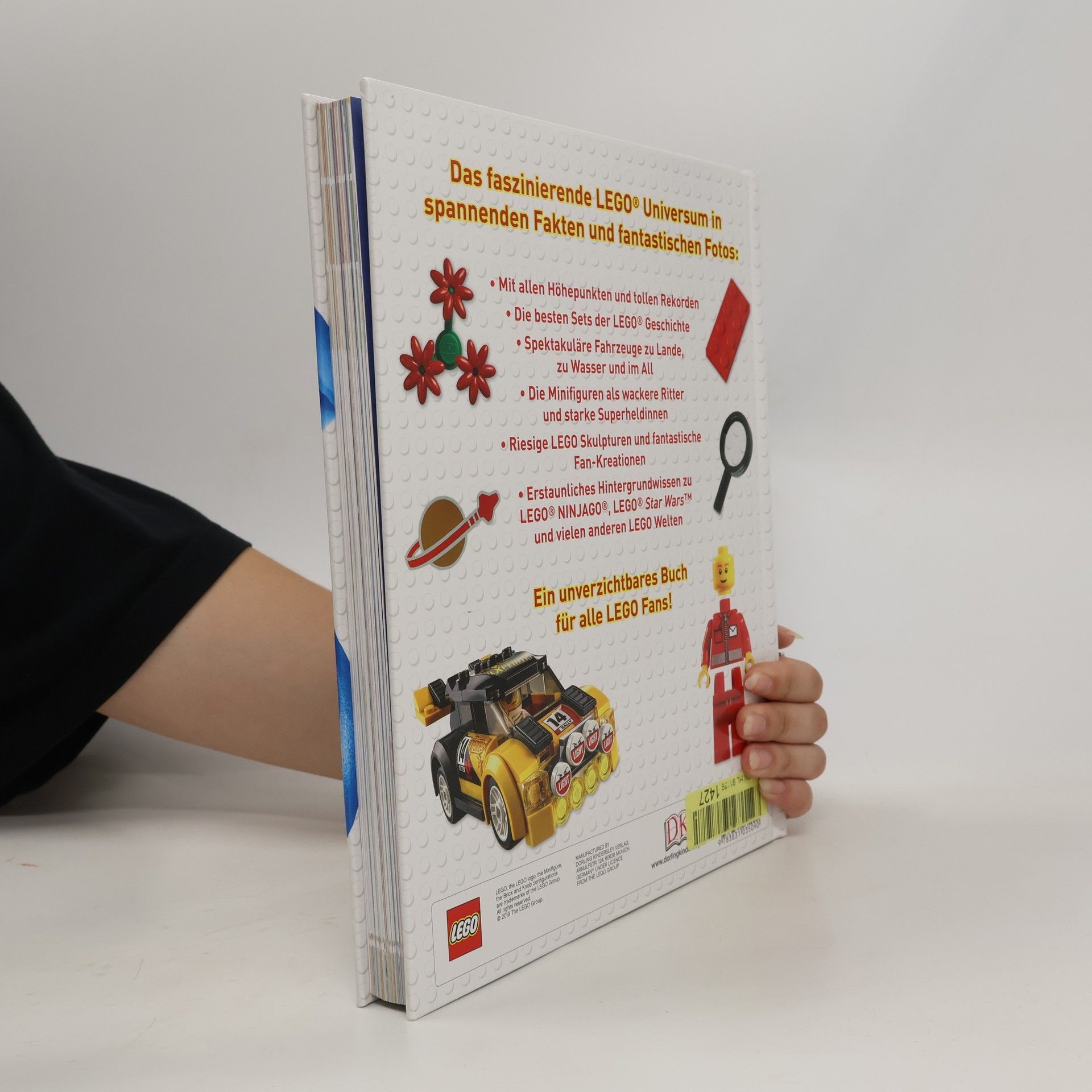Dieses LEGO® Buch ist ein unentbehrlicher Begleiter für Fans! Hier gibt es erstaunliche Fakten zum gesamten LEGO® Universum: umfassendes und beeindruckendes Wissen über LEGO® Bausteine und Teile, Fahrzeuge, Figuren oder Monster in fünf großen, reich bebilderten Kapiteln rund um die LEGO® Themenwelten. Mit verblüffenden Vergleichen, witzigen Hintergründen, Top-Listen, Stein-Statistiken und lustigen Kommentaren von den beliebten Minifiguren – alles verpackt unter einem tollen Cover mit Noppenprägung. In coolen Rubriken wie „Faktenstapel“, „Schau genau“, „Wahnsinn“ oder „Echt?“ werden spannende Details enthüllt. Auf den Seiten dieses grandiosen LEGO® Buchs kommt man aus dem Staunen gar nicht mehr heraus: Wer wusste zum Beispiel, dass ein LEGO® Modell an Bord der Discovery 8,5 Kilometer durchs All geflogen ist? Oder, dass der größte echte LEGO® Turm 35 Meter hoch war und damit einen Weltrekord erzielte? Von der Holzente als erstes Spielzeug über bekannte Sets bis zu den eigenen TV-Serien und LEGO® Movies versammelt sich hier die ganze LEGO® Welt in einem Buch!