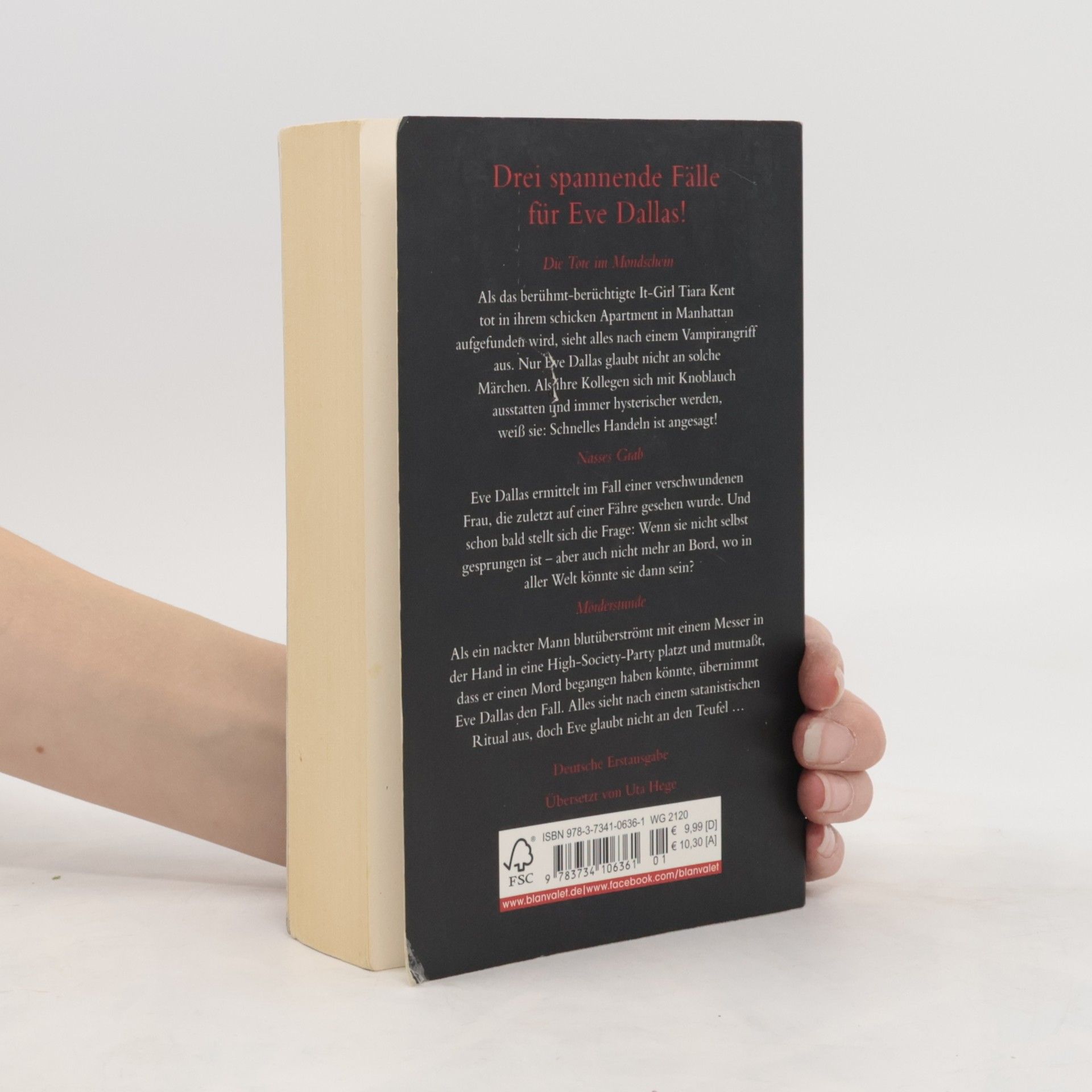 Drei spannende Fälle für Eve Dallas! Die Tote im Mondschein Als das berühmt-berüchtigte It-Girl Tiara Kent tot in ihrem schicken Apartment in Manhattan aufgefunden wird, sieht alles nach einem Vampirangriff aus. Nur Eve Dallas glaubt nicht an solche Märchen. Als ihre Kollegen sich mit Knoblauch ausstatten und immer hysterischer werden, weiß sie: Schnelles Handeln ist angesagt! Nasses Grab Eve Dallas ermittelt im Fall einer verschwundenen Frau, die zuletzt auf einer Fähre gesehen wurde. Und schon bald stellt sich die Frage: Wenn sie nicht selbst gesprungen ist – aber auch nicht mehr an Bord, wo in aller Welt könnte sie dann sein? Mörderstunde Als ein nackter Mann blutüberströmt mit einem Messer in der Hand in eine High-Society-Party platzt und mutmaßt, dass er einen Mord begangen haben könnte, übernimmt Eve Dallas den Fall. Alles sieht nach einem satanistischen Ritual aus, doch Eve glaubt nicht an den Teufel … Schnell ermittelt, rasant erzählt: Weitere Fälle für Eve Dallas und ihr Team finden Sie auch in »Mörderlied« und »Mörderspiele«!