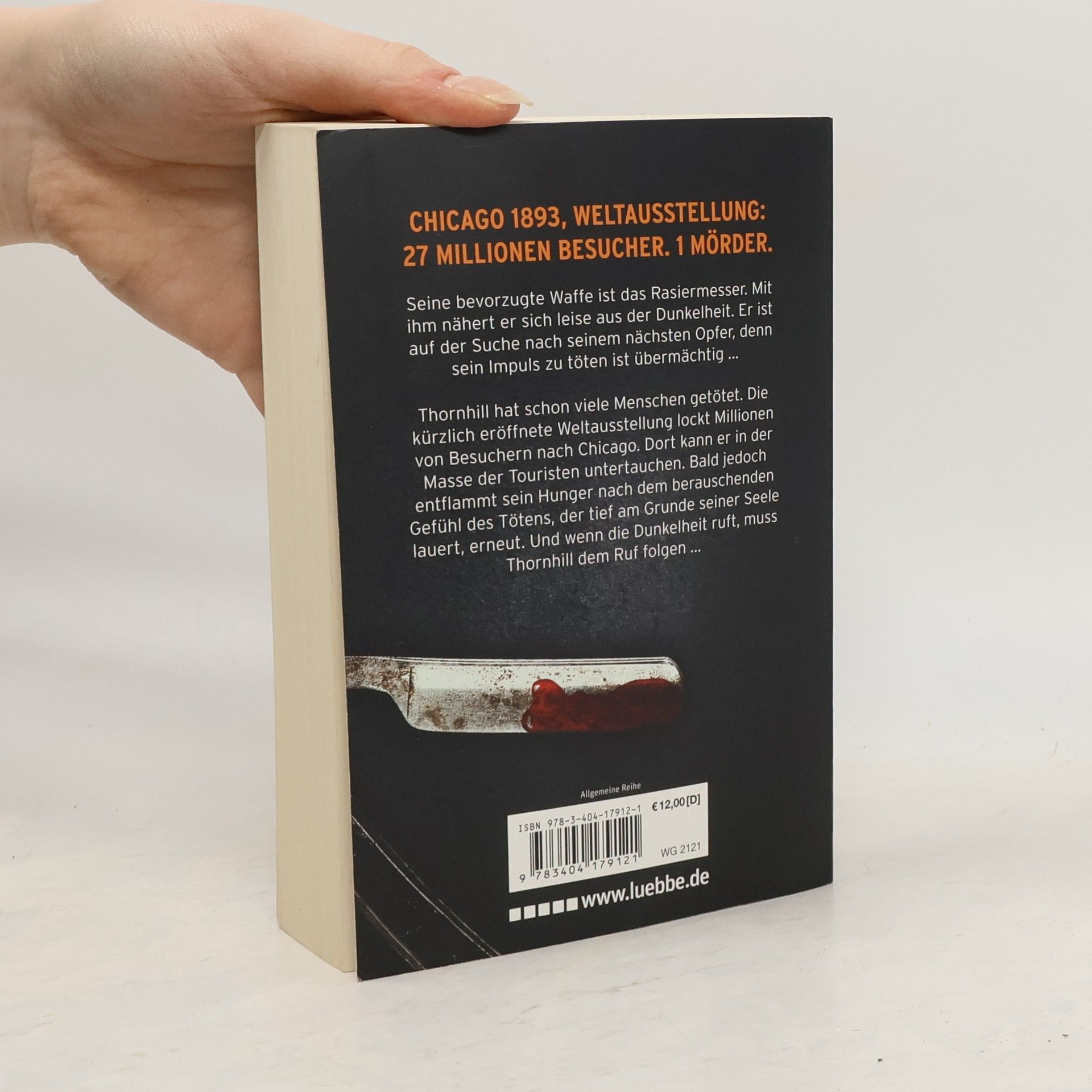 Seine bevorzugte Waffe ist das Rasiermesser. Mit ihm nähert er sich leise aus der Dunkelheit. Er ist auf der Suche nach seinem nächsten Opfer, denn sein Impuls zu töten ist übermächtig ... Thornhill hat schon viele Menschen getötet. Die kürzlich eröffnete Weltausstellung lockt Millionen von Besuchern nach Chicago. Dort kann er in der Masse der Touristen untertauchen. Bald jedoch entflammt sein Hunger nach dem berauschenden Gefühl des Tötens, der tief am Grunde seiner Seele lauert, erneut. Und wenn die Dunkelheit ruft, muss Thornhill dem Ruf folgen ...