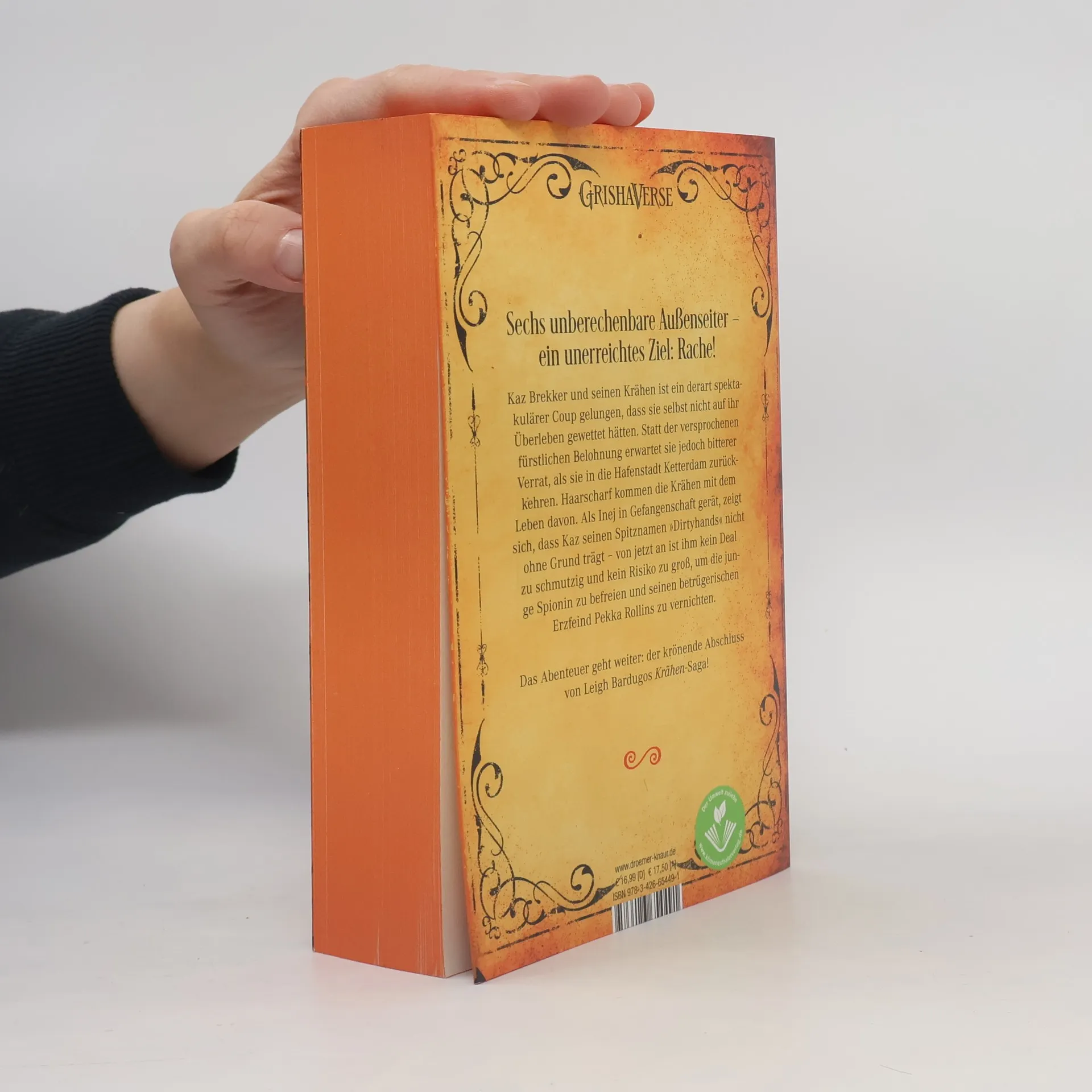 Sechs unberechenbare Außenseiter verfolgen ein unerreichbares Ziel: Rache! Das Abenteuer geht weiter mit einem Dieb, der die unwahrscheinlichsten Auswege findet, einer geheimnisvollen Spionin, einem verurteilten Rachesuchenden, einer Magierin, die ihre Kräfte im Slum einsetzt, einem risikofreudigen Scharfschützen und einem Ausreißer mit Talent für Sprengstoff. Kaz Brekker und seine Krähen haben einen spektakulären Coup gelandet, den sie selbst nicht für möglich gehalten hätten. Doch anstelle der versprochenen Belohnung erwartet sie bitterer Verrat bei ihrer Rückkehr nach Ketterdam. Nur mit knapper Not entkommen sie dem Tod, doch Kaz' Geliebte Inej wird gefangen genommen. Kaz, bekannt als "Dirtyhands", ist bereit, alles zu riskieren, um Inej zu befreien und seinen betrügerischen Erzfeind Pekka Rollins zu vernichten. Das packende Finale dieser Fantasy-Geschichte verspricht Nervenkitzel und unvorhersehbare Wendungen, während die Krähen alles auf eine Karte setzen, um ihre Ziele zu erreichen und sich den Herausforderungen zu stellen, die vor ihnen liegen.