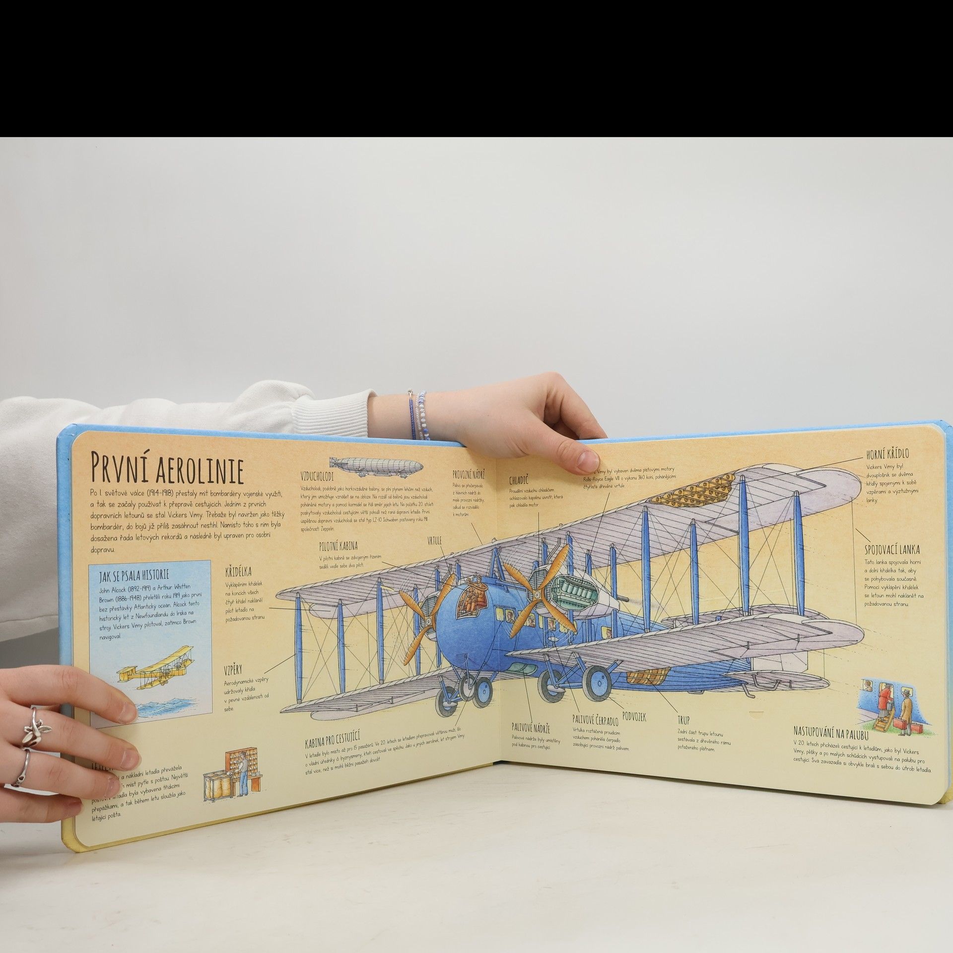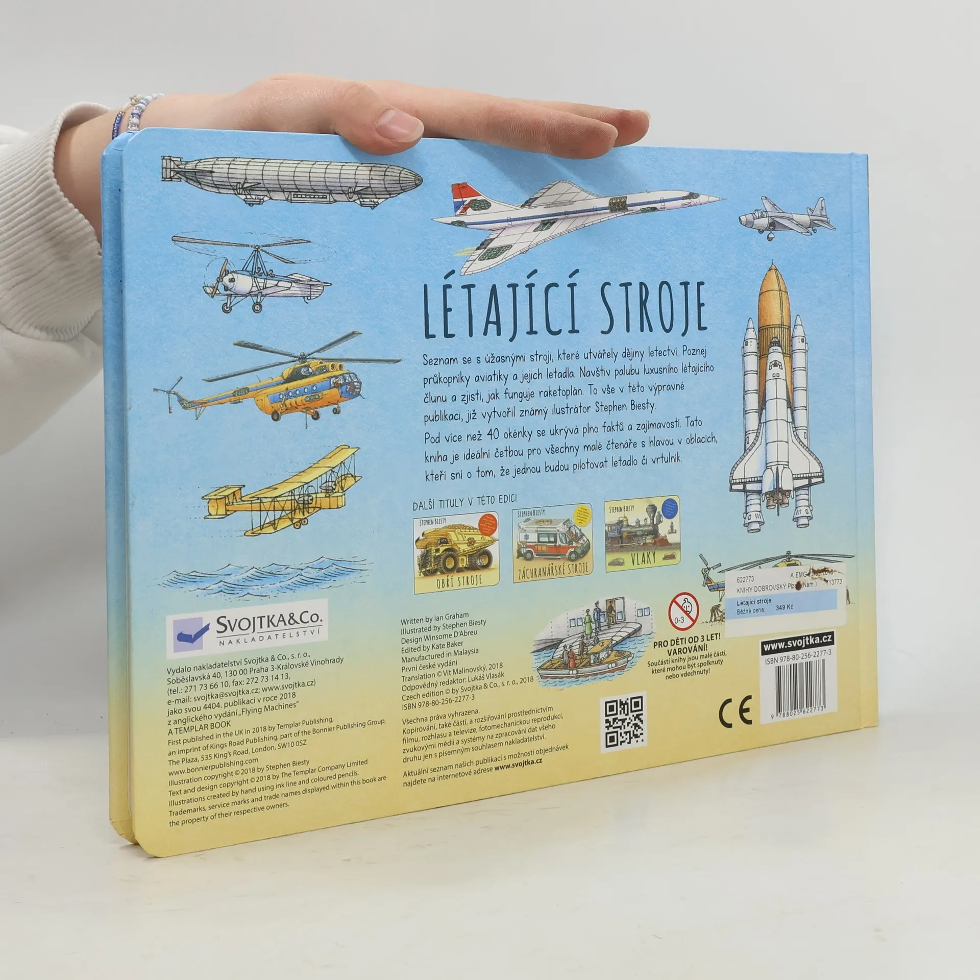Máš rád letadla? Zajímá tě historie, současnost i budoucnost létání? Prostřednictvím této zajímavé a informativní knížky pro malé letecké nadšence se seznámíš s osmi různými stroji, které můžeš potkat ve vzduchu. Od nejstarších letuschopných strojů přes vrtulníky, trysková letadla až po současná letadla převážející na velké vzdálenosti stovky cestujících. Svět letadel ještě nikdy nebyl tak přehledný a zábavný. Nahlédni pod jedno z mnoha odklápěcích okének a zjistíš, co se skrývá uvnitř nadzvukového letadla či raketoplánu. Jaké povinnosti mají pilot, stevard a letecký mechanik? Podívej se pod okénko a staň se jedním z nich. Slyšíš? To se točí vrtule a tvůj let právě začíná!