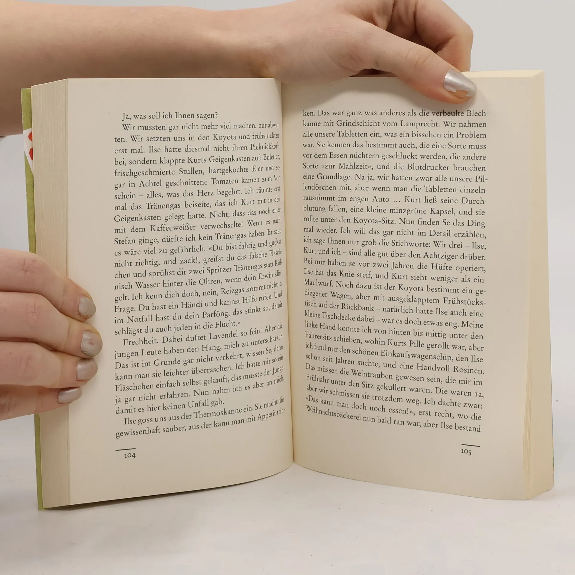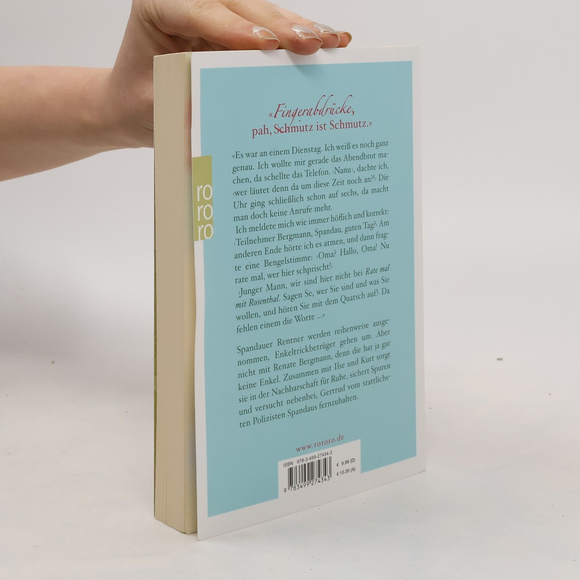 «Fingerabdrücke, pah. Schmutz ist Schmutz.» «Es war an einem Dienstag. Ich weiß es noch ganz genau. Ich wollte mir gerade das Abendbrot machen, da schellte das Telefon. ‹Nanu›, dachte ich, ‹wer läutet denn da um diese Zeit noch an?!›. Die Uhr ging schließlich schon auf sechs, da macht man doch keine Anrufe mehr. Ich meldete mich wie immer höflich und korrekt: ‹Teilnehmer Bergmann, Spandau, Guten Tag?›. Am anderen Ende hörte ich es atmen, und dann fragte eine Bengelstimme: ‹Oma? Hallo, Oma! Nu rate mal, wer hier schprischt!›‹Junger Mann, wir sind hier nicht bei Rate mal mit Rosenthal. Sagen Se, wer Sie sind und was Sie wollen und hören Sie mit dem Quatsch auf!› Da fehlen einem die Worte..».Spandauer Rentner werden reihenweise ausgenommen, Enkeltrickbetrüger gehen um. Aber nicht mit Renate Bergmann, denn die hat ja gar keine Enkel. Zusammen mit Ilse und Kurt sorgte sie in der Nachbarschaft für Ruhe, sichert Spuren und versucht nebenbei, Gertrud vom stattlichsten Polizisten Spandaus fernzuhalten.
