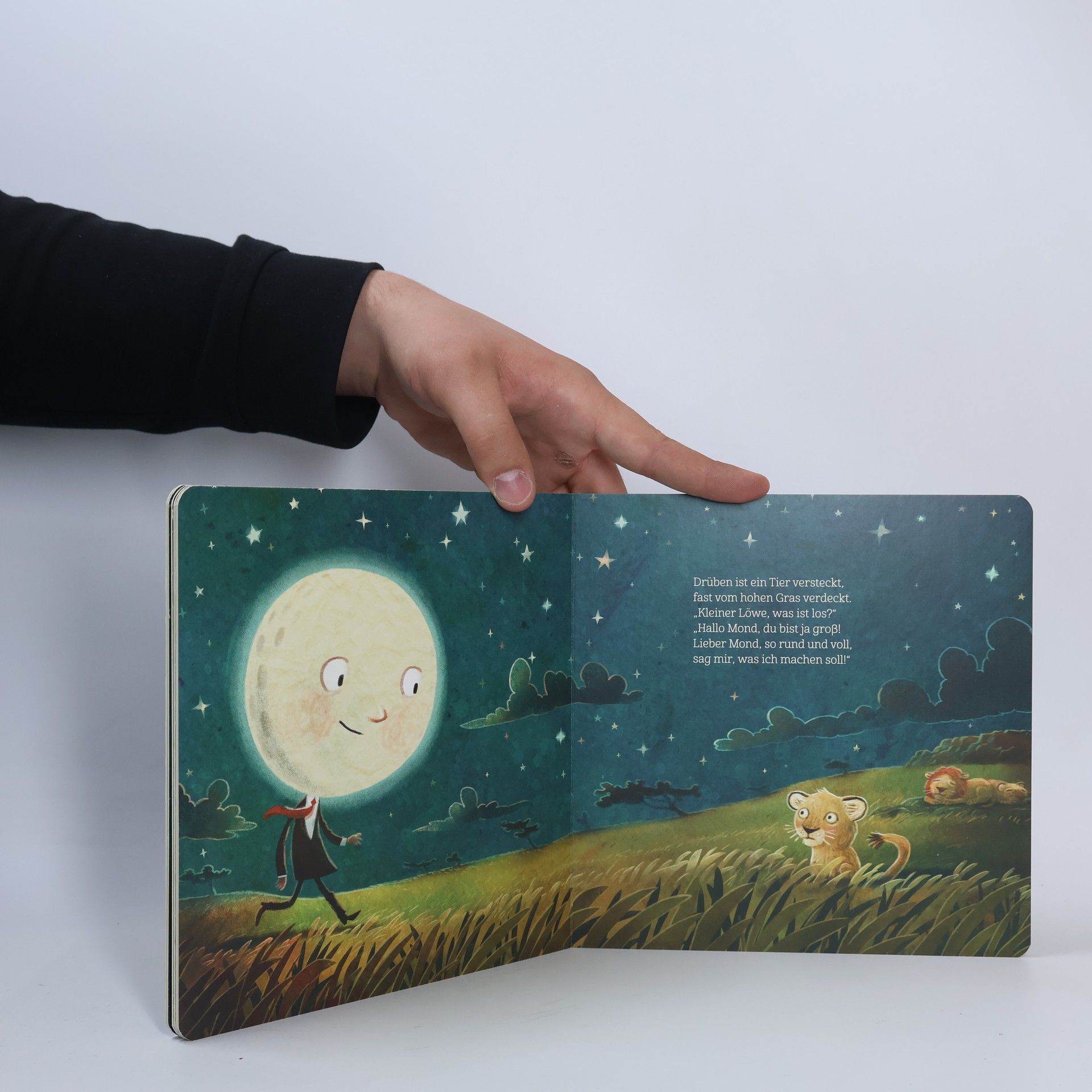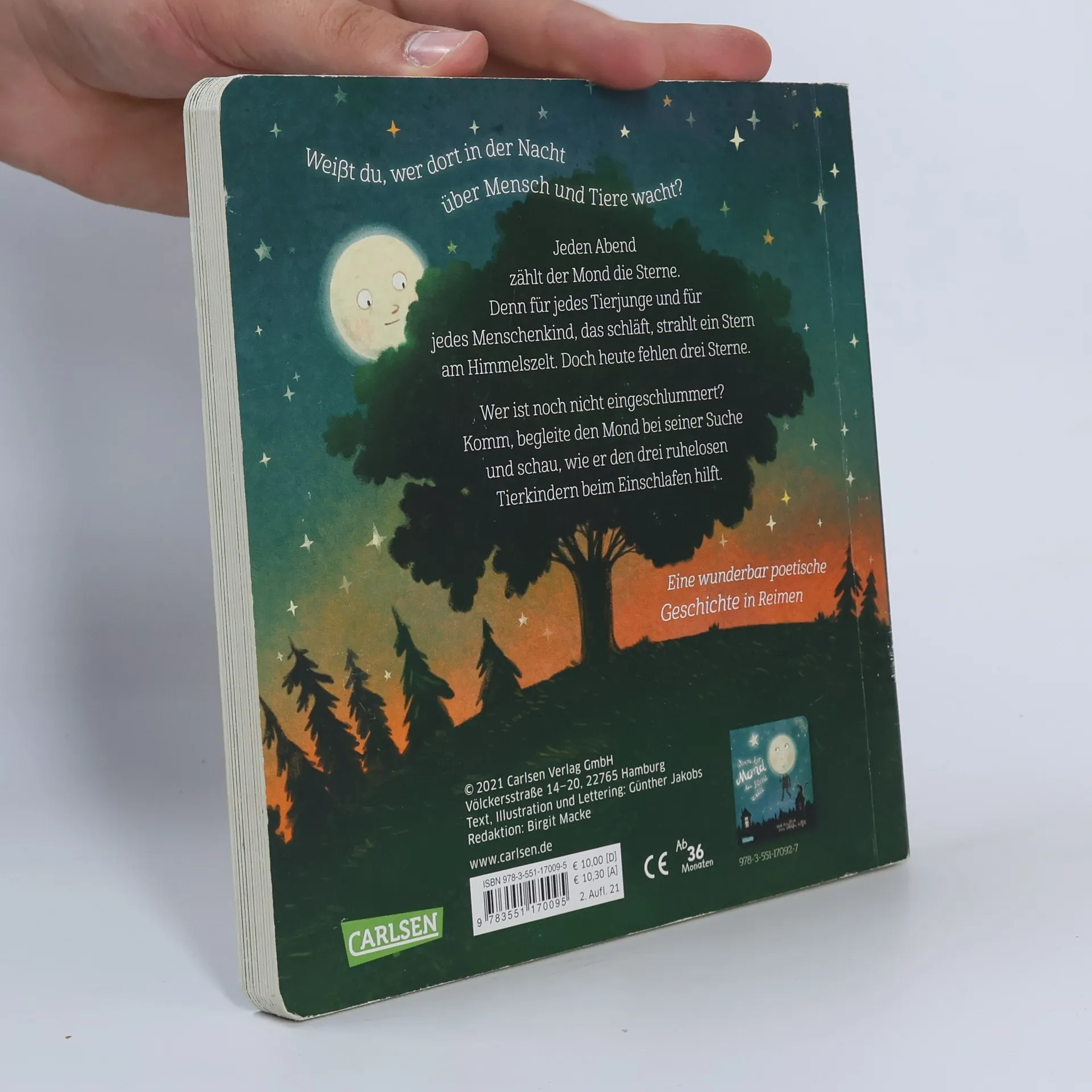 Jeden Abend zählt der Mond die Sterne. Denn für jedes Tierjunge und für jedes Menschenkind, das schläft, strahlt ein Stern am Himmelszelt. Doch heute fehlen drei Sterne. Wer ist noch nicht eingeschlummert? Hier begleiten Kinder den Mond bei seiner Suche nach den drei ruhelosen Tierkindern und erleben mit, wie er jedem auf eine andere Art beim Einschlafen hilft. Nach dem Erfolgstitel »Wenn der Mond die Sterne zählt« das zweite Buch von Günther Jakobs rund um den vertrauensvollen, hilfreichen und liebevollen Mondmann. Ein atmosphärisches Gutenachtbuch in Reimen - so warmherzig, stärkend und beruhigend, dass auch die kleinen Zuhörer*innen und Betrachter*innen leichter in den Schlaf finden können. Das ist Poesie, die Kinder spüren.