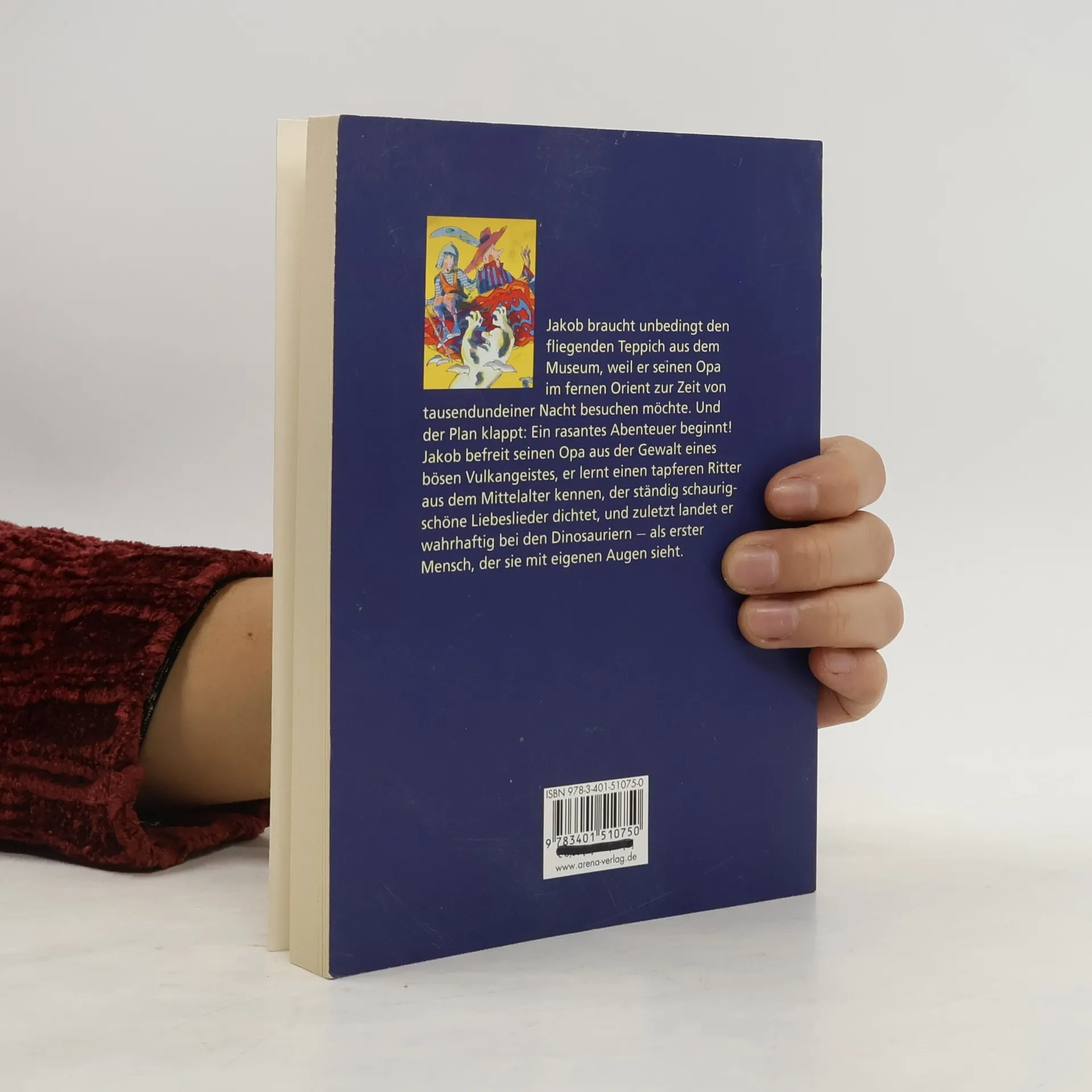 Jakob braucht unbedingt den fliegenden Teppich aus dem Museum, weil er seinen Opa im fernen Orient zur Zeit von tausendundeiner Nacht besuchen möchte. Und der Plan klappt: Ein rasantes Abenteuer beginnt! Jakob befreit seinen Opa aus der Gewalt eines bösen Vulkangeistes, er lernt einen tapferen Ritter aus dem Mittelalter kennen, der ständig schaurig-schöne Liebeslieder dichtet, und zuletzt landet er wahrhaftig bei den Dinosauriern - als erster Mensch, der sie mit eigenen Augen sieht...