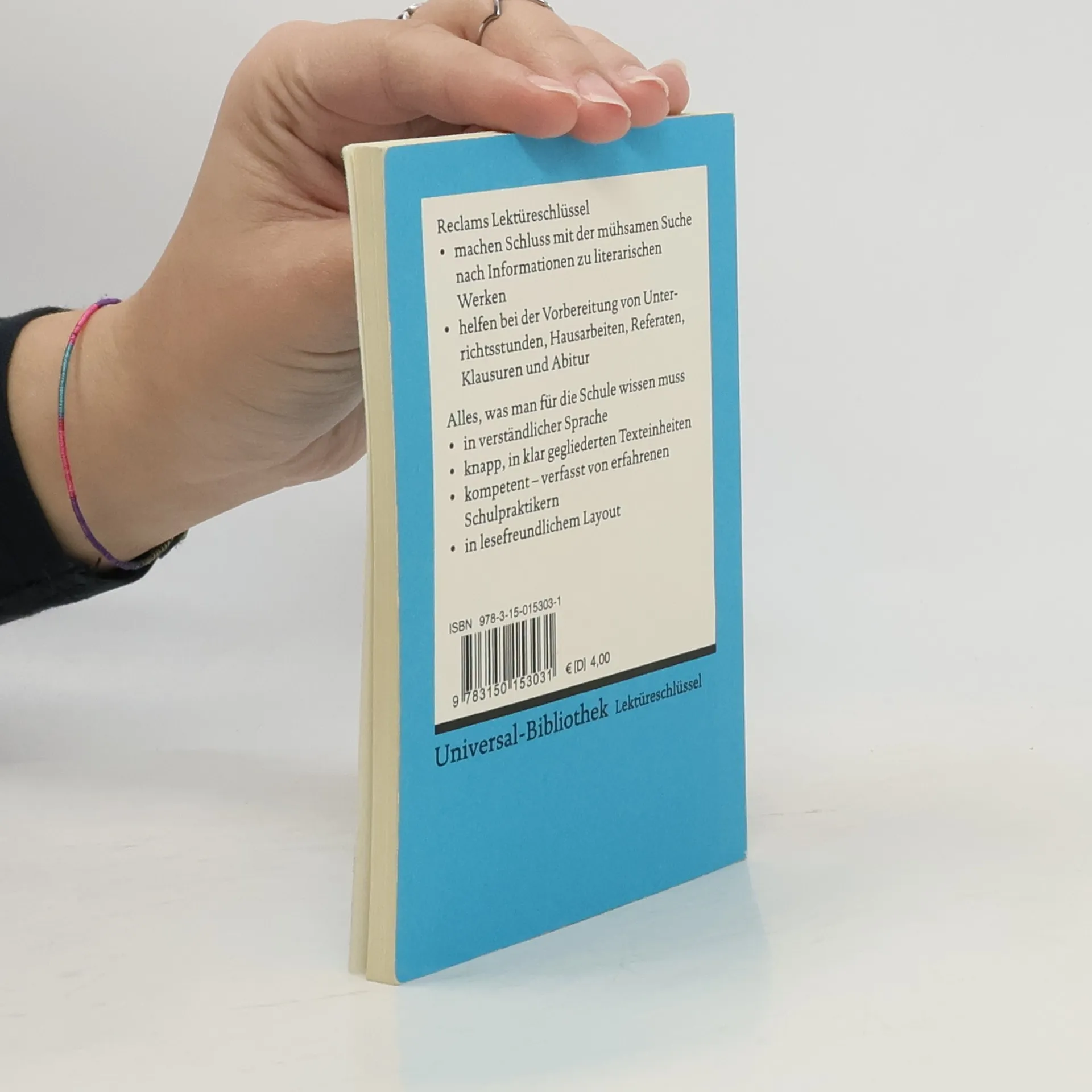 Lektüreschlüssel für Schüler erschließen einzelne literarische Werke. Um eine Interpretation als Zentrum gruppieren sich 10 wichtige Verständniszugänge: * Erstinformation zum Werk * Inhaltsangabe * Personen (Konstellationen) * Werk-Aufbau (Strukturskizze) * Wortkommentar * Interpretation * Autor und Zeit * Rezeption * „Checkliste“ zur Verständniskontrolle * Lektüretipps mit Filmempfehlungen * Raum für Notizen