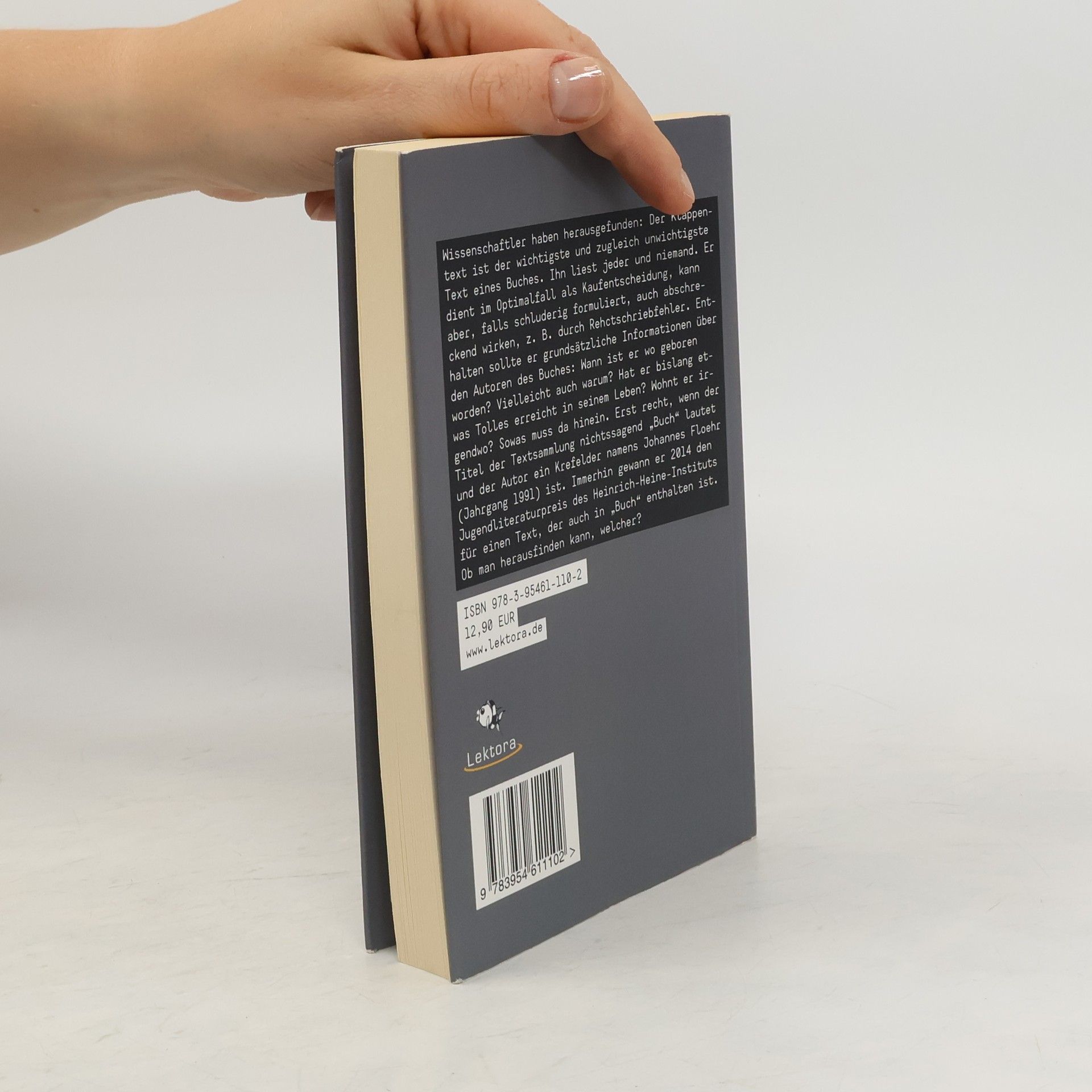 Wissenschaftler haben herausgefunden: Der Klappentext ist derwichtigste und zugleich unwichtigste Text eines Buches. Ihn liest jeder und niemand. Er dient im Optimalfall als Kaufentscheidung, kann aber, falls schluderig formuliert, auch abschreckend wirken, z. B. durch Rehctschriebfehler. Enthalten sollte er grundsätzliche Informationen über den Autoren des Buches: Wann ist er wo geboren worden, vielleicht auch warum? Hat er bislang etwas Tolles erreicht in seinem Leben? Wohnt er irgendwo? Sowas muss da hinein. Erst recht, wenn der Titel der Textsammlung nichtssagend »Buch« lautet und der Autor ein Krefelder namens Johannes Floehr ( Jahrgang 1991) ist. Immerhin gewann er 2014 den Jugendliteraturpreis des Heinrich-Heine-Instituts für einen Text, der auch in »Buch« enthalten ist. Ob man herausfinden kann, welcher?