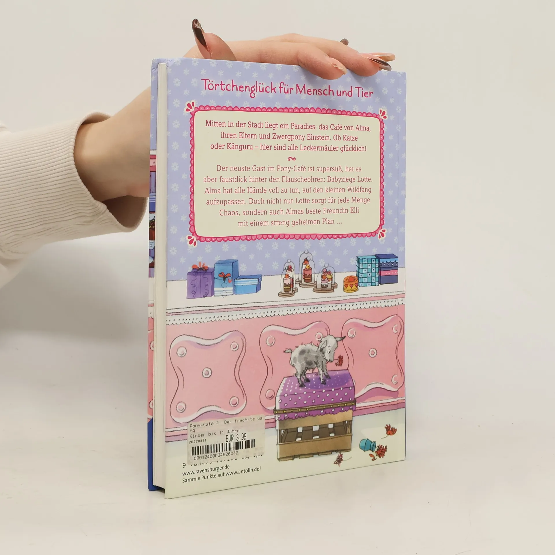 Ein neuer Gast sorgt im Pony-Café für mächtig Wirbel: die freche Babyziege Lotte. Alma hat alle Hände voll zu tun, auf den wilden Winzling aufzupassen. Doch Lotte ist nicht die Einzige, die alles auf den Kopf stellt. Almas beste Freundin Elli hat nämlich einen geheimen Verkuppelplan geschmiedet und löst damit eine wahre Gefühlslawine aus ... Alma, ihre Eltern und Zwergpony Einstein gründen das tollste Café der Welt: ein Kuchenparadies für Mensch und Tier. Naschkatzen, Plappermäuler und schüchterne Kaninchen – bei ihnen sind alle herzlich willkommen und erleben die süßesten Abenteuer Weitere Titel der Reihe „Das Pony-Café“: Band 1: Schokotörtchen zum Frühstück Band 2: Chili, Schote und jede Menge Chaos Band 3: Ein Schnabel voll Glück Band 4: Der frechste Gast der Welt Band 5: Eine Fee im Kuchenparadies Band 6: Klassenfahrt auf den Bauernhof