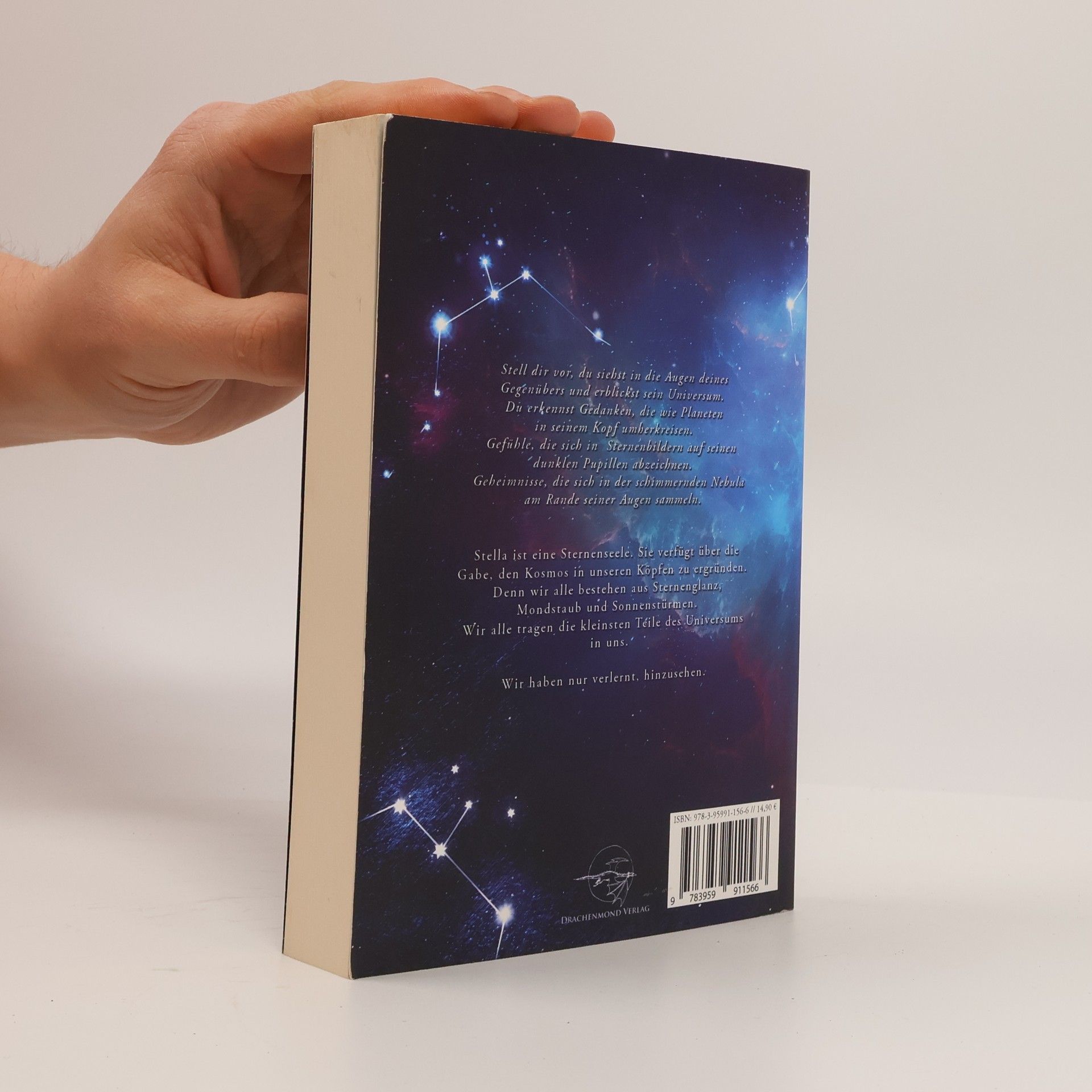 Stell dir vor, du siehst in die Augen deines Gegenübers und erblickst sein Universum. Du erkennst Gedanken, die wie Planeten in seinem Kopf umherkreisen. Gefühle, die sich in Sternenbildern auf seinen dunklen Pupillen abzeichnen. Geheimnisse, die sich in der schimmernden Nebula am Rande seiner Augen sammeln. Stella ist eine Sternenseele. Sie verfügt über die Gabe, den Kosmos in unseren Köpfen zu ergründen. Denn wir alle bestehen aus Sternenglanz, Mondstaub und Sonnenstürmen. Wir alle tragen die kleinsten Teile des Universums in uns. Wir haben nur verlernt, hinzusehen.