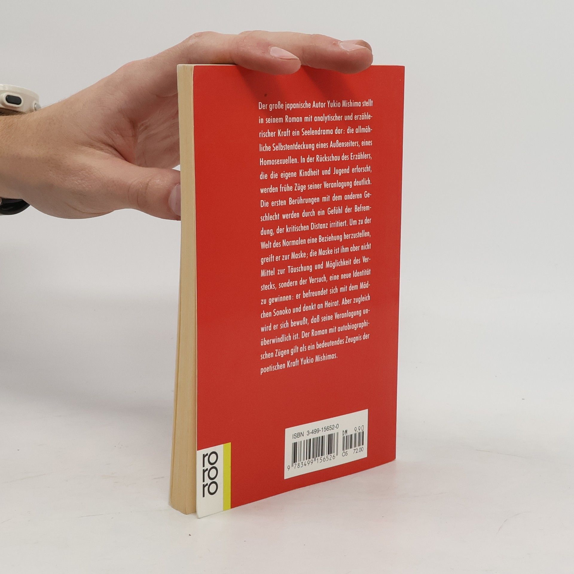 Der große japanische Autor Yukio Mishima stellt in seinem Roman mit analytischer und erzählerischer Kraft ein Seelendrama dar: die allmähliche Selbstentdeckung eines Außenseiters, eines Homosexuellen. In der Rückschau des Erzählers, die die eigene Kindheit und Jugend erforscht, werden frühe Züge seiner Veranlagung deutlich. Die ersten berührungen mit dem anderen Geschlecht werden durch ein Gefühl der Befremdung, der kritischen Distanz irritiert. Um zu der Welt des Normalen eine Beziehung herzustellen, greift er zur Maske. Die Maske ist ihm aber nicht Mittel zur Täuschung und Möglichkeit des Verstecks, sondern der Versuch, eine neue Identität zu gewinnen: er befreundet sich mit dem Mädchen Sonoko und denkt an Heirat. Aber zugleich wird er sich bewußt, daß seine Veranlagung unüberwindlich ist. Der Roman mit autobiographischen Zügen gilt als ein bedeutendes Zeugnis der poetischen Kraft Yukio Mishimas.