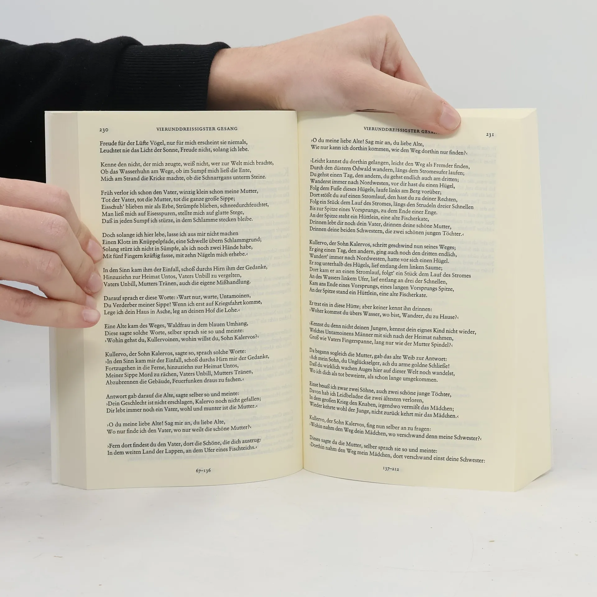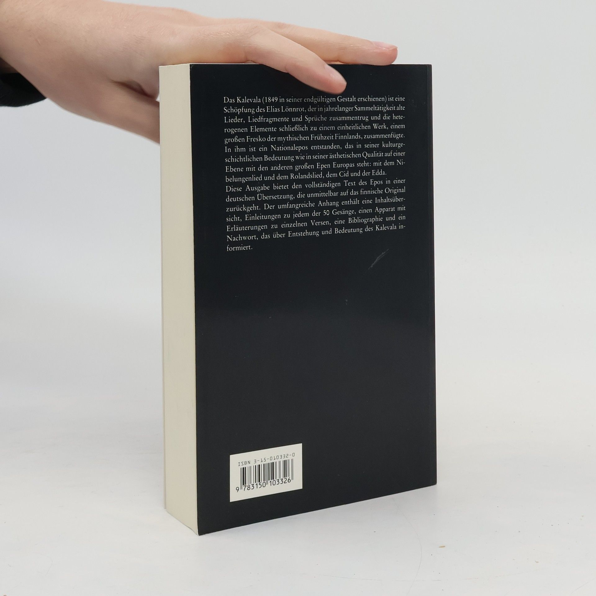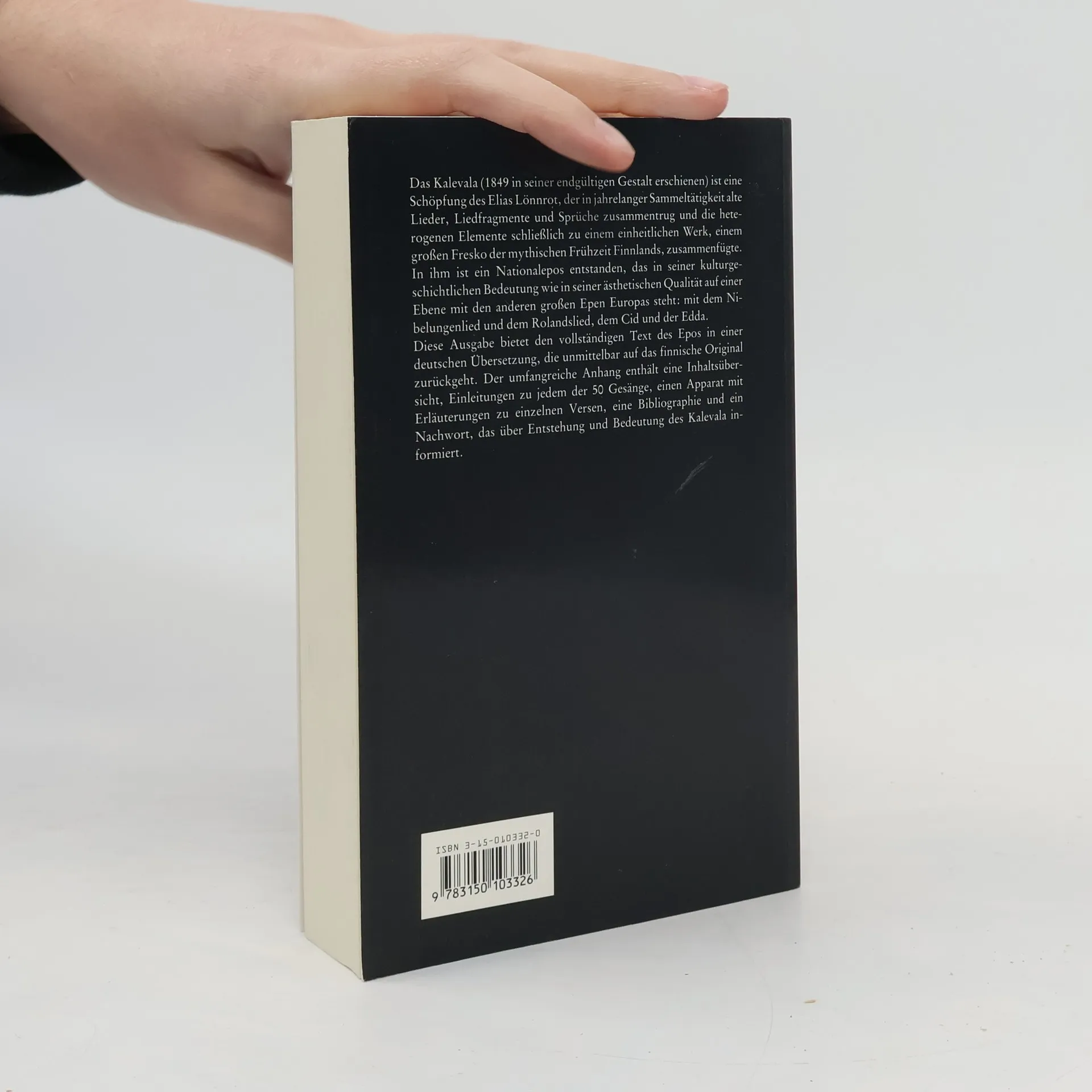 Das Kalevala (1849 in seiner endgültigen Gestalt erschienen) ist eine Schöpfung des Elias Lönnrot, der in jahrelanger Sammeltätigkeit alte Lieder, Liedfragmente und Sprüche zusammentrug und die heterogenen Elemente schliesslich zu einem einheitlichen Werk, einem grossen Fresko der mythischen Frühzeit Finnlands, zusammenfügte. In ihm ist ein Nationalepos entstanden, das in seiner kulturgeschichtlichen Bedeutung wie in seiner ästhetischen Qualität auf einer Ebene mit den anderen grossen Epen Europas steht: mit dem Nibelungenlied und dem Rolandslied, dem Cid und der Edda